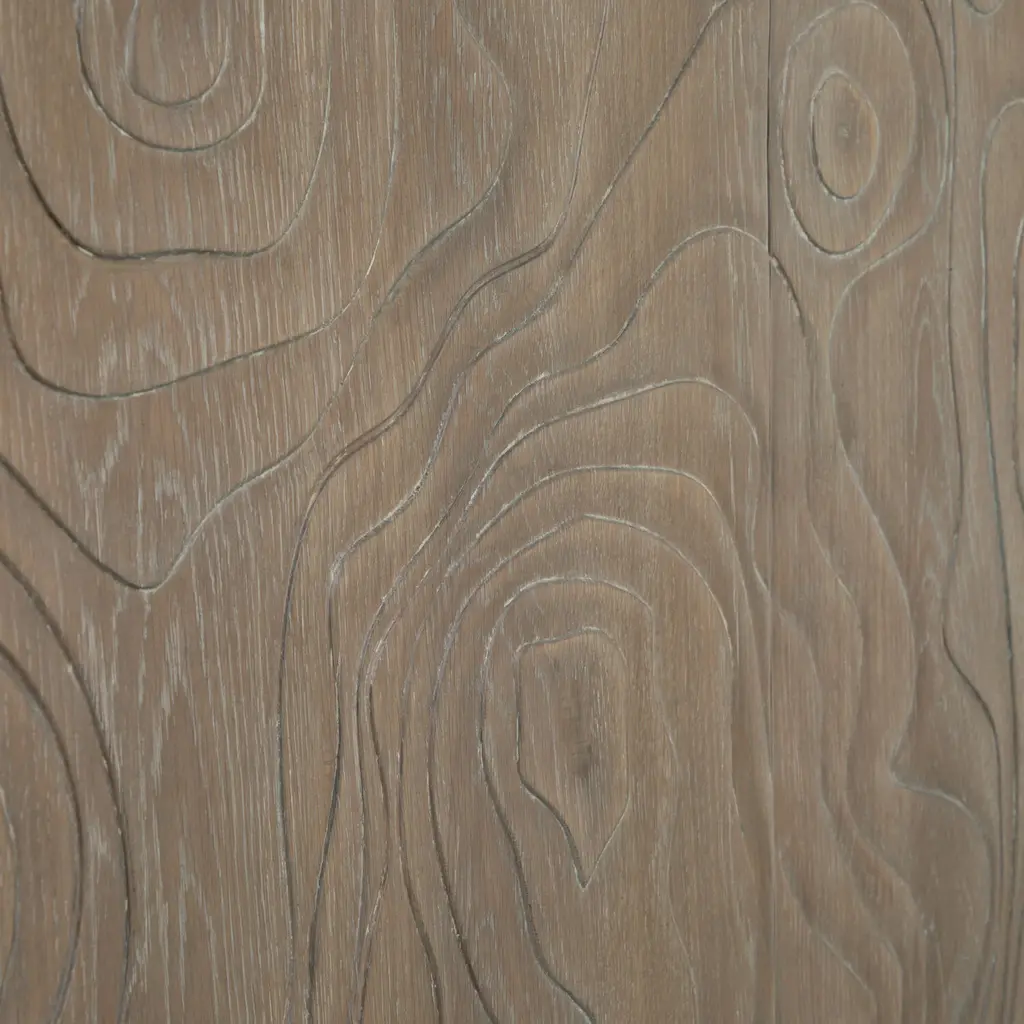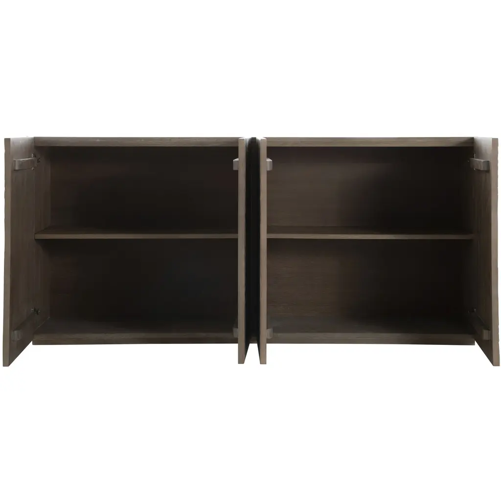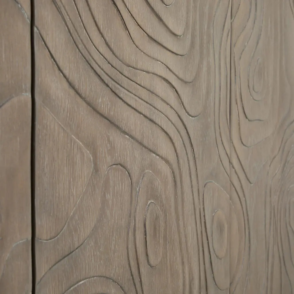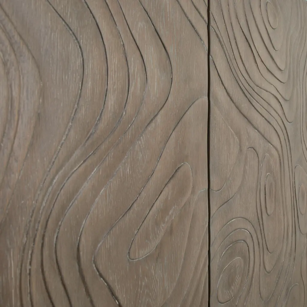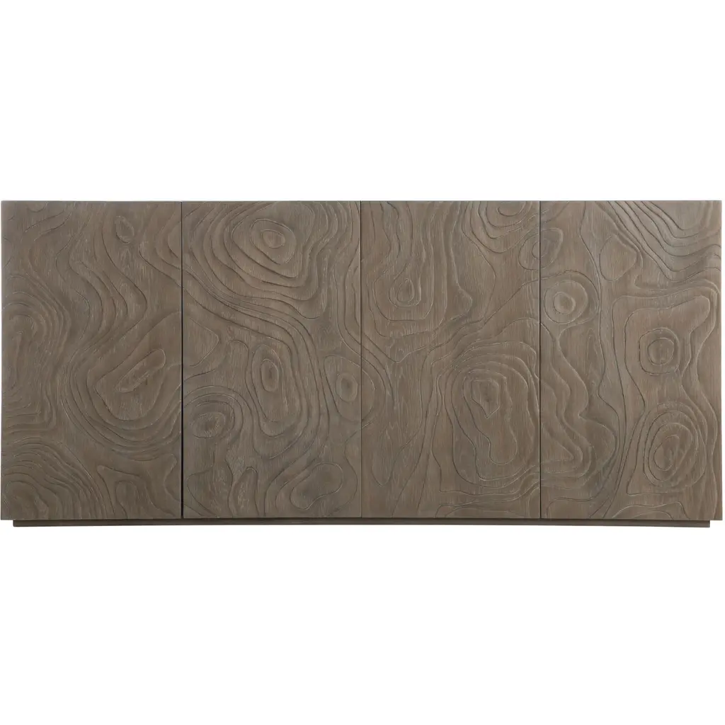 The Bingham Sideboard features a beautiful cerused natural finish for a understated yet intriguing credenza. Inspired by antique topographical maps, the sideboard features intricate wood carvings of ascending heights in an organic pattern, creating a sense of movement on the doors. Crafted from oak and oak veneer, it includes two spacious shelves behind the 4 doors, offering both fixed and adjustable options for versatile storage solutions. Perfect for a dining room, living room, or hallway, the Bingham Sideboard is a stylish and functional piece that enhances any decor with its unique aesthetic and practical design.