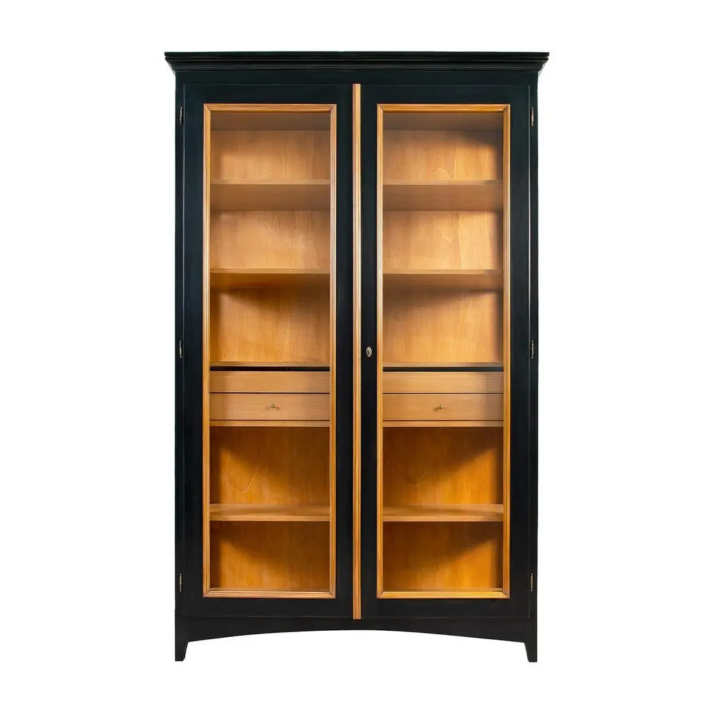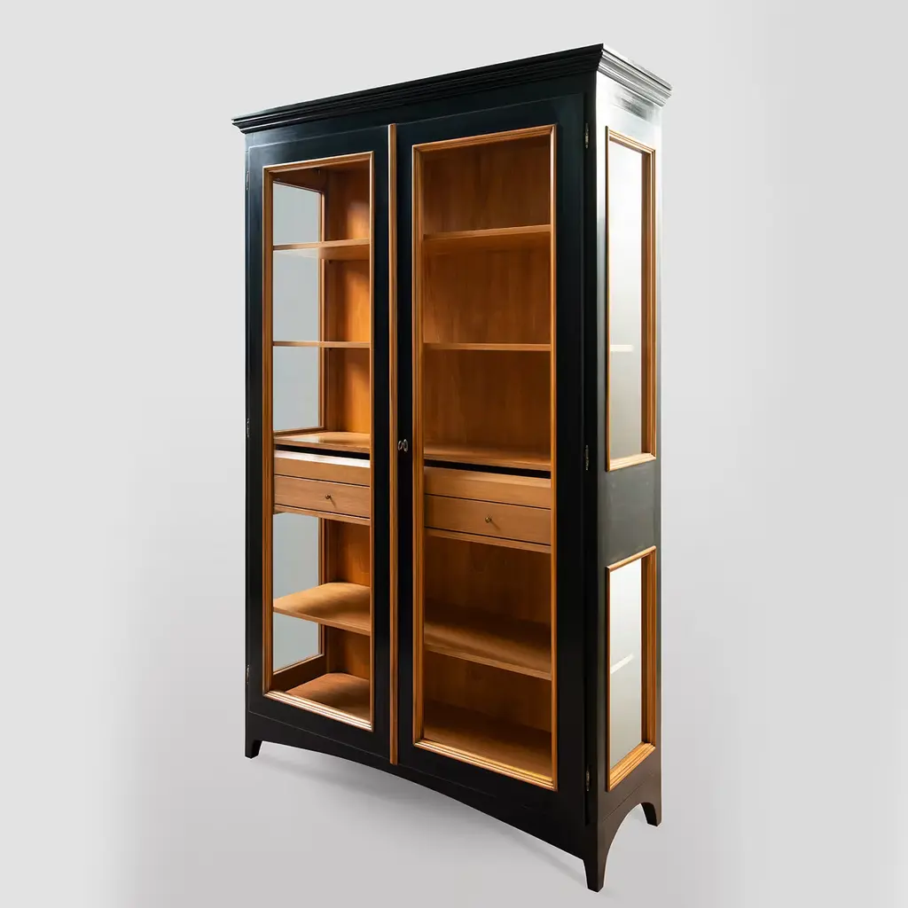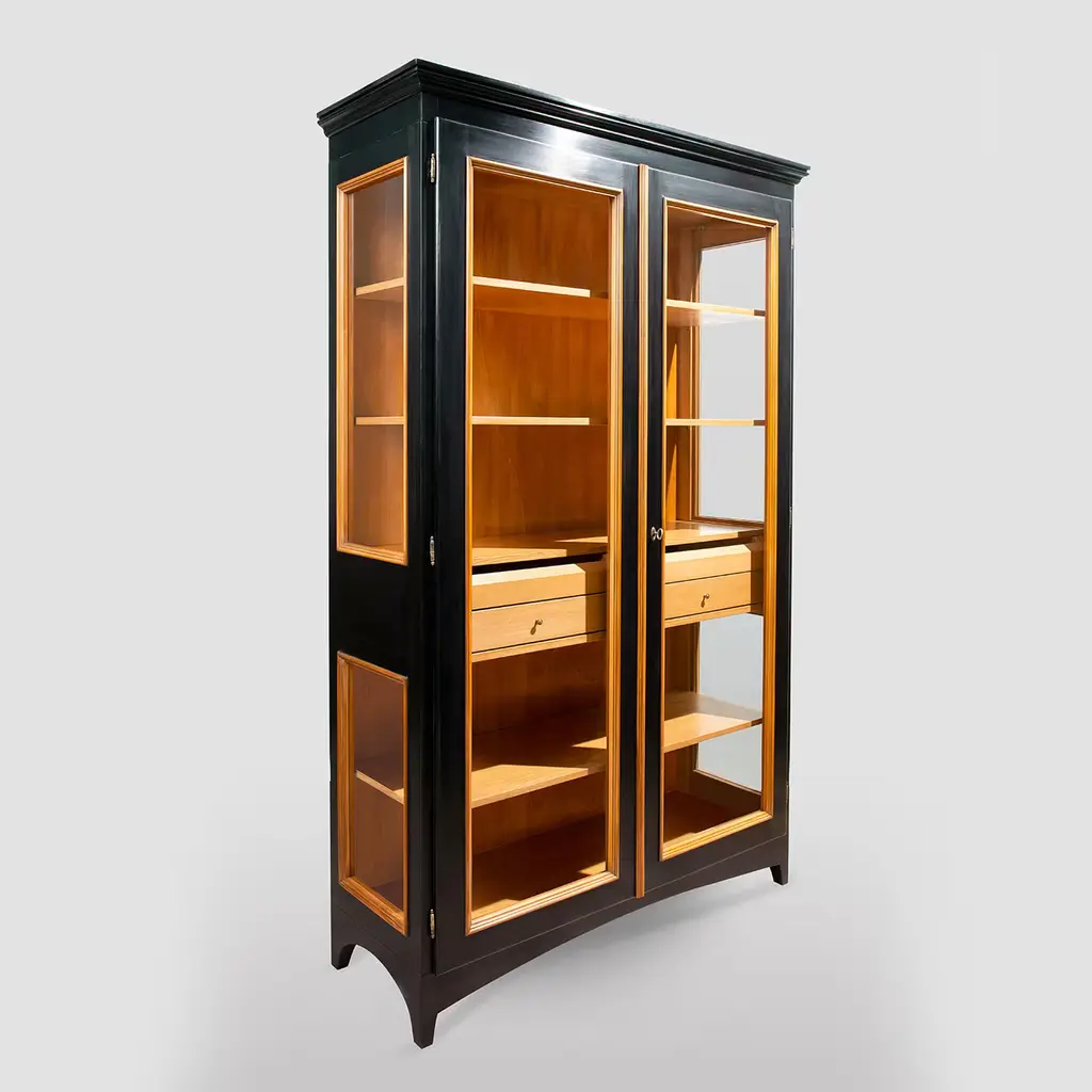 Merging contemporary aesthetic and Italian cabinet-making tradition, this striking display cabinet delivers a masterclass in modern Italian furniture design. The tall Toulipier wood frame features two front glass doors and lateral glass panels to allow full view of the treasured collectibles to display on the three wooden shelves and central, four-drawer section. The contrast between the natural finish on the inside and the deep black exterior adds an additional element of modern style. Assembly required, contact the Concierge for customization options.