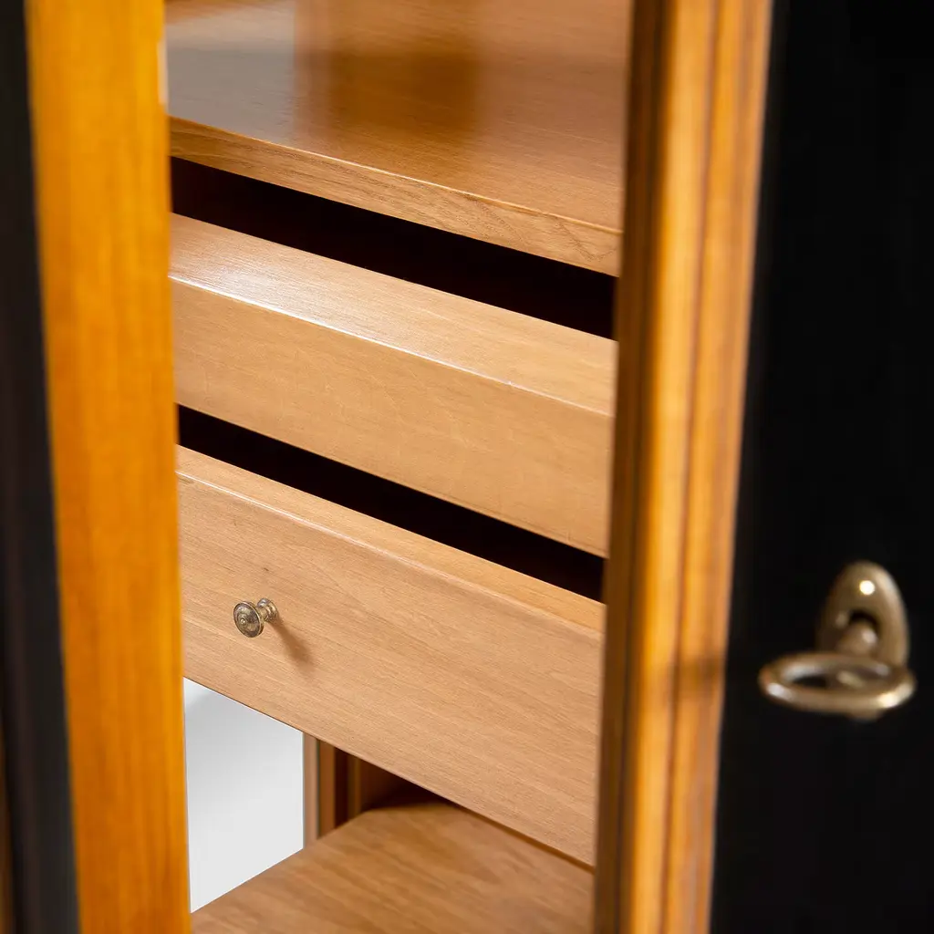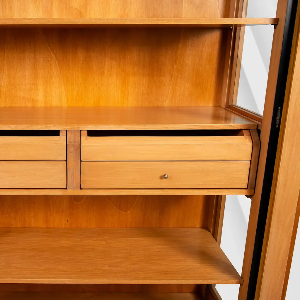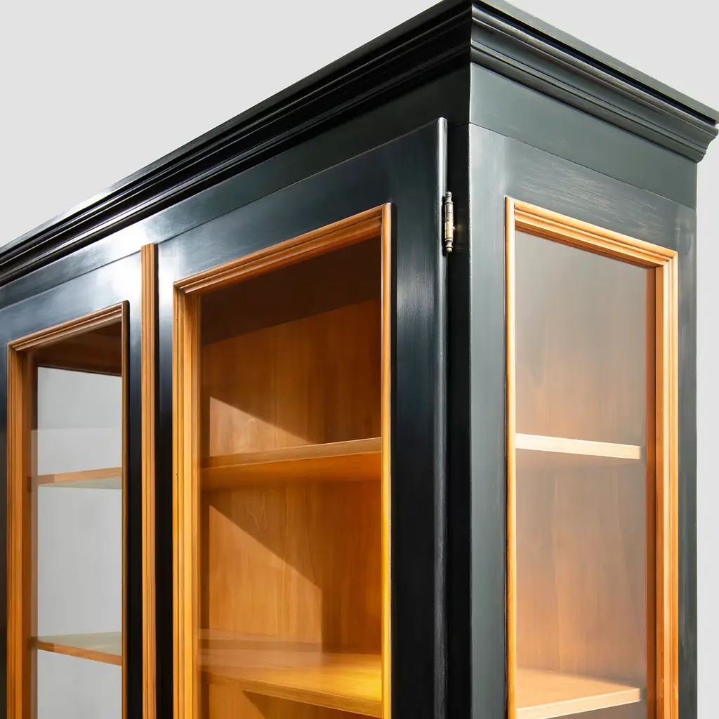 Merging contemporary aesthetic and Italian cabinet-making tradition, this striking display cabinet delivers a masterclass in modern Italian furniture design. The tall Toulipier wood frame features two front glass doors and lateral glass panels to allow full view of the treasured collectibles to display on the three wooden shelves and central, four-drawer section. The contrast between the natural finish on the inside and the deep black exterior adds an additional element of modern style. Assembly required, contact the Concierge for customization options.