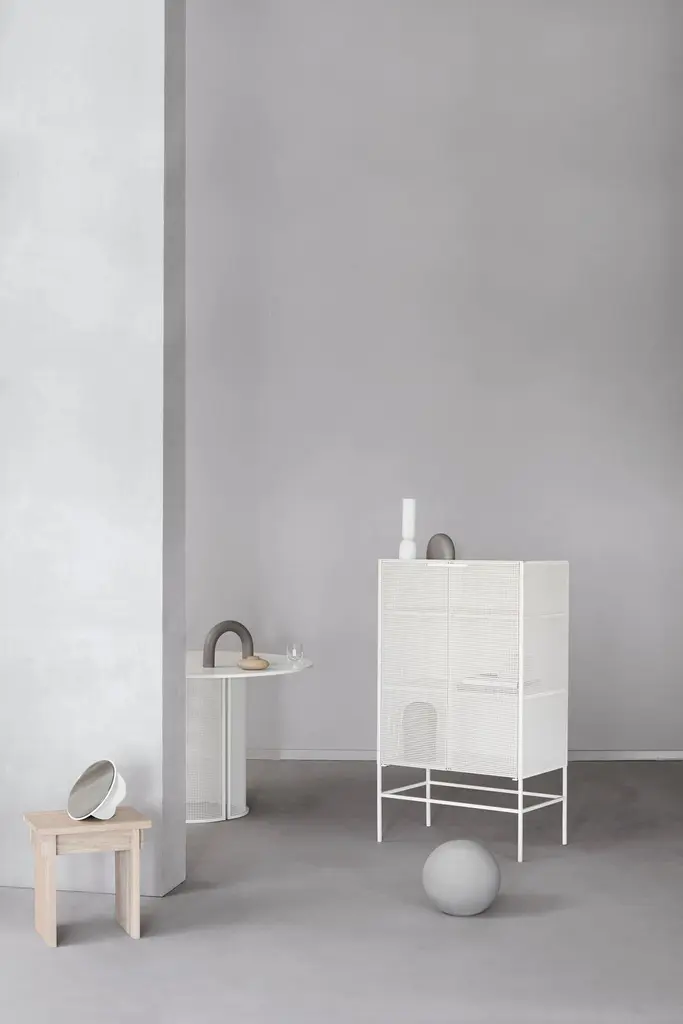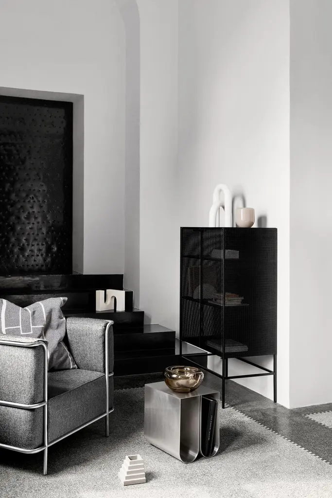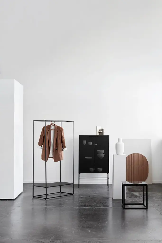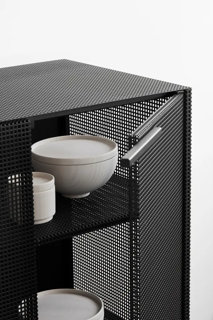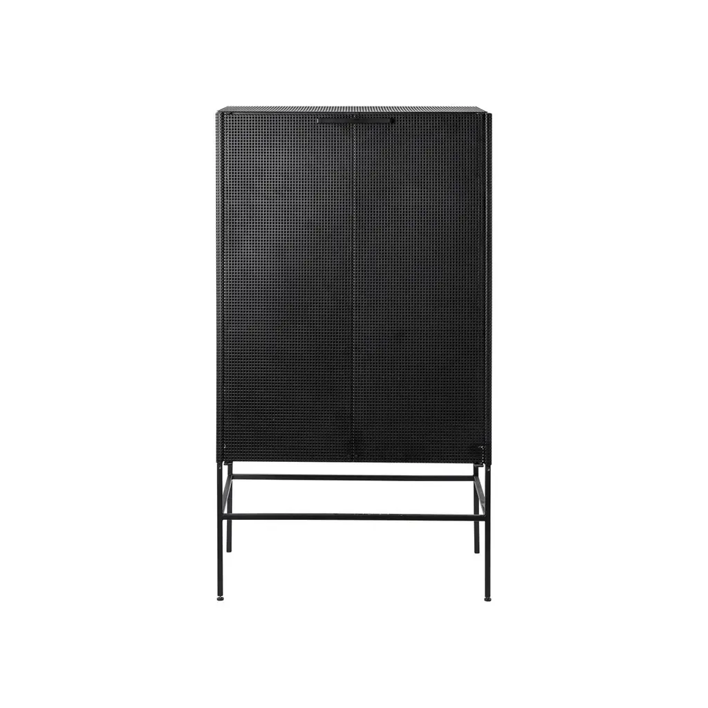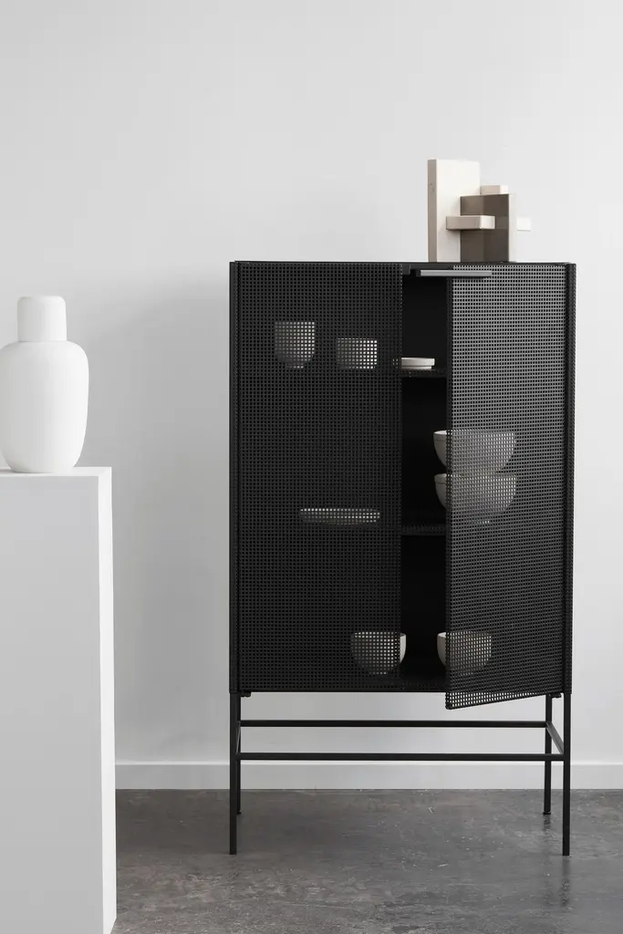Black grid cabinet by Kristina Dam StudioMaterials: Black outdoor powder-coated steelDimensions: 76 x 45 x 131 cmDimensions cannot be customized.Kristina Dam graduated from The Royal Danish School of Fine Arts, architecture and design in Copenhagen. In her designs you will find her great love for architecture and minimalistic graphic lines.Everything originates from Kristina’s passion for design and art. She will find her inspiration when travelling, browsing Pinterest, blogs, Instagram and talking to people.Her first product, a series of limited edition illustrations, quickly became a favorite in Scandinavian design stores, magazines and homes. Today Kristina Dam Studio has developed into a design powerhouse of furniture and accessories. Two collections are launched every year and we collaborate with upcoming as well as established designers.Kristina Dam Studio was founded by graphic designer and architect Kristina Dam in 2012. The initial design idea for the studio was to create industrial designs that had a more art-based approach. The idea of making art and interior design merge, both in furniture, accessories, art prints and illustrationsWe call our design approach for "Sculptural Minimalism". Designs by Kristina Dam Studio are graphic and architectural with a high level of details and excellent craftsmanship. Furniture from Kristina Dam Studio are mostly made from natural materials. We believe that mastering the monochromatic palette enable us to create timeless and enduring designs. Distinct and beautiful, simplicity with an attitude. Honest materialsWe only use honest, genuine, natural and carefully selected materials, and we treat them with respect. The majority of our collection is produced within the European Union. Our love for genuine materials is a part of our Nordic design inheritance, a legacy we take very seriously.Sculptural minimalismThe major lines in the designs are graphic and architectural. A high level of details and pristine craftsmanship are key are well. Kristina Dam Studio furniture pieces are assembled with spigot joints and dowels and produced in natural materials. You’ll find the same love for details in all of your designs.A sculptural approach to designKristina Dam Studio aim to design products with at sculptural approach. Designs that have character, style and a bold expression that will add something extra to your interior. With each collection at least one new sculpture is launched. That sculptural quality and approach is visible in all our designs.