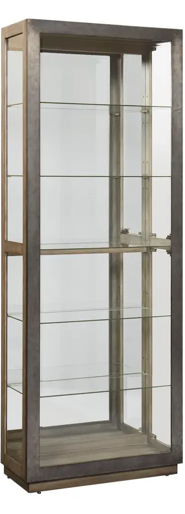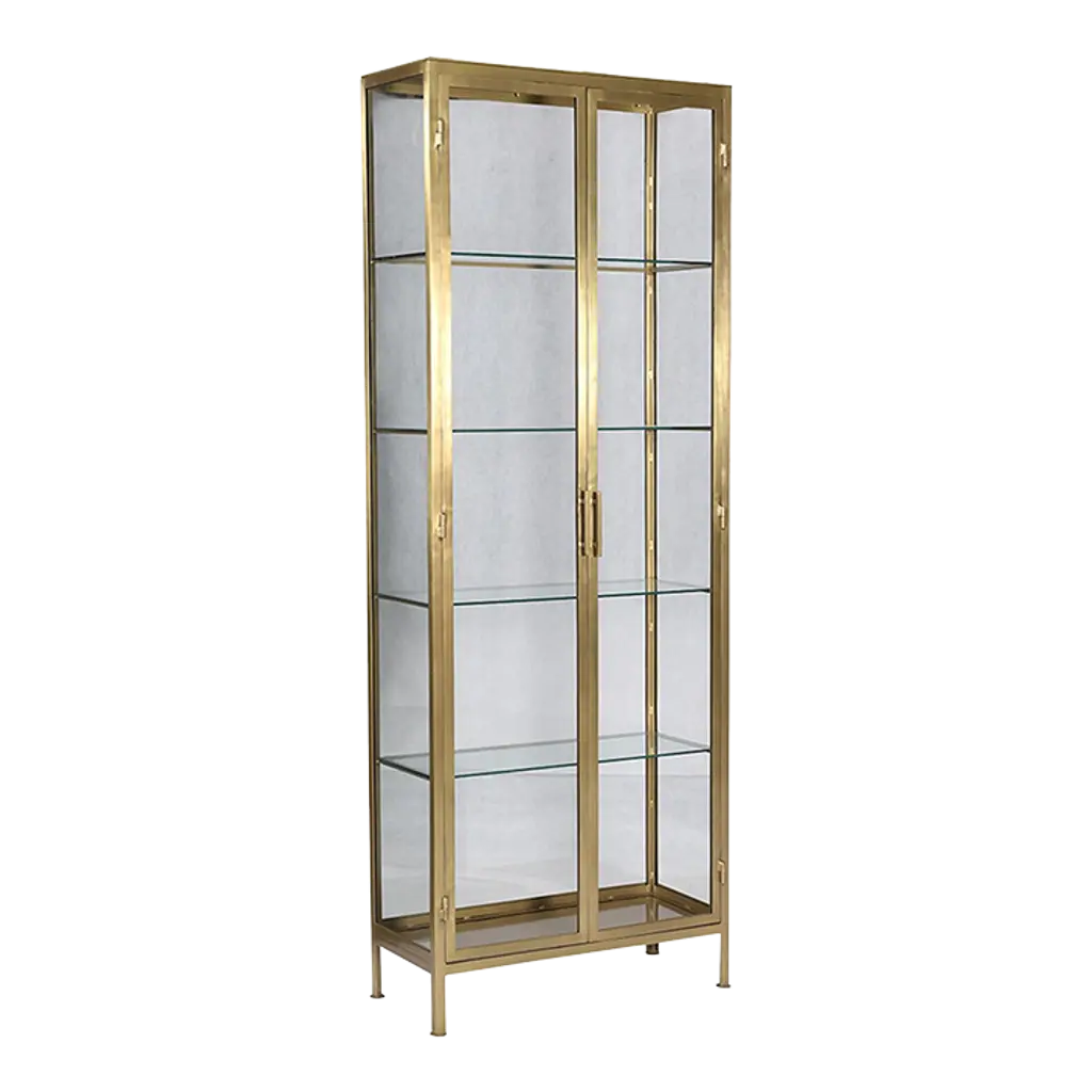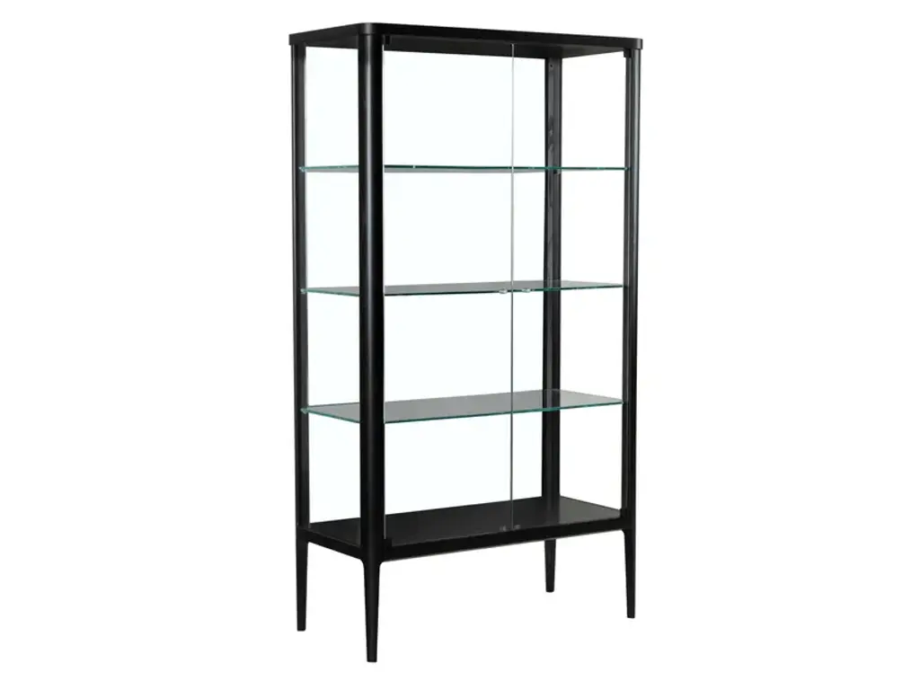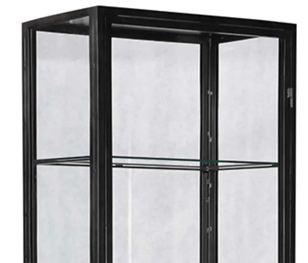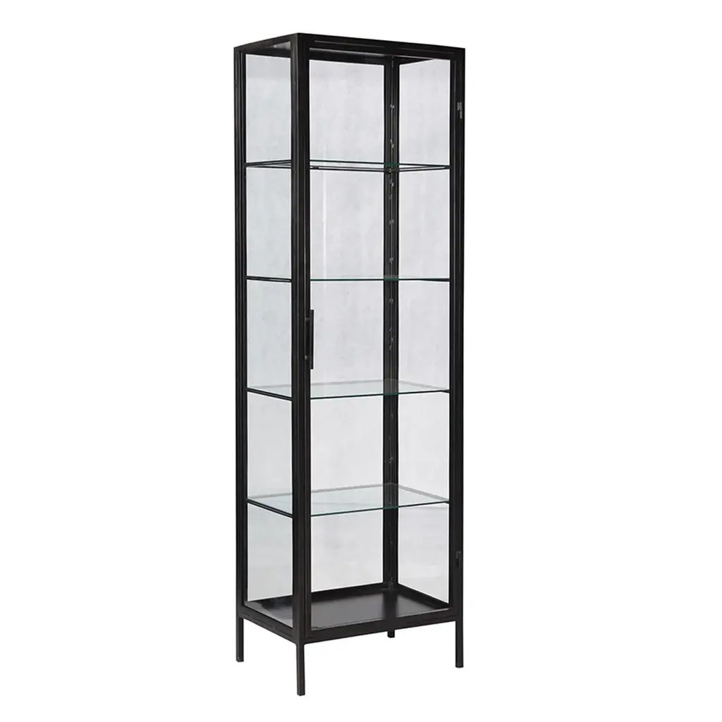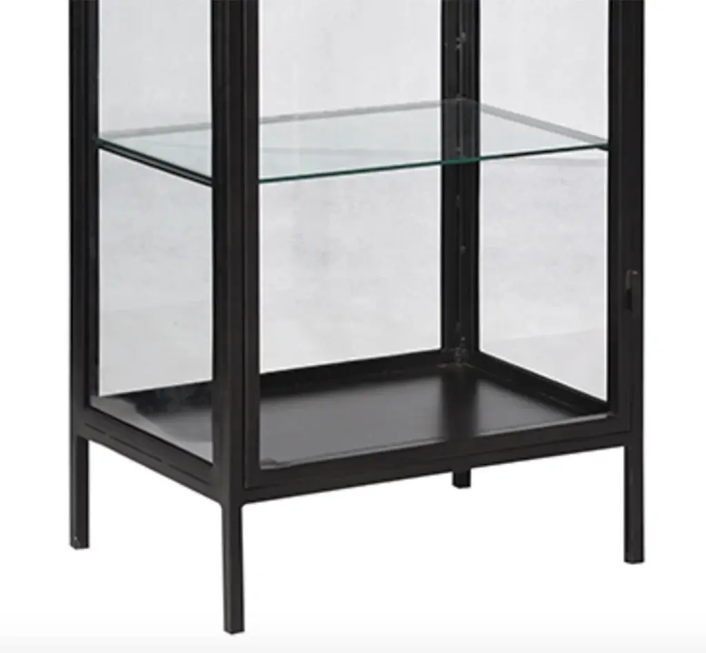 Black gunmetal finish iron frame display cabinet with glass panels and shelves. Modern simple piece with clean lines perfect for a variety of spaces and uses. Each may vary in exact iron finish and natural imperfections. This cabinet weighs approx. 190 lbs.