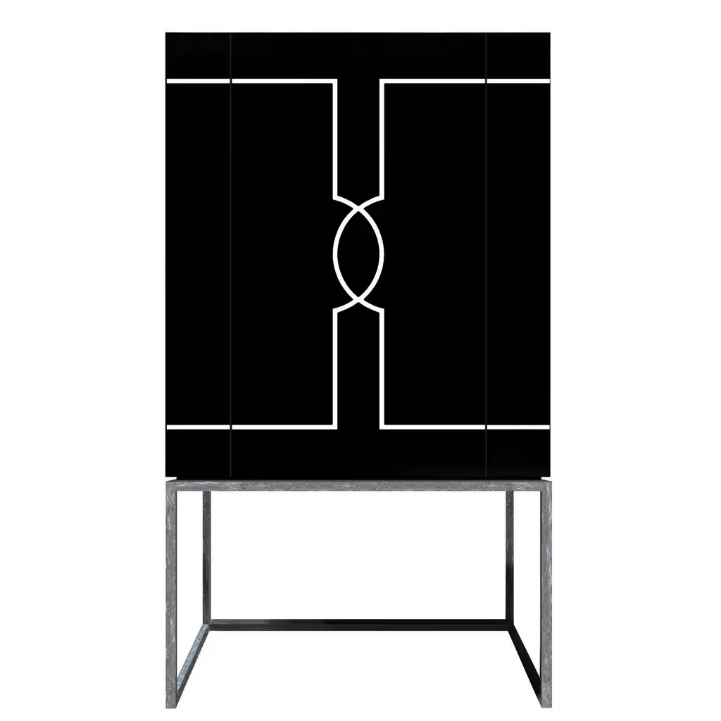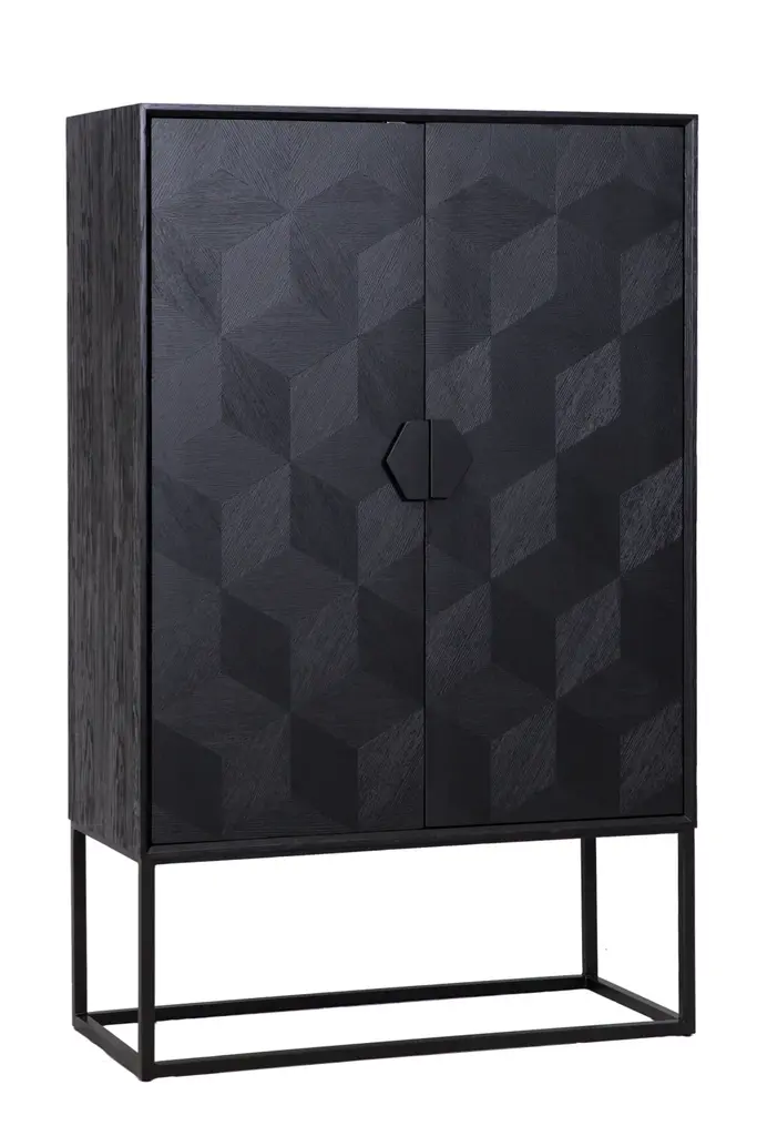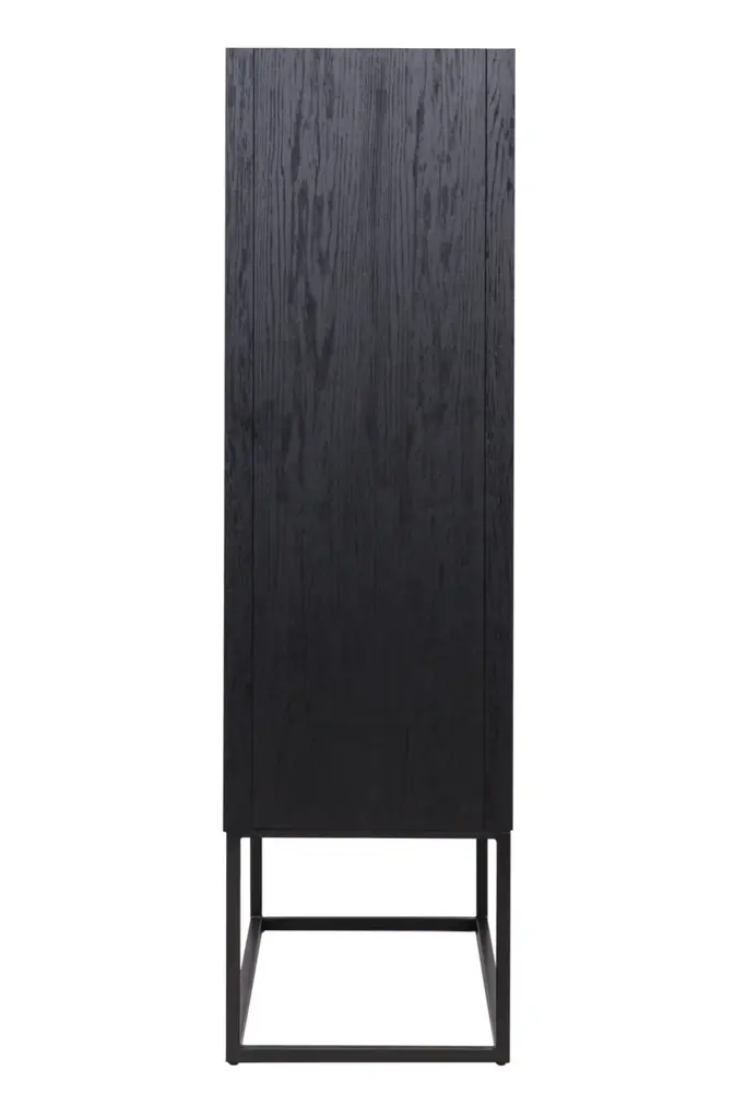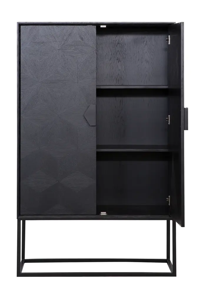Blax cabinet by Richmond Interiors is crafted from black oak wood with subtle geometrical patterns. It features 2 doors covering a wide storage set atop an iron base in black finish.