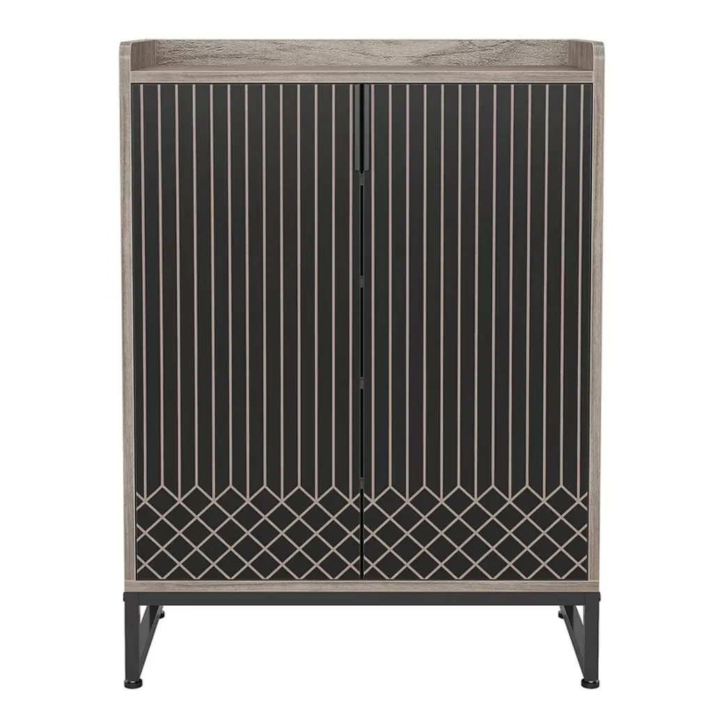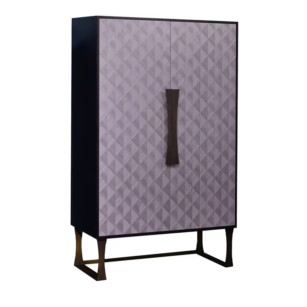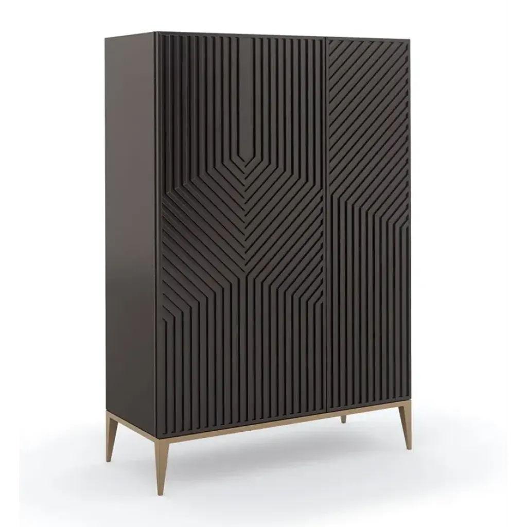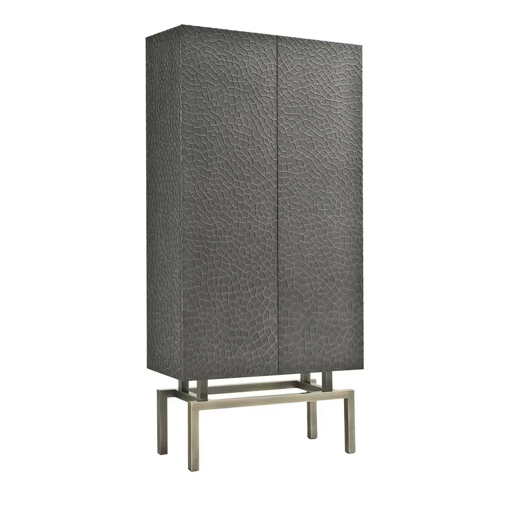 Blax cabinet by Richmond Interiors is crafted from black oak wood with subtle geometrical patterns. It features 2 doors covering a wide storage set atop an iron base in black finish.