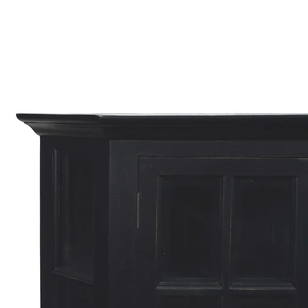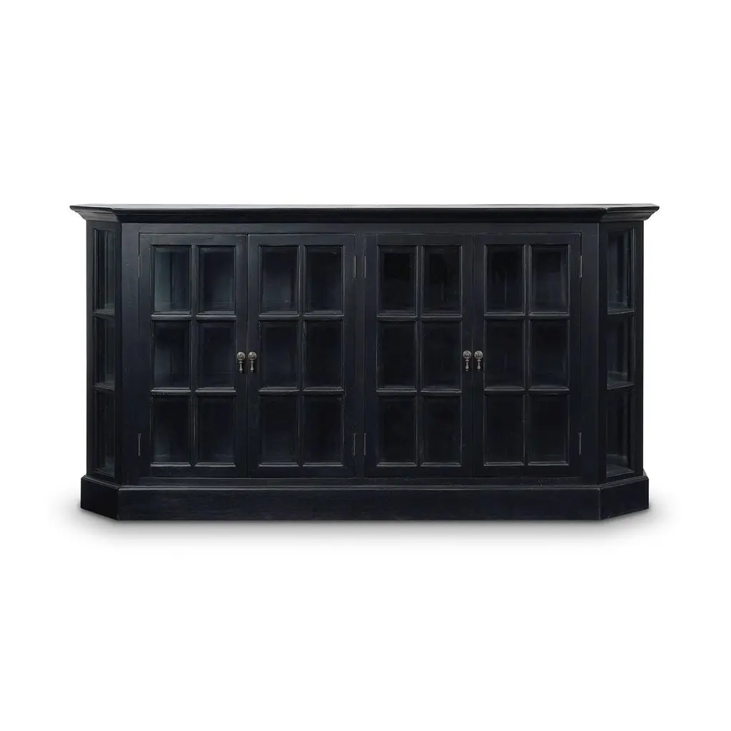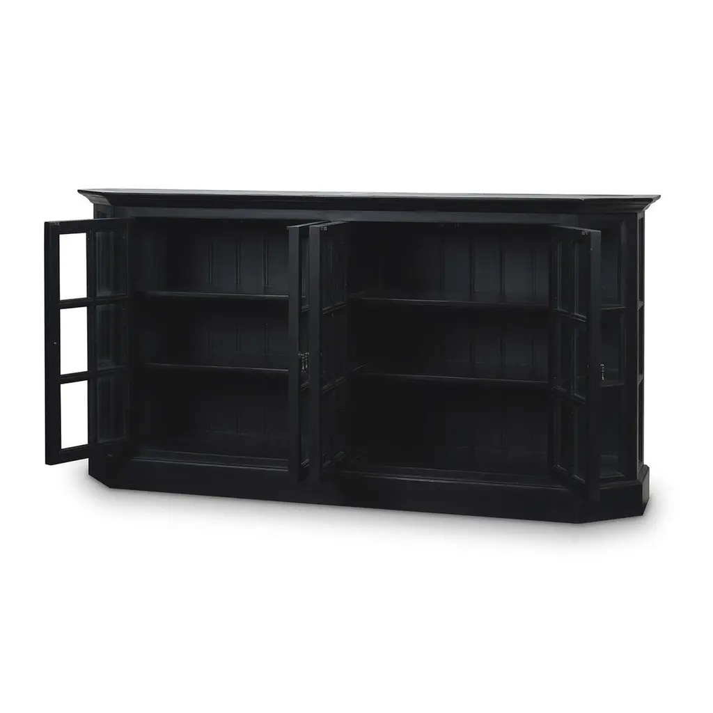 Featuring a batavia black finish to the exterior and interior. Crafted from solid mahogany, this cabinet exudes provincial elegance with its elegant. The canted corners and framed glass doors add a touch of sophistication while allowing a clear view of your cherished items.The spacious interior provides the perfect backdrop for showcasing your favorite collectibles, books, or decorative pieces. Ideal for your living room, dining area, or hallway, this cabinet combines practicality with refined design, making it a captivating addition to any space.Dimensions: 72" W x 16" D x 36" HCustom finish options are also available. Contact us to learn more.