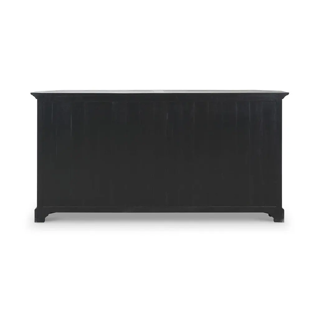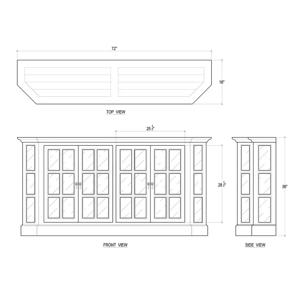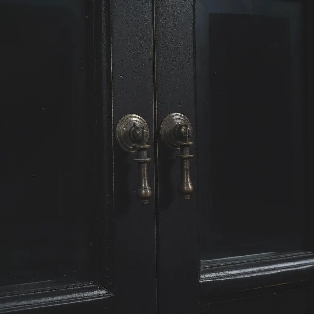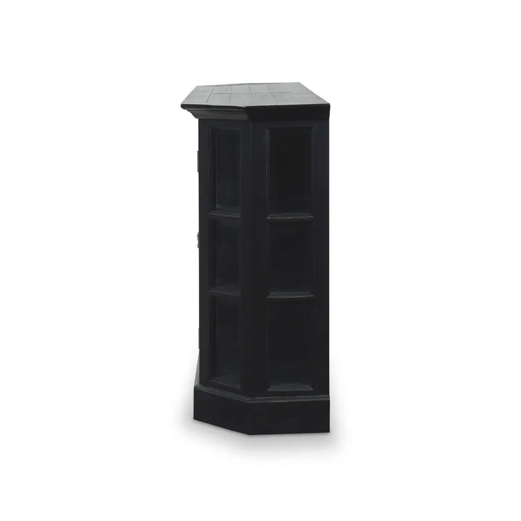 Featuring a batavia black finish to the exterior and interior. Crafted from solid mahogany, this cabinet exudes provincial elegance with its elegant. The canted corners and framed glass doors add a touch of sophistication while allowing a clear view of your cherished items.The spacious interior provides the perfect backdrop for showcasing your favorite collectibles, books, or decorative pieces. Ideal for your living room, dining area, or hallway, this cabinet combines practicality with refined design, making it a captivating addition to any space.Dimensions: 72" W x 16" D x 36" HCustom finish options are also available. Contact us to learn more.
