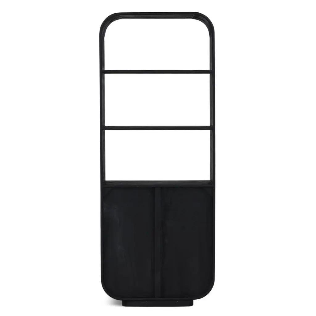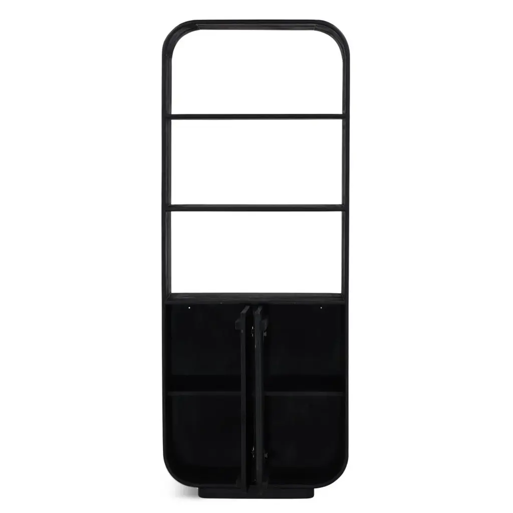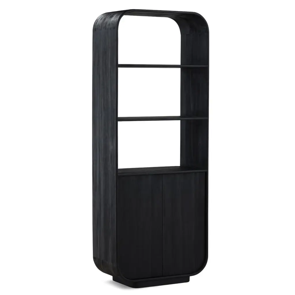 Handsome black stained finish solid wood display shelf / book case. Two doors open to added cabinet storage space below. Rounded edges add to the contemporary minimalist feel. Weighs approx. 95 lbs.