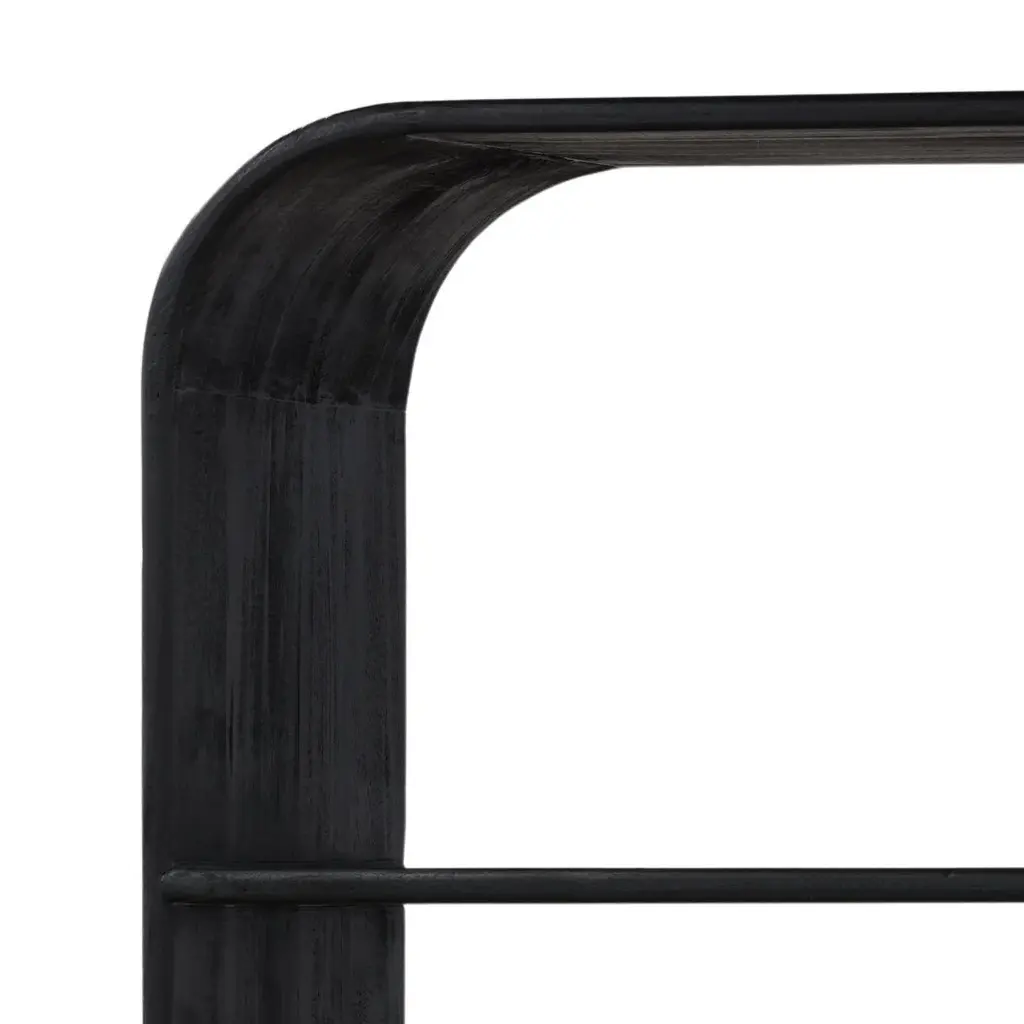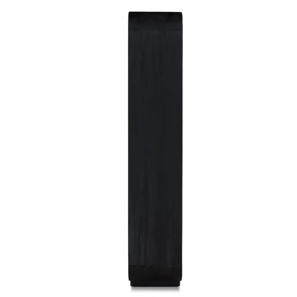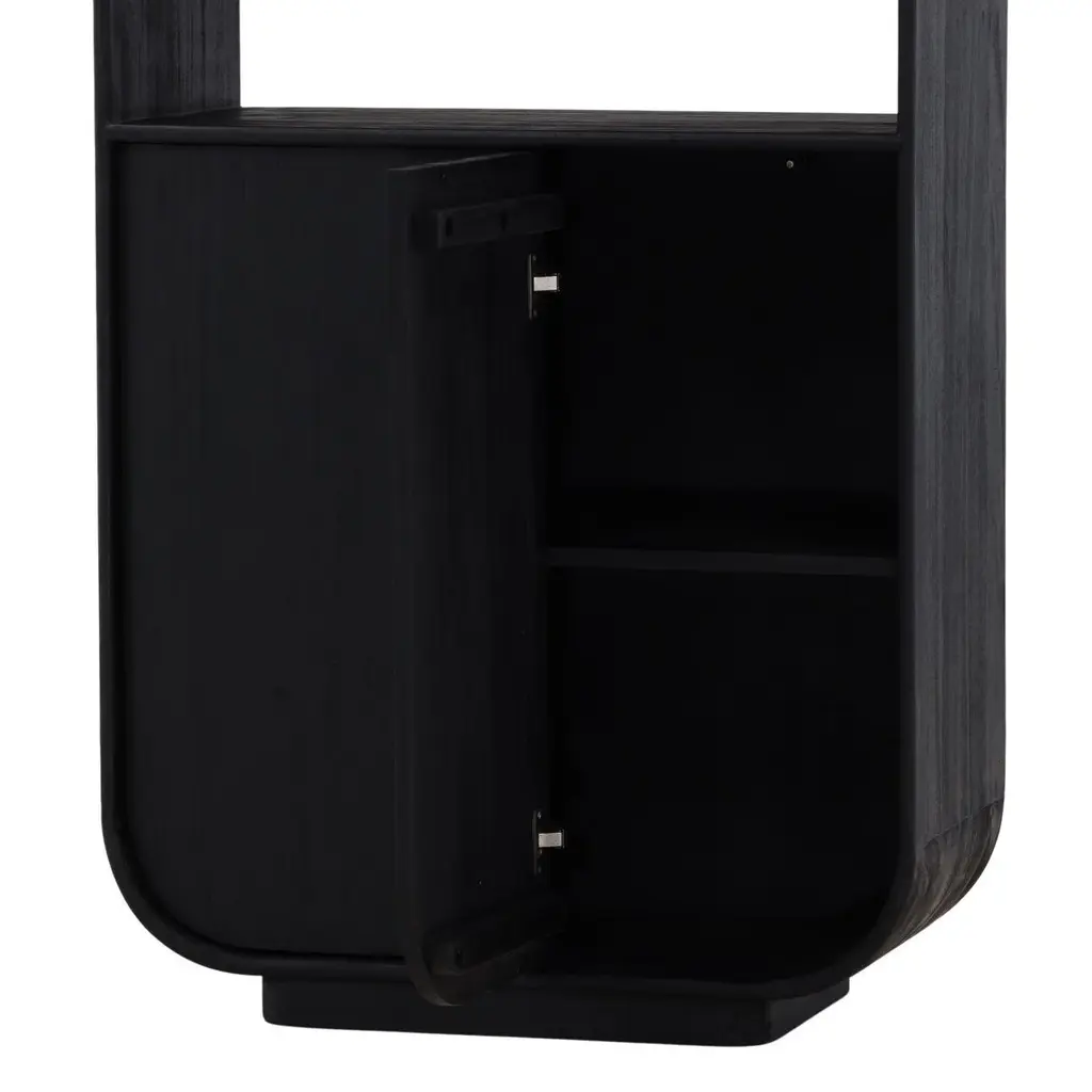 Handsome black stained finish solid wood display shelf / book case. Two doors open to added cabinet storage space below. Rounded edges add to the contemporary minimalist feel. Weighs approx. 95 lbs.