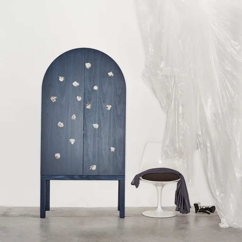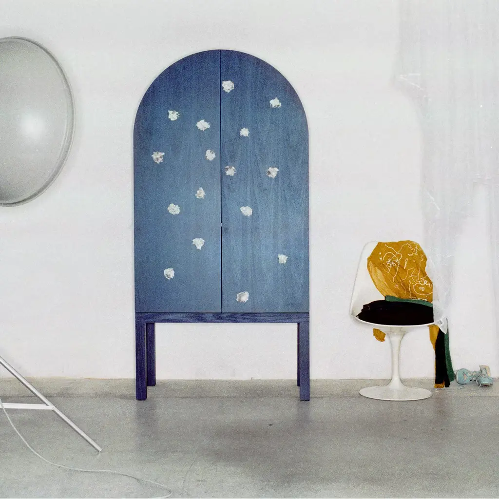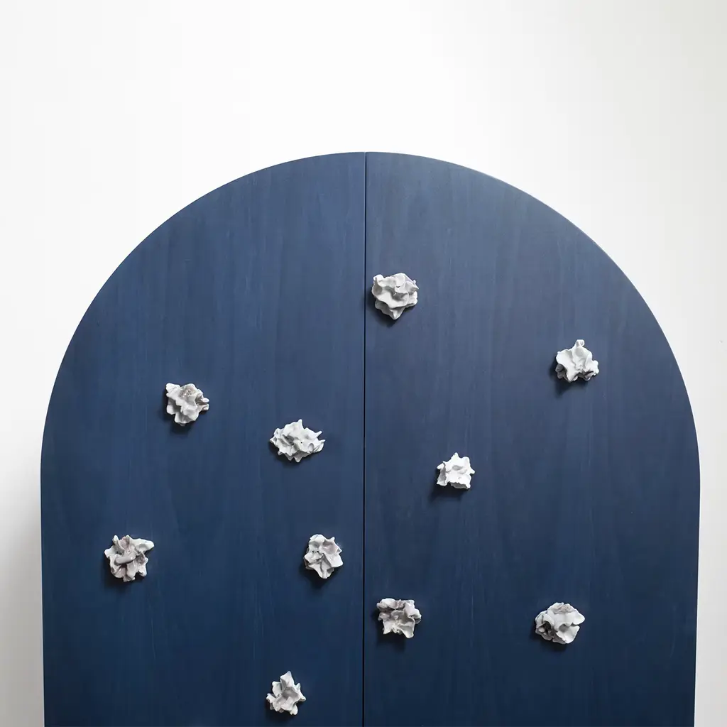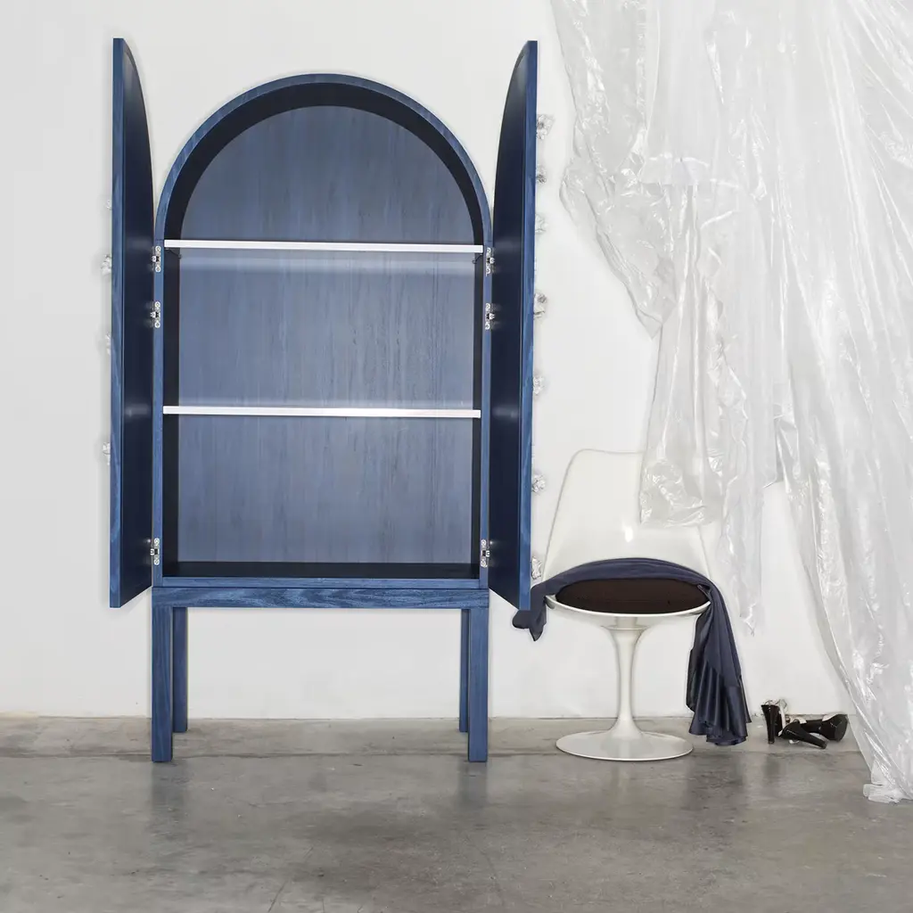 Crafted by Sergio Mannino, this cabinet embodies timeless design and artisanal craftsmanship, seamlessly blending form and function with elegance and innovation. Its double doors boast handmade ceramic inserts, each adorned with a lustrous white finish, adding a touch of uniqueness to every piece. The sophisticated blue wood finish is complemented by practical white lacquer shelves. With minor imperfections enhancing its allure, this cabinet is a genuine work of art.