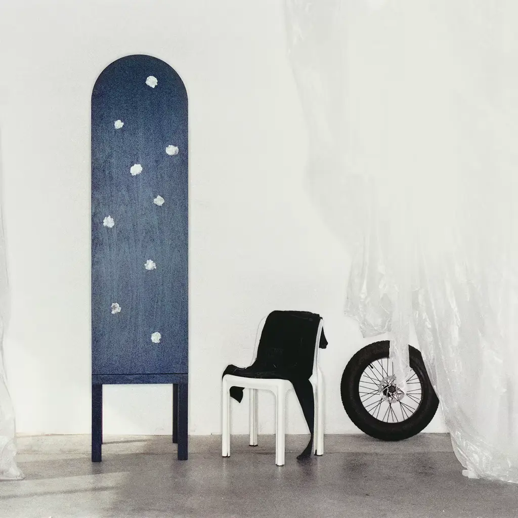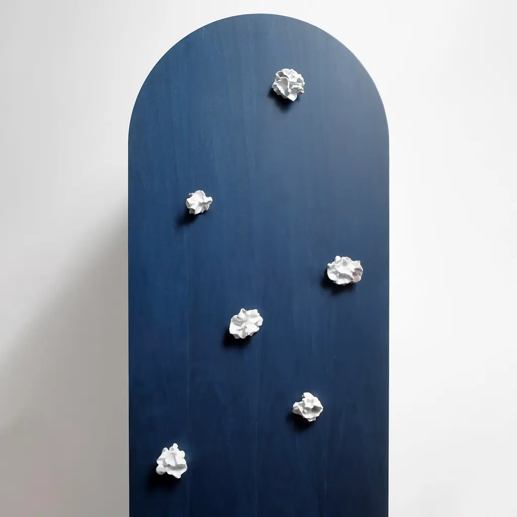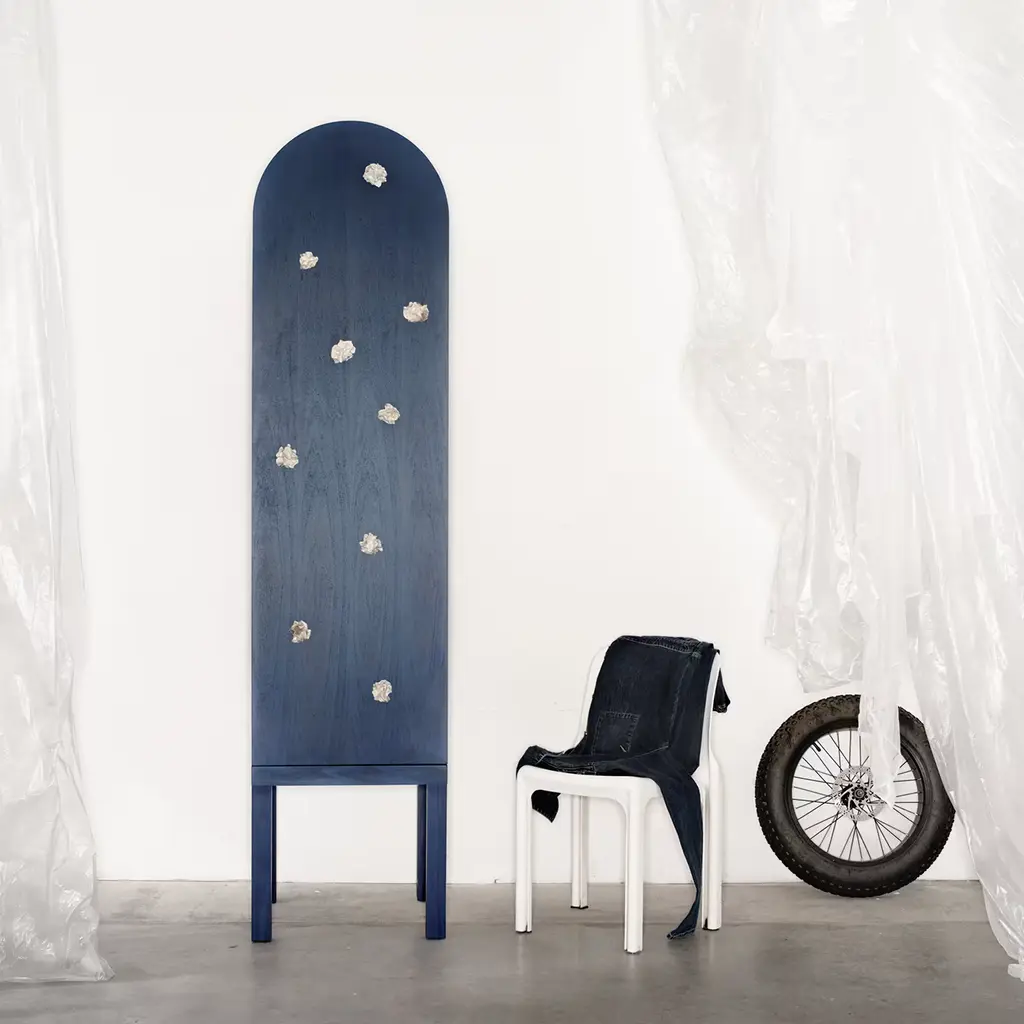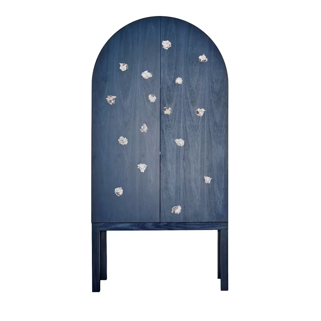 Celebrating the artistry of ceramics and the allure of vintage design, this cabinet emerges as a distinctive masterpiece. Handcrafted by Sergio Mannino, each ceramic insert gleams with a bespoke white glaze, embodying individuality sans molds. Enveloped in a serene blue hue, the cabinet exudes sophistication, while its white lacquer shelves offer practical elegance. Meticulously crafted by hand, this limited edition piece bears subtle imperfections that accentuate its character.