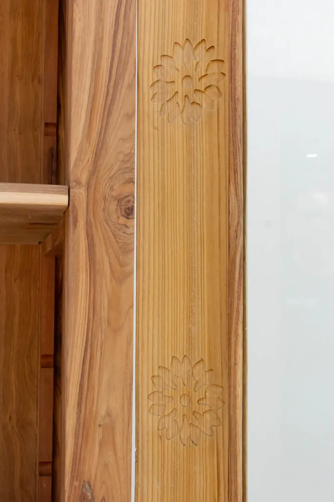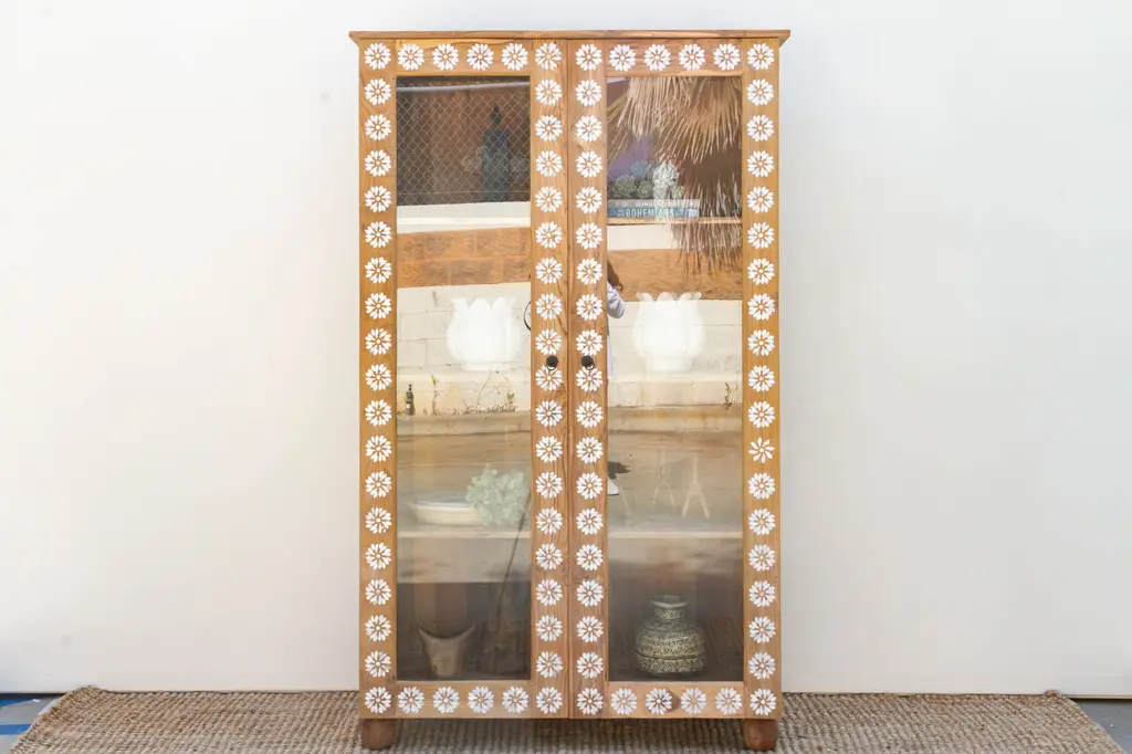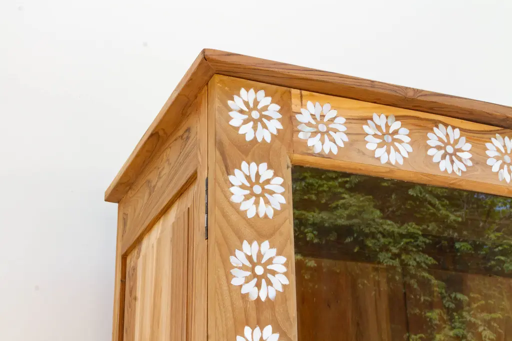A charming bleached wood & mother of pearl inlay tall glass cabinet. Made from reclaimed teak, this large reconstructed armoire has bleached reclaimed teak finish with a beautiful inlay work in a floral motif. This tall cabinet features a blossom inlay designs across the front with reinforced glass door panels. This bleached cabinet has four rounded legs and three interior shelves.