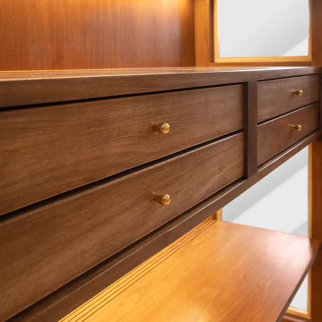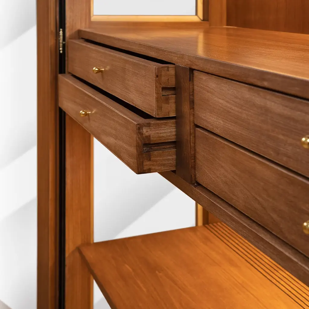 An exquisite and striking design to complement both modern and traditional interiors, this gorgeous two-door cabinet will make a precious addition to a living room decor. Deftly made of solid lime wood, it features two glass doors that open to reveal two wooden shelves and four drawers illuminated with an LED light. Externally lacquered with eco-friendly, water-based blue paint and handpolished with beeswax. Care instructions included with purchase. Customizable upon request to the Concierge.