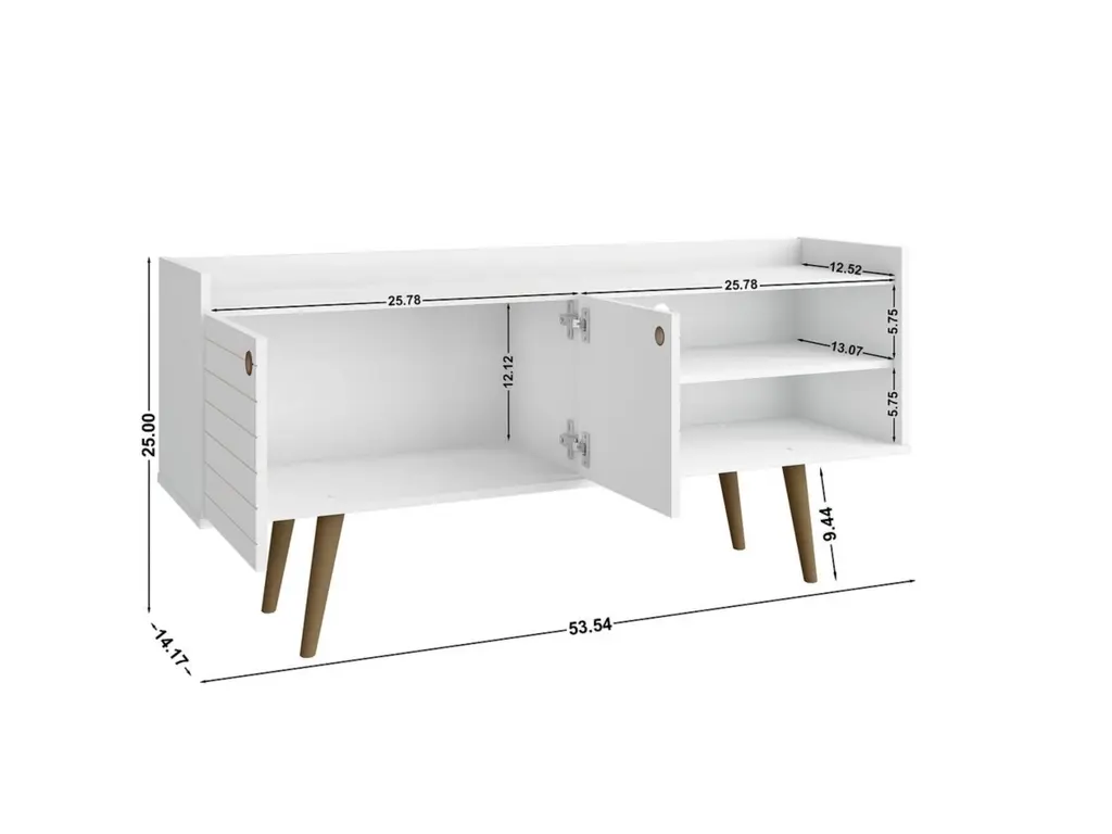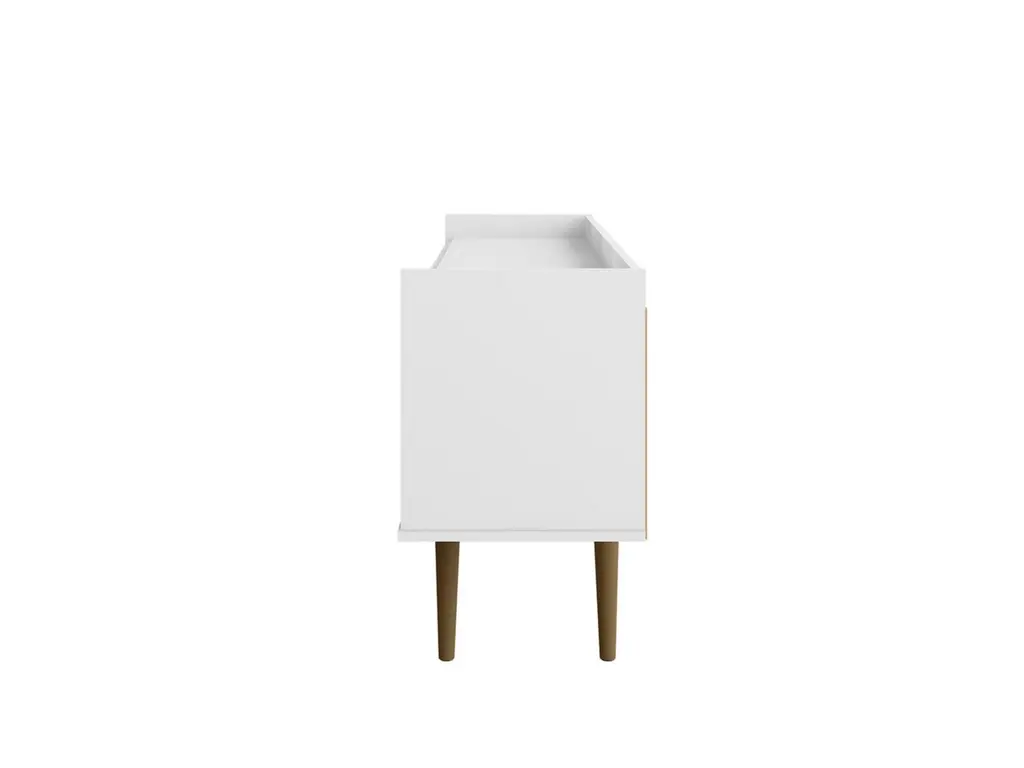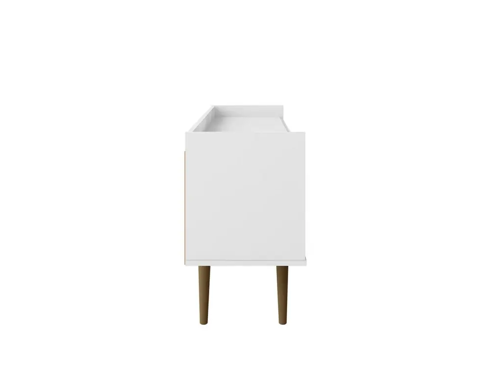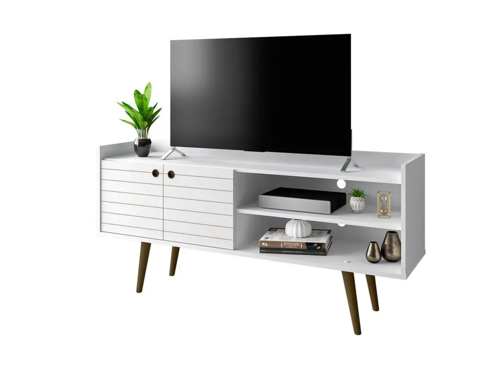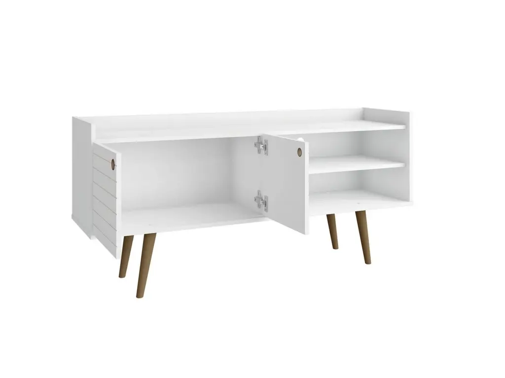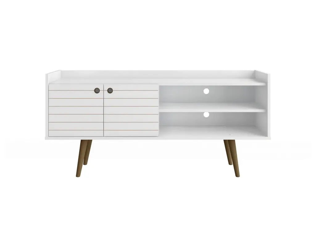 A timeless look for your entertainment space. The Bogart TV Stand hits all the marks of the design trifecta: eye-catching appearance, functionality and craftsmanship. The chic mid-century modern design is transitional to easily fit any home's décor. The cabinet style and open storage design offers plentiful space for gaming, streaming devices, and cable management. The Bogart's high quality MDF and solid wood materials create a piece to last for years and years.