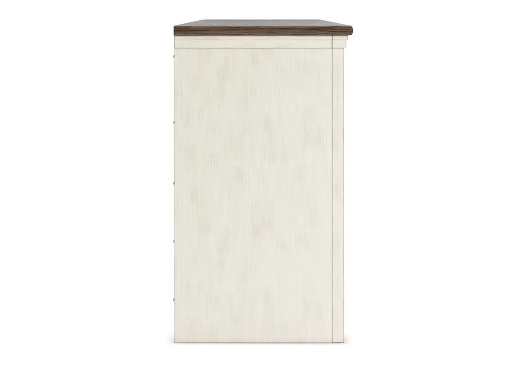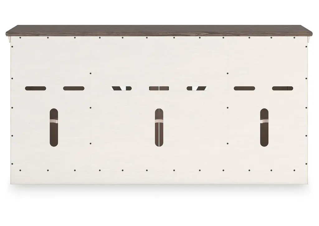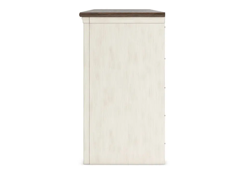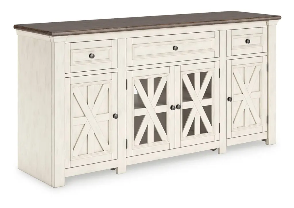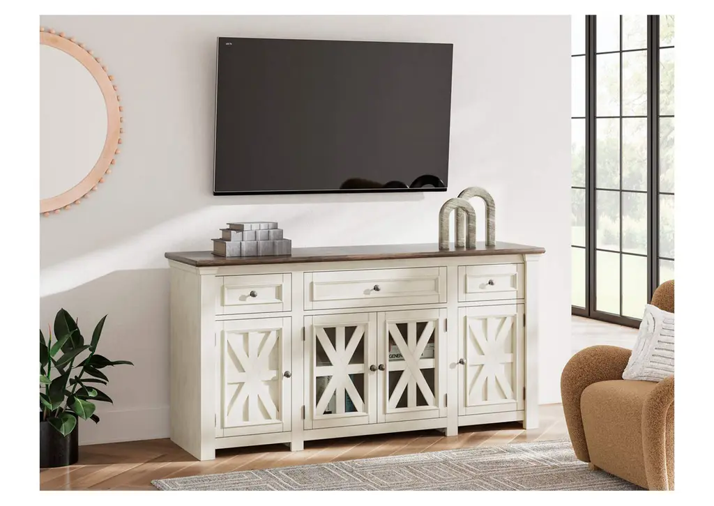 Whether your style is farmhouse fresh, shabby chic or country cottage, you’ll find the Bolanburg TV stand perfectly in tune. Its two-tone finish pairs a trendy textured antiqued white with weathered gray for that much more quaint character. Charming elements include crossbuck-adorned cabinet doors with glass inlays for peek-through flair. Ample storage space and cutouts for wire management nicely accommodate your media needs. Weight 226.000 lbs. (101.7kgs.)