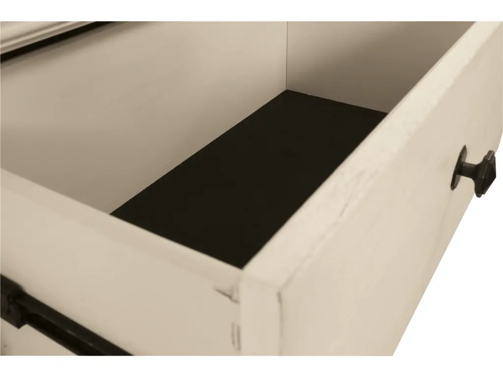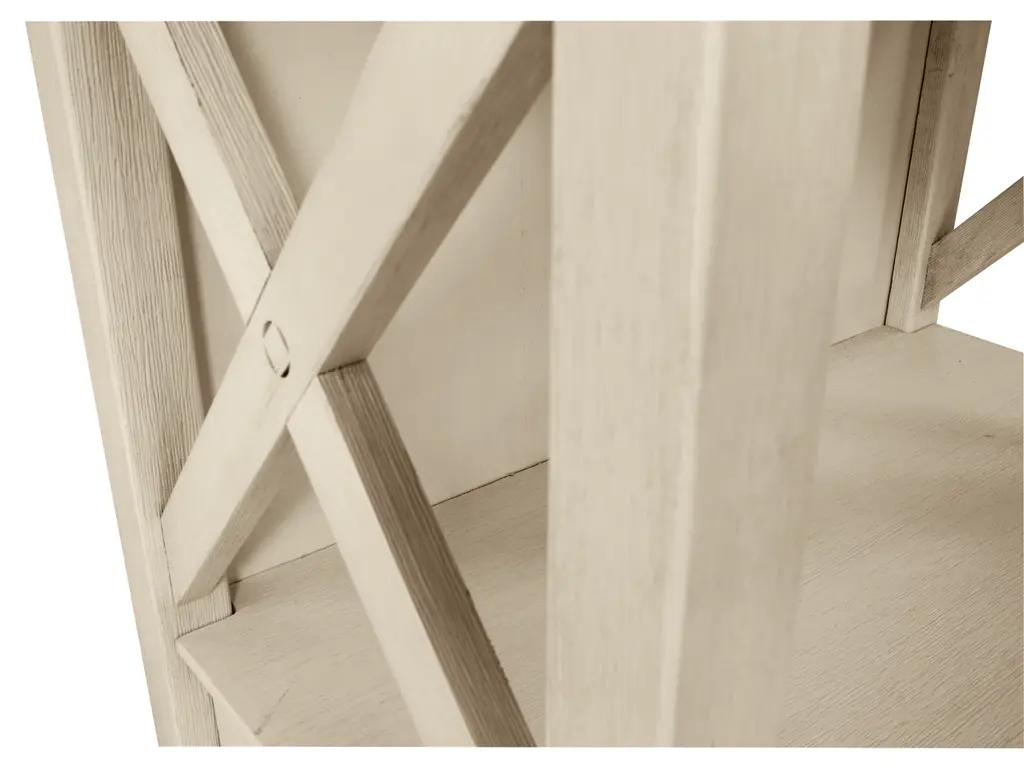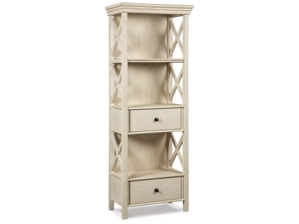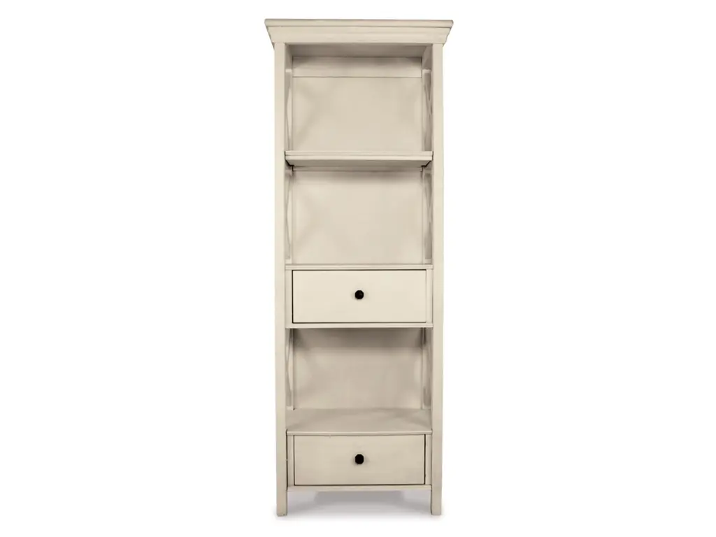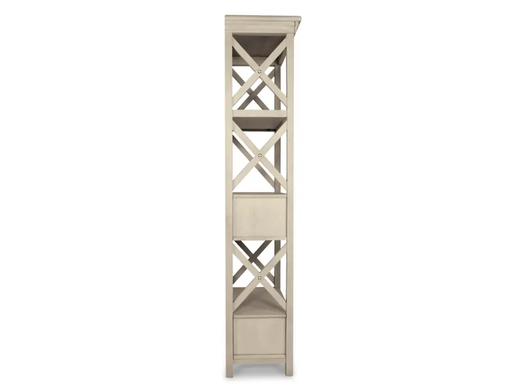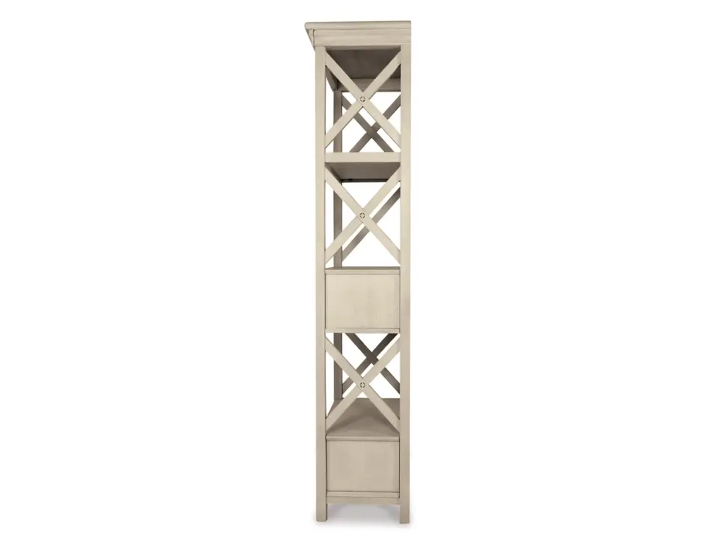 Need a stylish space to showcase dinnerware, pictures, decorations and more? The tall Bolanburg three-shelf display cabinet is a dream come true. The textured antiqued white finish provides a perfect backdrop for presentation. For the items you want to hide, there are two deep drawers. Embellished with the casual appeal of lattice sides, attractive crown moulding, clean lines and lightly distressed finish, this cottage-style shelf provides ample storage in such an artful way.