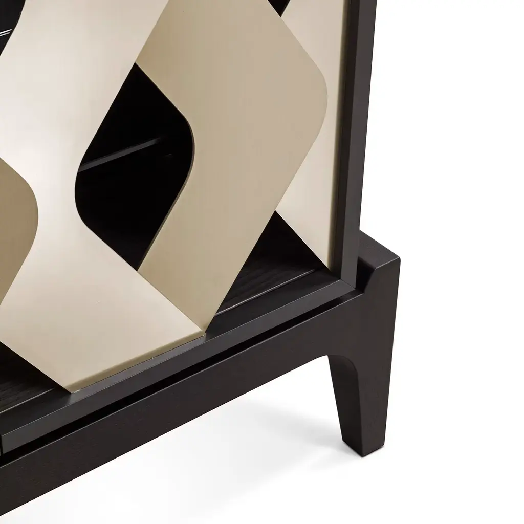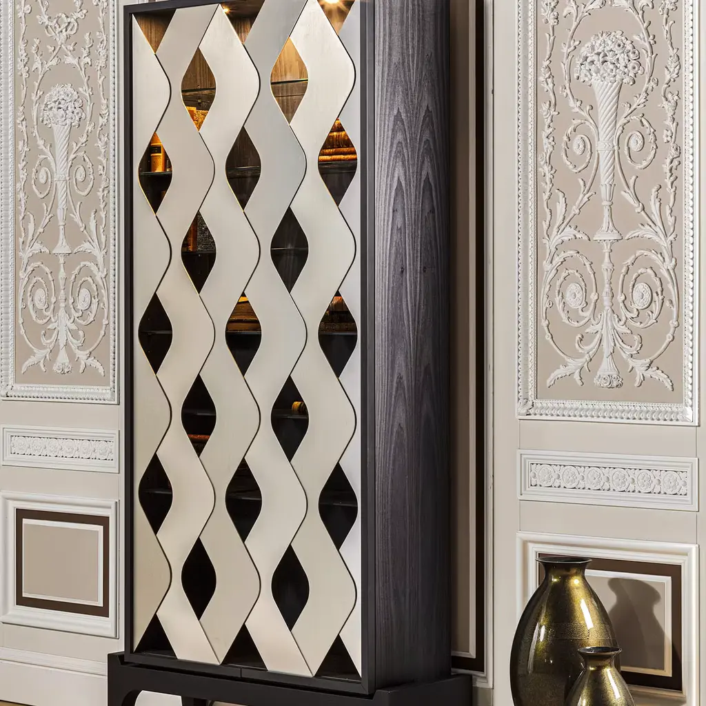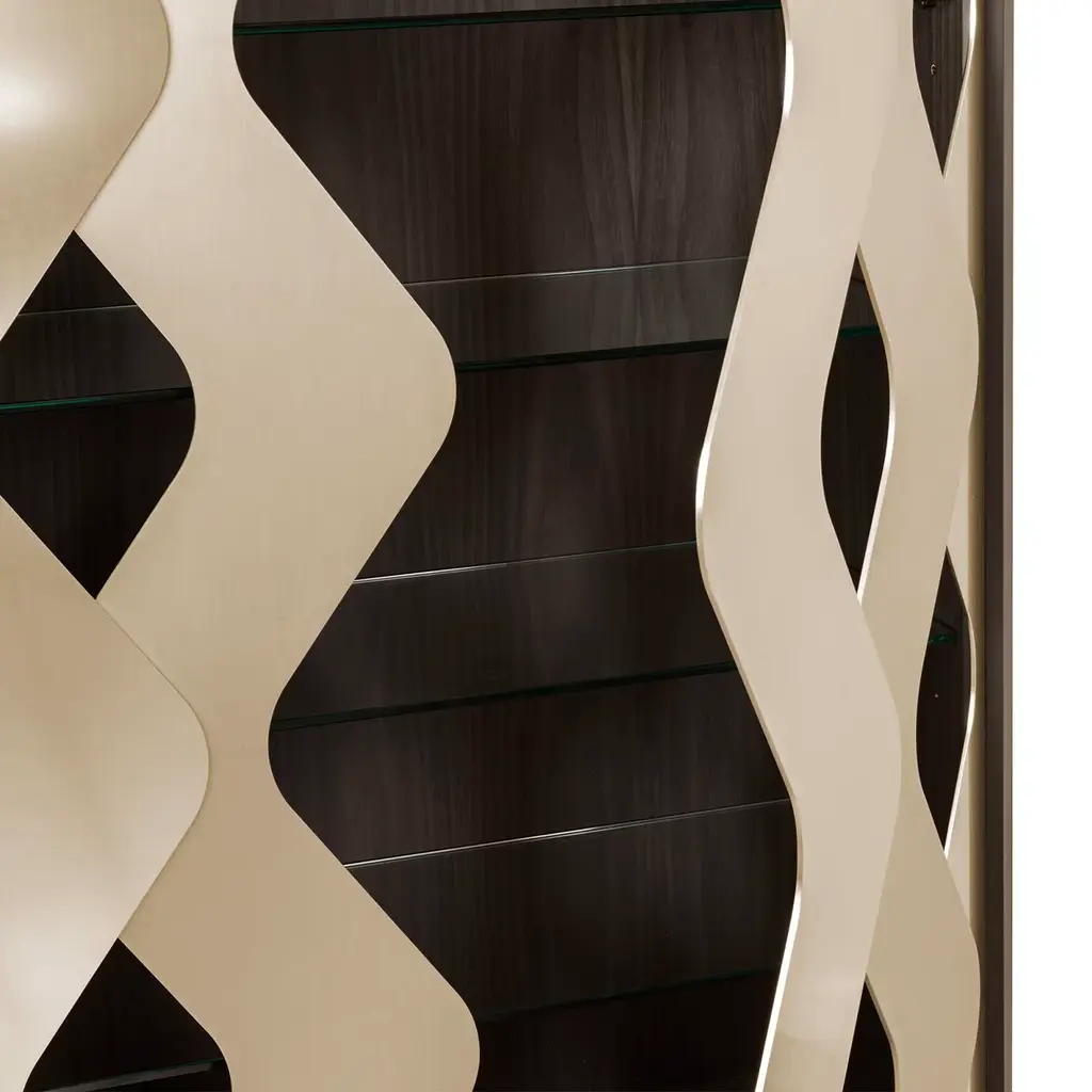 Bolivar wood cabinet with oak base and wave-shaped doors in galvanized aluminum.