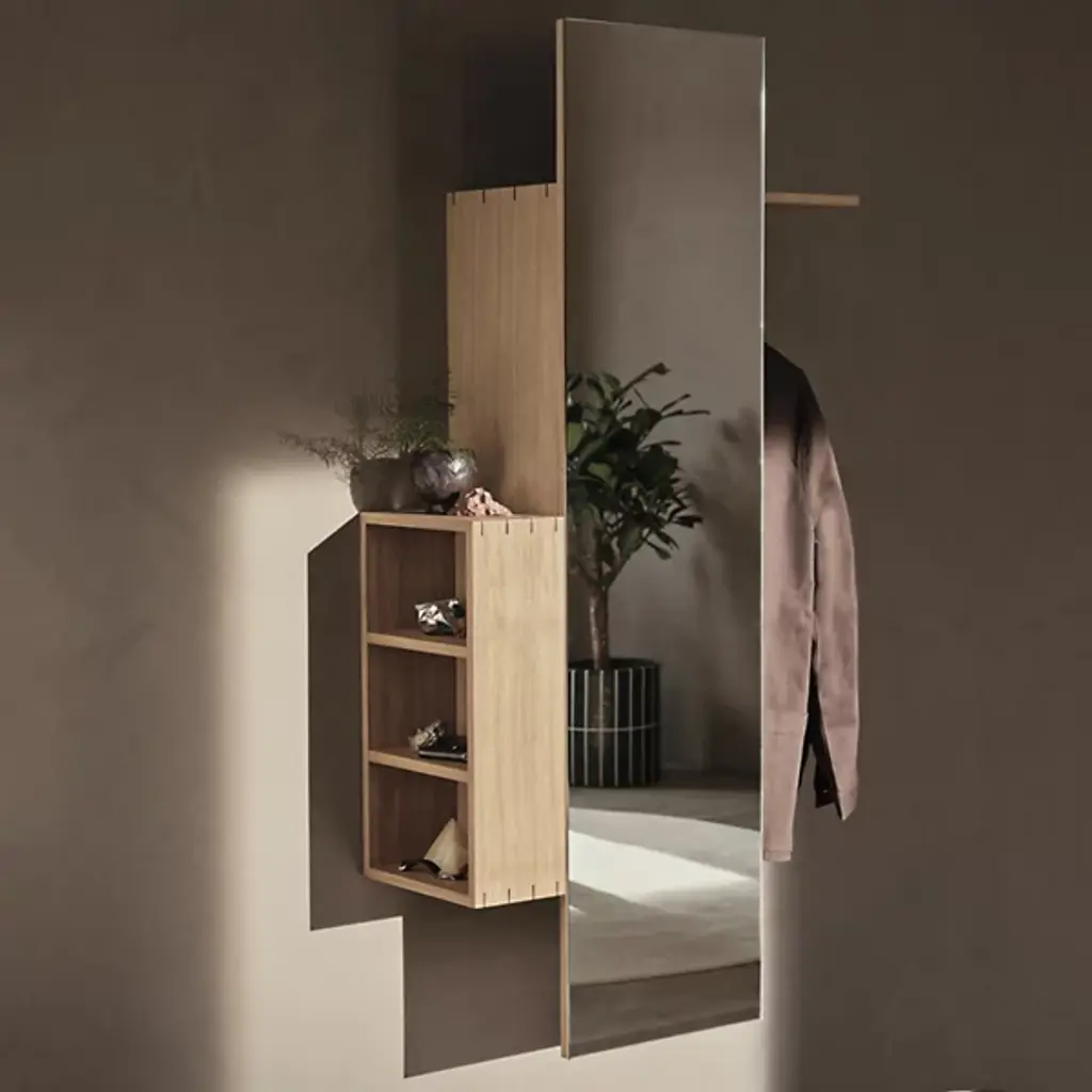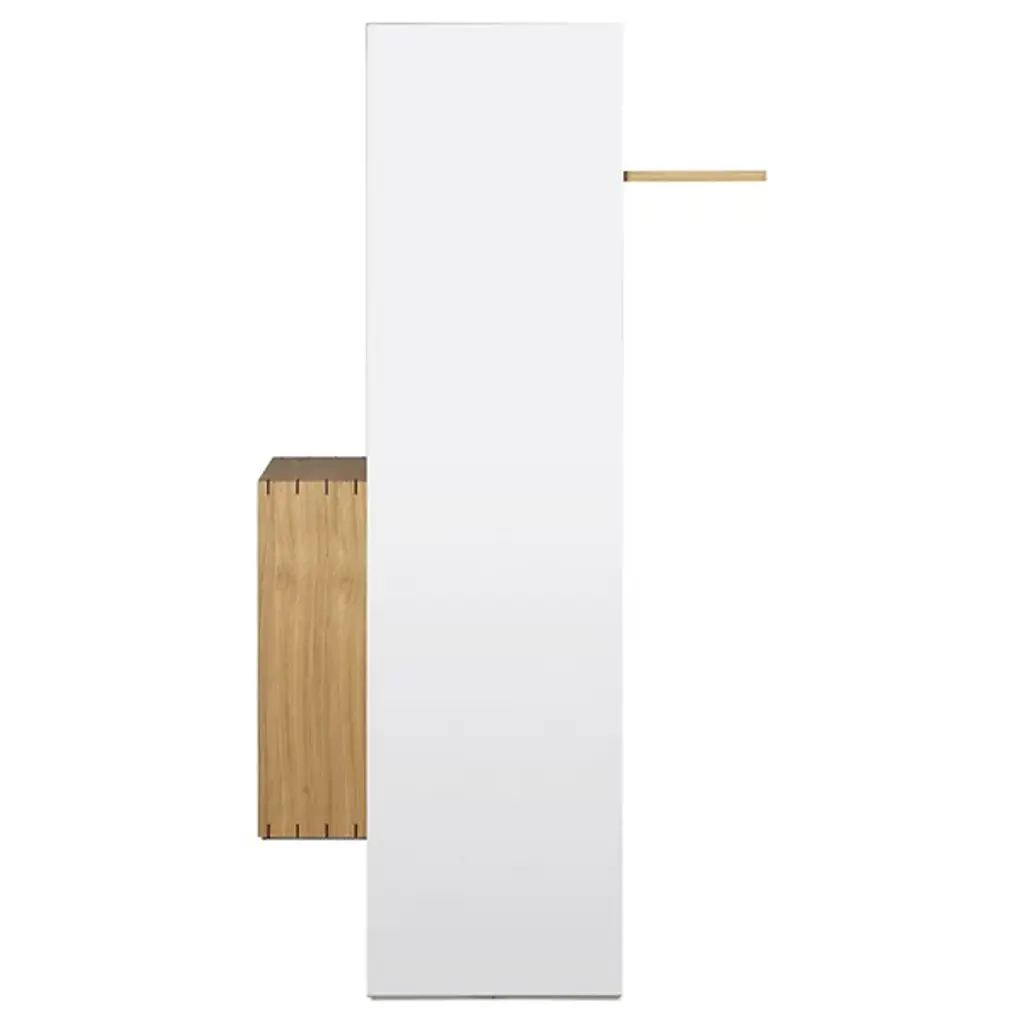 The Bon Hallway Cabinet from Ferm Living embodies a fusion of Japanese and Scandinavian influences in a sleek, functional design. Optimized for entryway organization, this unit features a shelf, a rack, a mirror, and narrow side shelves for storing clothing, bags, and accessories. A tall mirror features oak veneer over an MDF core, with a vibrant wood grain surface, and offers ample storage. Its thoughtful composition balances natural materials with purposeful detail, bringing order and warmth to everyday routines.