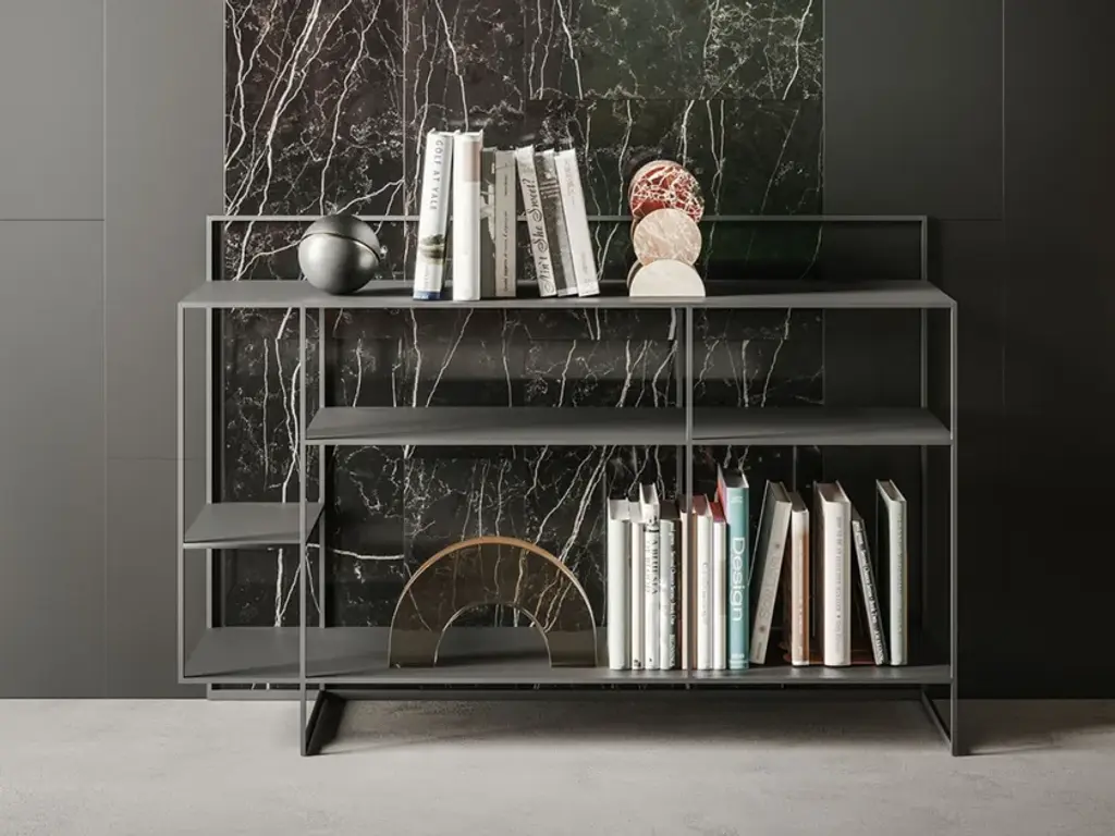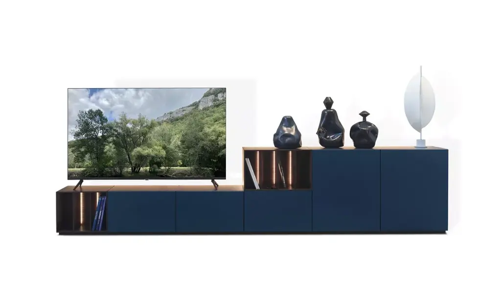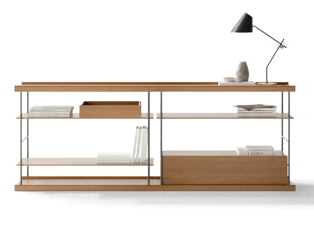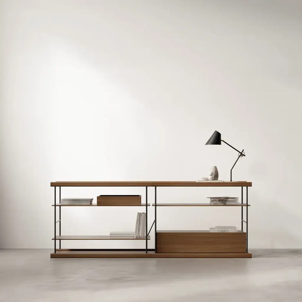 Low TV cabinet from the Bost collection in Kai Black.Composition in photo:C143-MC941-A ground with drawer 110 x 54 x 43structure: GraphiteBase and top shelf: Graphitedrawer: Tobacco OakC141-A ground-1 110 x 54 x 43 structure: GraphiteBase and top shelf: Graphiteshelf1: GraphiteC841-A ground-1 80 x 54 x 43 structure: GraphiteBase and top shelf: Graphiteshelf1: GraphiteC641-A ground-1 60 x 54 x 43 structure: GraphiteBase and top shelf: Graphiteshelf1: GraphiteBE11-Short metal shelf 110 x 2 x 20Shelf: GraphiteFor more finishes, please contact the contact center.Simplicity, innovation and originality. Without extravagance. This is the philosophy of Yonoh, the creative study that has created the new modular shelf Bost for Treku. The result is a product that harmonizes wood and metal organically and work in different spaces in the home or in the work place.“Bost arose from a formal idea: how to make a simple model that combines wood and metal in a function way, sober, but with our most organic essence.” (Yonoh)