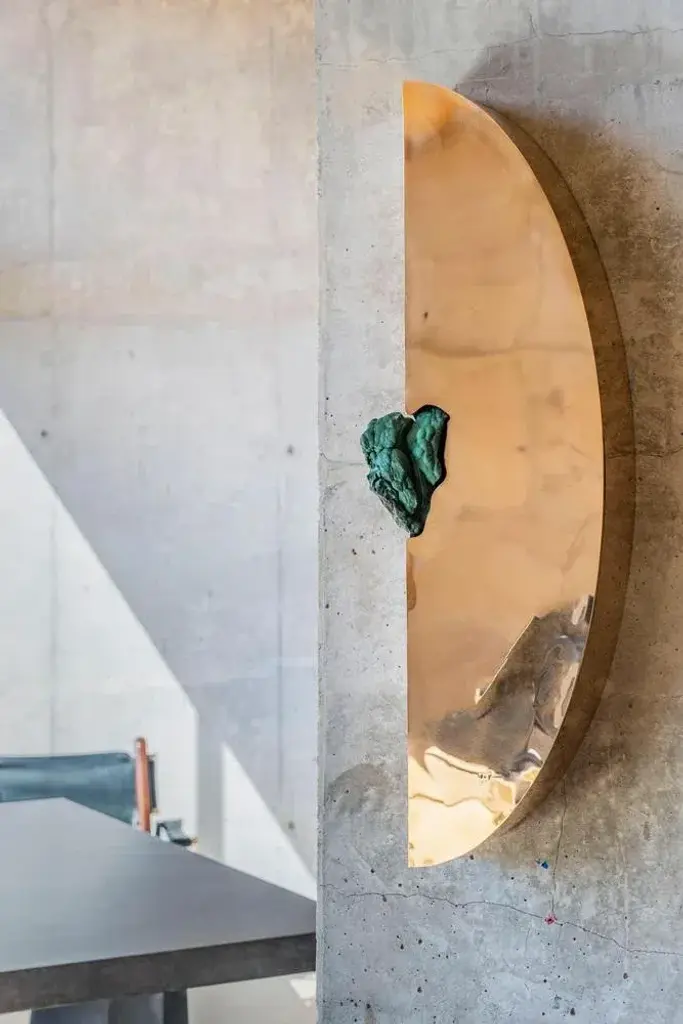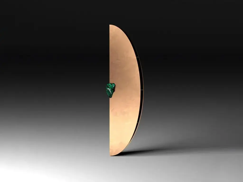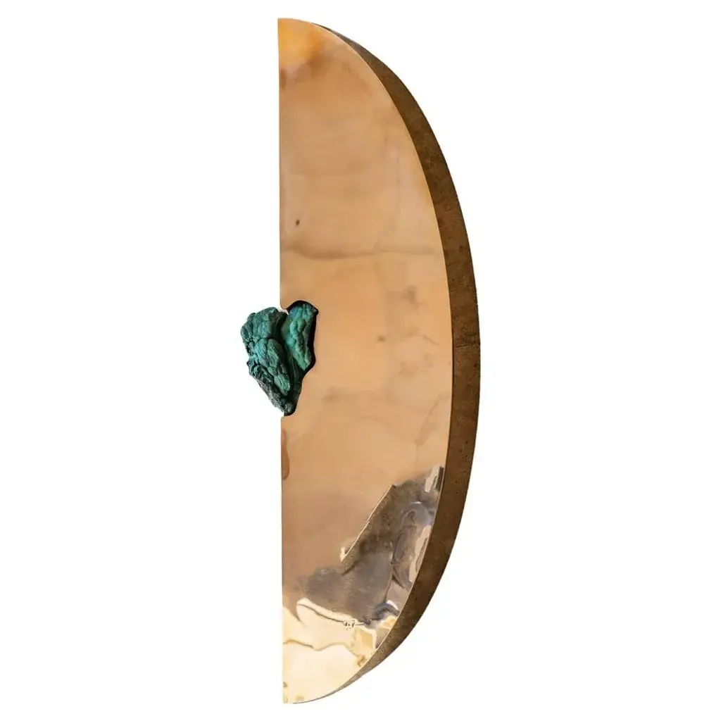 Bow cabinet with Malachite by Pierre De Valck. Dimensions: W 55 x D 34 x H 70 cm. Materials: Polished bronze with Malachite. Weight: 15 kg. Each piece is unique.