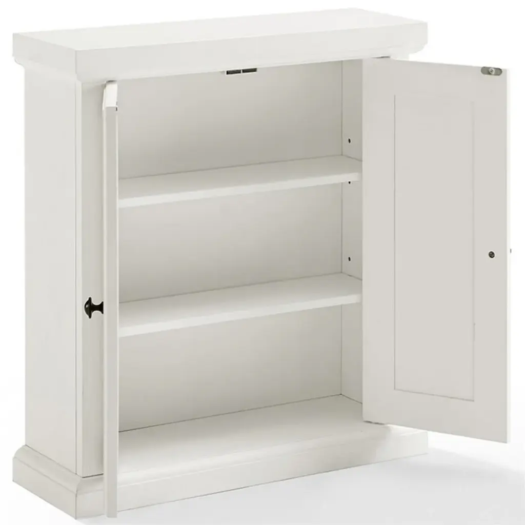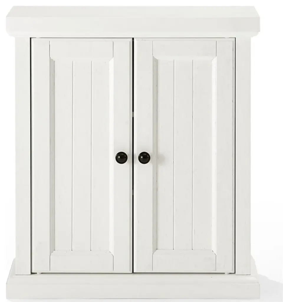 A perfect storage solution for any bathroom, the Bowery Hill wall cabinet delivers an organization with a coastal cottage style. Behind the breadboard panelled doors are two adjustable shelves, sized perfectly for small bath items and toiletries. Keeping clutter neatly hidden, the Bowery Hill wall cabinet will be a welcome addition to your bathroom space.Features: • Material: Birch veneer 50%, MDF wood 25%, particle board 25% • Finish: Distressed white, black • Genuine metal hardware in an antique black finish • Two adjustable and removable bathroom shelves • Double storage cabinet doors with breadboard panelling and magnetic closures • Pairs well with traditional, farmhouse, and coastal decor • Total wall shelf weight limit is 50lbs • Anti-tip hardware: No • Indoor furnitureSpecifications: • Product Dimensions: 26"H x 23.5"W x 8"D • Product Weight: 31.46 lbs • Number of Shelves: 3 • Number of Doors: 2 • Shelf Weight Capacity: 15 lbs