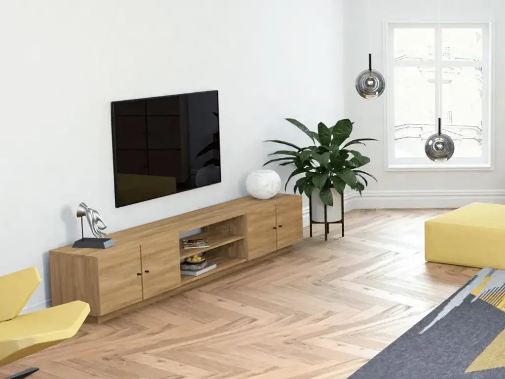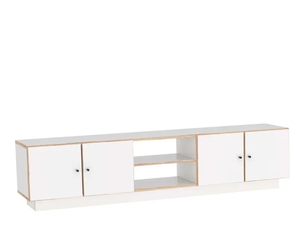 When you are watching TV surely you want a pleasing sight even when your eyes wander off from the screen. BOXY TV stand offers that. Clean aesthetic and mid- century inspired metal legs make it in an instant classic. Doors with large phase on the edges, behind which you can store everything from books to you secret TV snack stash. 46 cm wide opening with adjustable intermediate shelf in the middle of the doors for technology.Characteristics:Made of oak veneered birch plywood, oil-waxed, also Koskisen CPL on plywood.Soft closing door hinges.Door handles are minimal black metal knobs.Plinth height 8 cm.