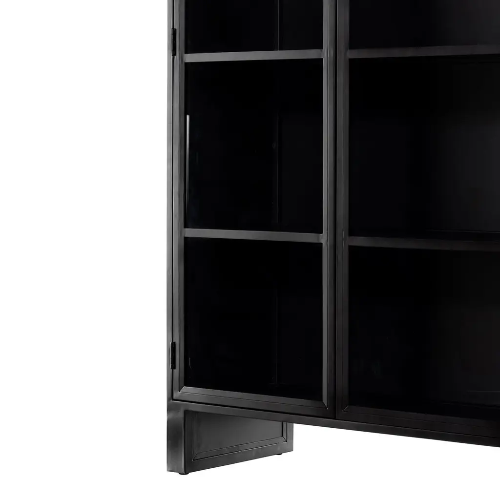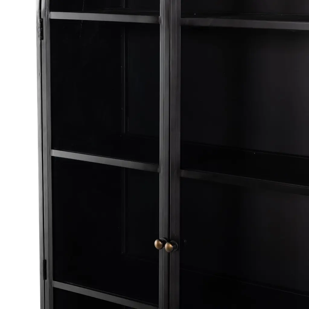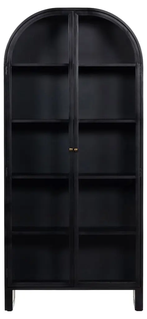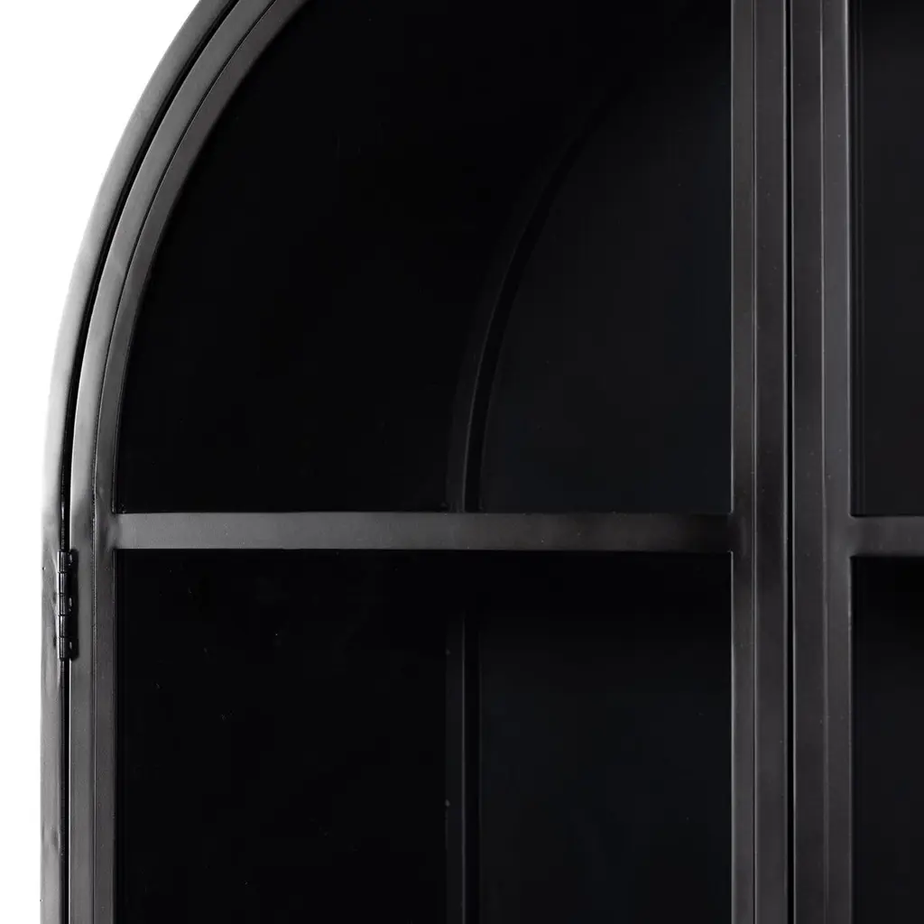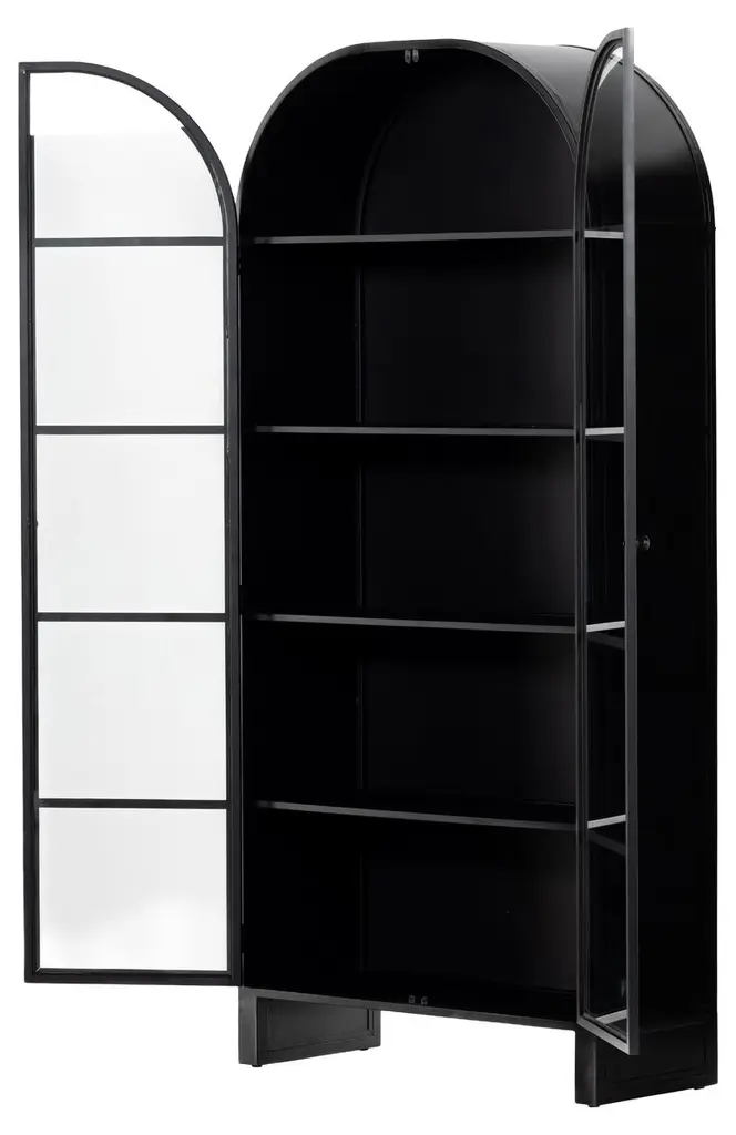 The classic arched étagère gets a fresh downtown vibe when rendered in black iron. Shelves behind the glass-front doors offer plenty of storage and display options.
