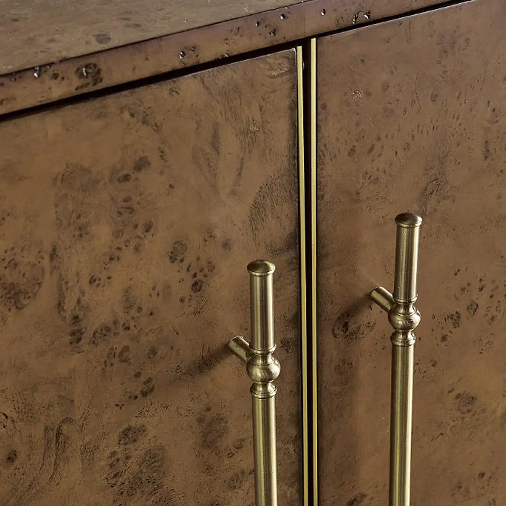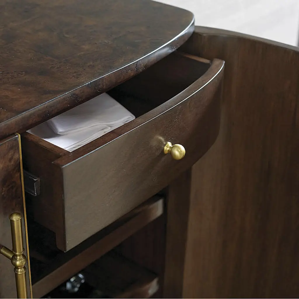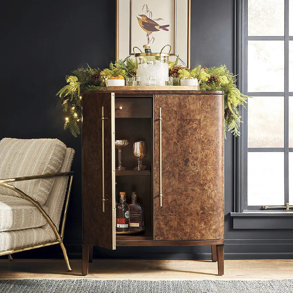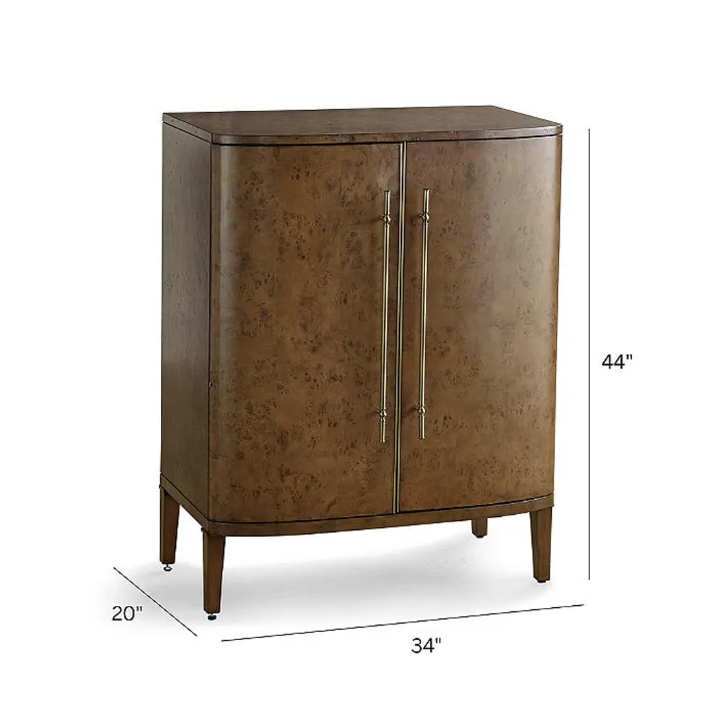 With its gently curved silhouette and burlwood exterior, our timeless Brando Bar Cabinet elevates the look of any room while keeping bar essentials close at hand. Crafted of mahogany hardwood and burl veneer, this classic bar cabinet features curved front doors that open to reveal ample storage for bottles and barware. Crafted of mahogany hardwood with burl veneer Russet, Coffee, or Fawn finish Hardware that is finished in antiqued burnished brass Long door pulls make a classic statement Two slow-close, full-extension drawers Three adjustable shelves; flat on one side, slotted for four wine bottles on the other Soft-close doors with adjustable hinges to ensure cabinet door alignment Arrives assembled Included anti-tip kit is required for installation; kit consists of safety-tested mounting hardware, a nylon strap and instructions To prevent injuries from furniture tipping over, this item must be permanently affixed to the wall; professional installation is recommended To prevent injuries or damage to item, recommended team lift (two or more people) for furniture placement A Frontgate exclusive. At Frontgate, our primary focus is quality. We guarantee that every product we sell will stand up to the supreme test – our customers' satisfaction. To learn more about our policies, visit our Shipping & Processing, Returns & Exchanges and Warranty & Price Guarantee pages.