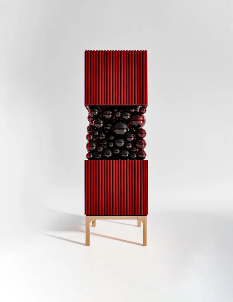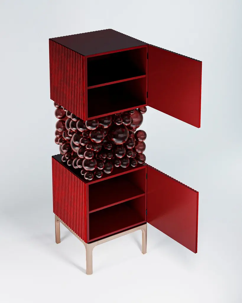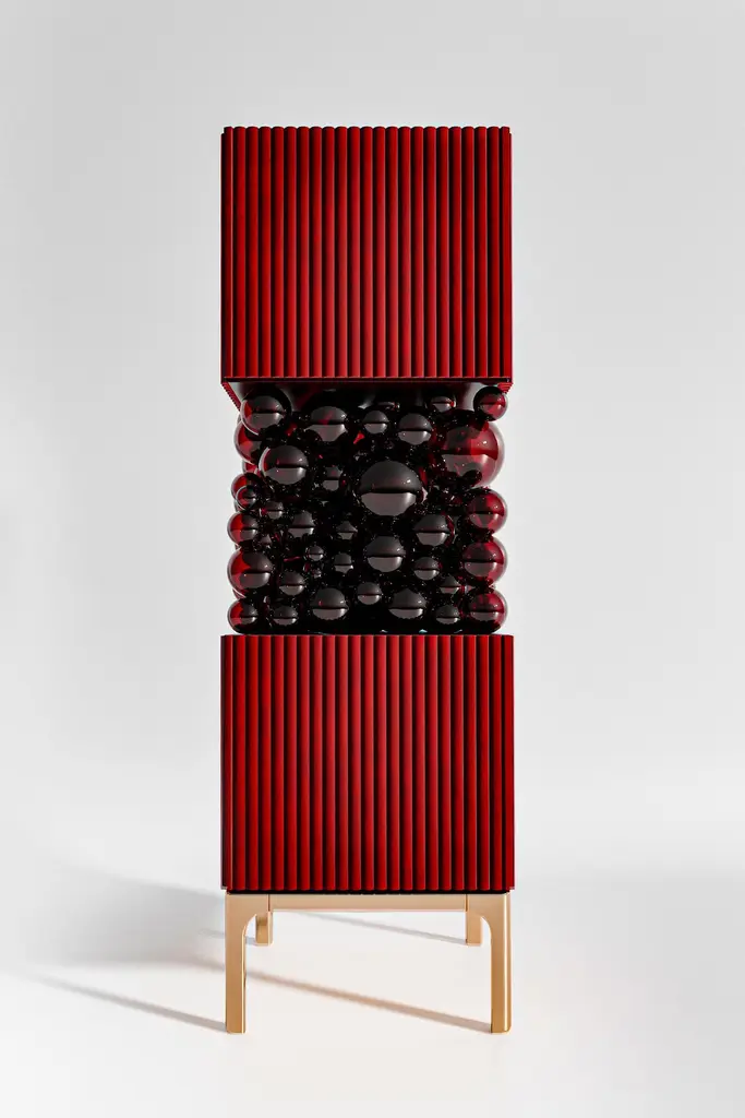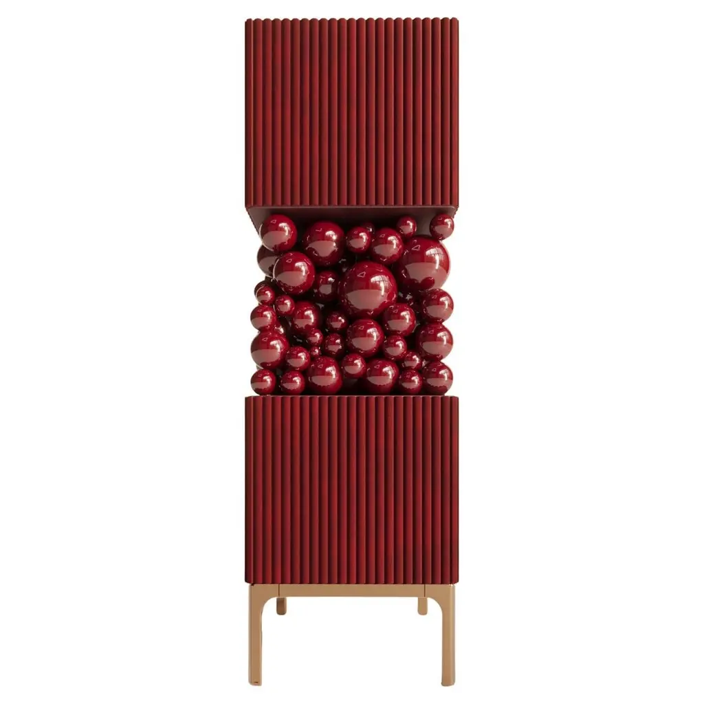 Brass And Glass Bubbles Decorative Cabinet by PANOPTIKUM COLLECTIONSDimensions: D 55 x W 55 x H 190 cm.Materials: MDF, brass, glass, and LED lighting.The “Bubbles collection” is an example of an emotional design that appeals to our inner child. The collection is inspired by excitement from childhood, provoked by the first reaction to rainbow-colored soap bubbles and pink bubble gum.Colour palette: pastels and pure, rich colors and textures, gloss and mattecoating of the facades. An airy array of the «bubbles» masking the load-bearing console between the two functional cubes of the cabinet creates a dynamic contrast of shapes, like a layer of puffy cream in a cake. Due to its cube’s height, the item can function as a cabinet or a drawer unit.PANOPTIKUM COLLECTIONS is proof of the feasibility of the materialization of ideas, even the most unusual ones, which were embodied in astonishing yet functional interior objects. We created this platform for experimentation with design objects, ideas, materials, shapes, and textures. This is a real collection of unusual objects, each of which was once just a reckless idea. The most expensive ideas are those whose implementation requires not only material resources but also courage, intuition, and skill.