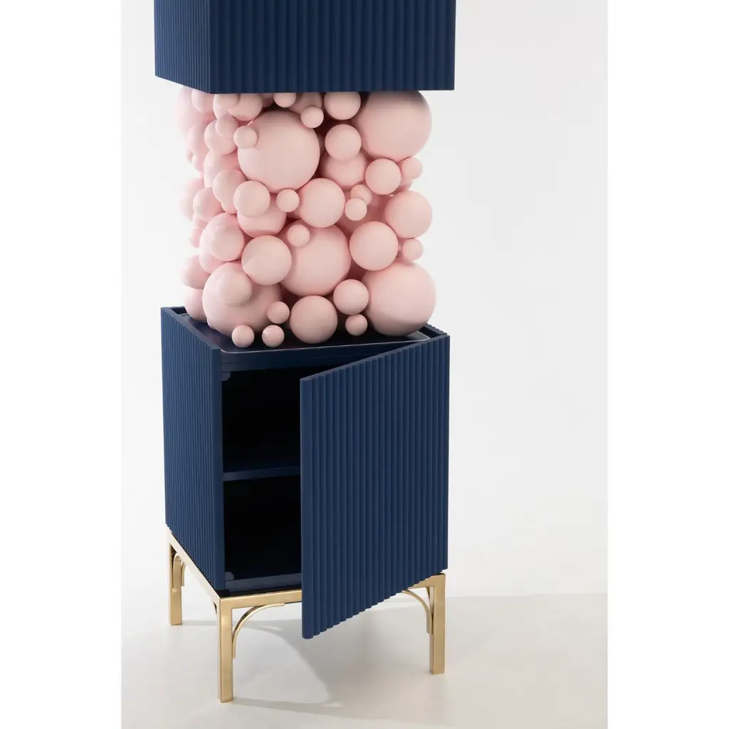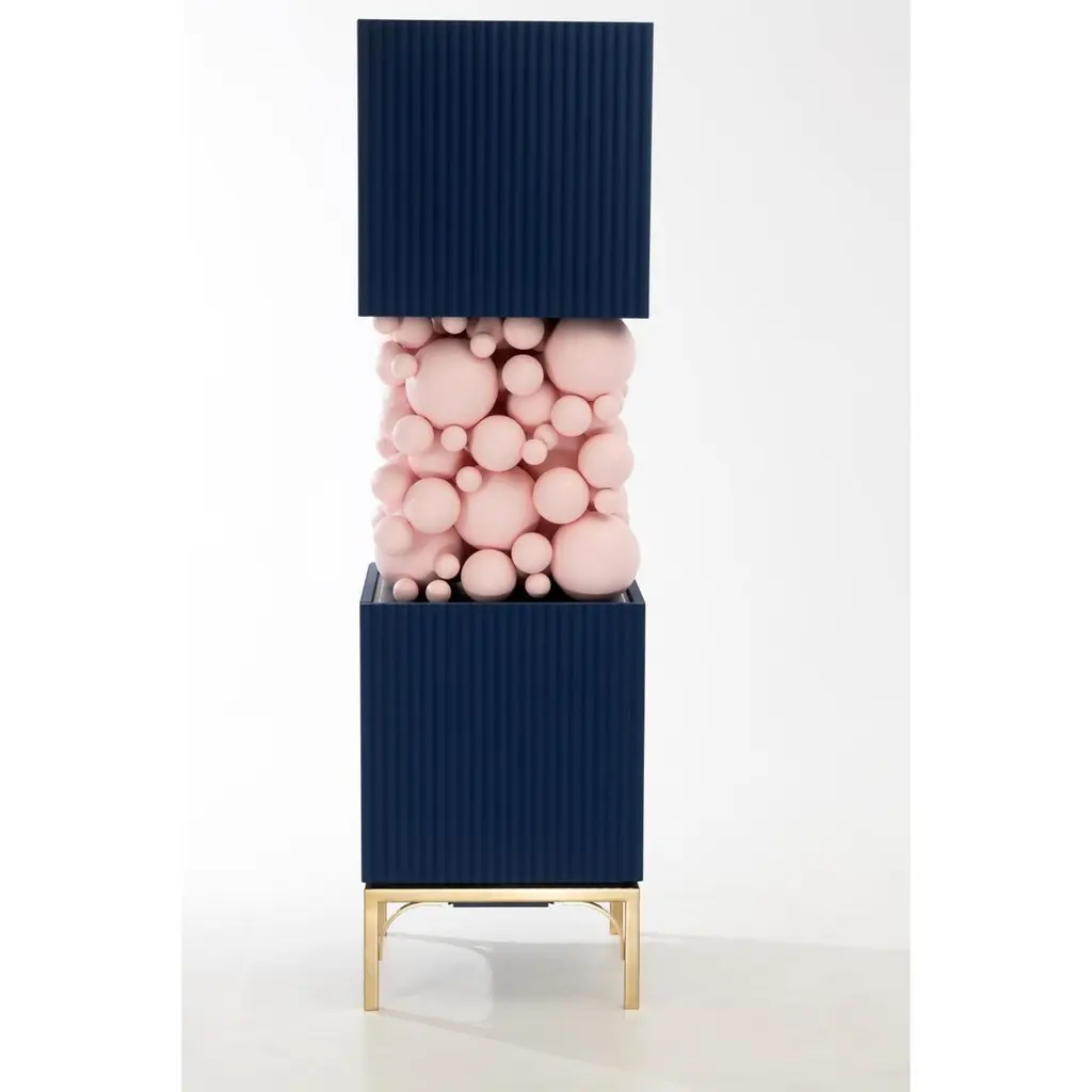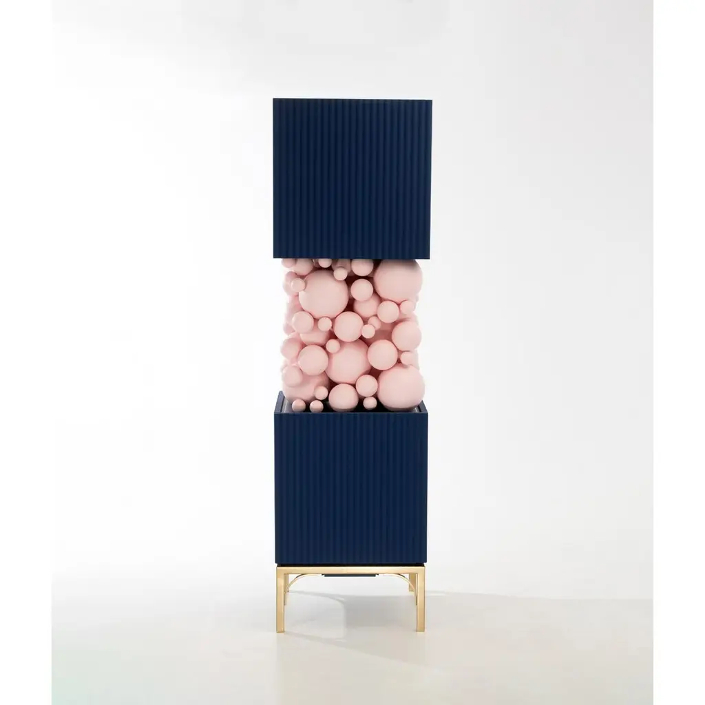 Brass And Pastel Pink Bubbles Cabinet by PANOPTIKUM COLLECTIONSDimensions: D 55 x W 55 x H 190 cm.Materials: MDF, brass paint, and LED lighting.The “Bubbles collection” is an example of an emotional design that appeals to our inner child. The collection is inspired by excitement from childhood, provoked by the first reaction to rainbow-colored soap bubbles and pink bubble gum.Colour palette: pastels and pure, rich colors and textures, gloss and mattecoating of the facades. An airy array of the «bubbles» masking the load-bearing console between the two functional cubes of the cabinet creates a dynamic contrast of shapes, like a layer of puffy cream in a cake. Due to its cube’s height, the item can function as a cabinet or a drawer unit.PANOPTIKUM COLLECTIONS is proof of the feasibility of the materialization of ideas, even the most unusual ones, which were embodied in astonishing yet functional interior objects. We created this platform for experimentation with design objects, ideas, materials, shapes, and textures. This is a real collection of unusual objects, each of which was once just a reckless idea. The most expensive ideas are those whose implementation requires not only material resources but also courage, intuition, and skill.