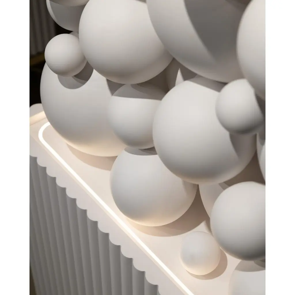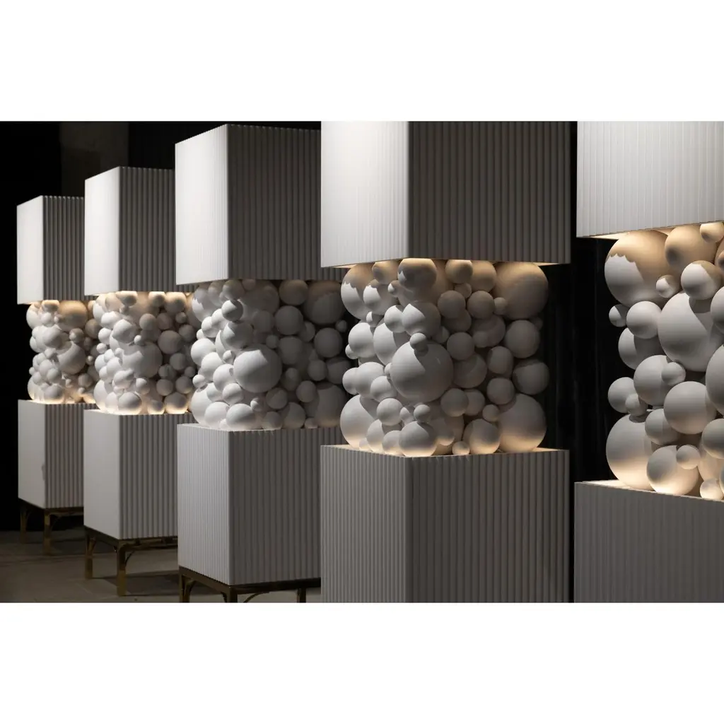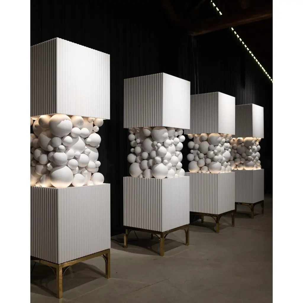 Brass And Pastel Pink Bubbles Cabinet by PANOPTIKUM COLLECTIONSDimensions: D 55 x W 55 x H 190 cm.Materials: MDF, brass paint, and LED lighting.The “Bubbles collection” is an example of an emotional design that appeals to our inner child. The collection is inspired by excitement from childhood, provoked by the first reaction to rainbow-colored soap bubbles and pink bubble gum.Colour palette: pastels and pure, rich colors and textures, gloss and mattecoating of the facades. An airy array of the «bubbles» masking the load-bearing console between the two functional cubes of the cabinet creates a dynamic contrast of shapes, like a layer of puffy cream in a cake. Due to its cube’s height, the item can function as a cabinet or a drawer unit.PANOPTIKUM COLLECTIONS is proof of the feasibility of the materialization of ideas, even the most unusual ones, which were embodied in astonishing yet functional interior objects. We created this platform for experimentation with design objects, ideas, materials, shapes, and textures. This is a real collection of unusual objects, each of which was once just a reckless idea. The most expensive ideas are those whose implementation requires not only material resources but also courage, intuition, and skill.