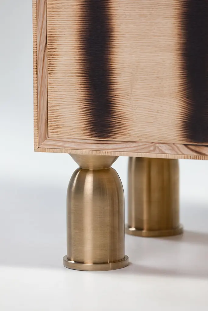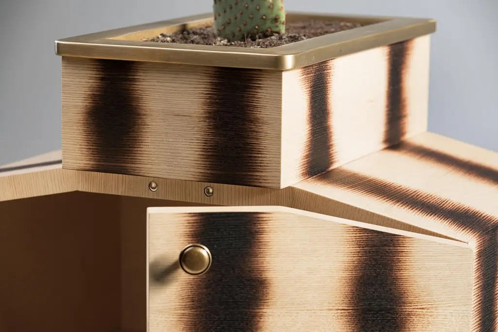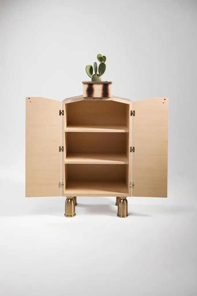 Brass And Solid Wood Bugs Cabinet by PANOPTIKUM COLLECTIONSDimensions: D 42 x W 60 x H 115 cm.Materials: Solid wood, veneer, and brass.The Cabinet “BUGS” from the collection is a bright example of emotional design. The cabinet is like a bug that flew past the house, decided to visit. And folding his wings-doors, he settled in the room for a long time on sturdy brass legs. But the most amazing thing about this bug cabinet is that instead of horns, this insect has a cactus, which, like an antenna ,silently watches what is happening around. With this bizarre combination of different life forms in one interior object, the author reminded us that everything living on our planet is interconnected.When creating a cabinet, pyrography was used as one of the oldest techniques of applying images to wood by burning.PANOPTIKUM COLLECTIONS is proof of the feasibility of the materialization of ideas, even the most unusual ones, which were embodied in astonishing yet functional interior objects. We created this platform for experimentation with design objects, ideas, materials, shapes, and textures. This is a real collection of unusual objects, each of which was once just a reckless idea. The most expensive ideas are those whose implementation requires not only material resources but also courage, intuition, and skill.