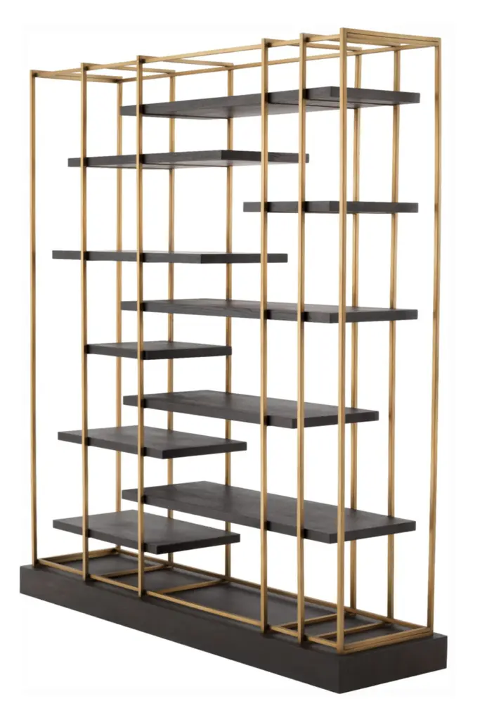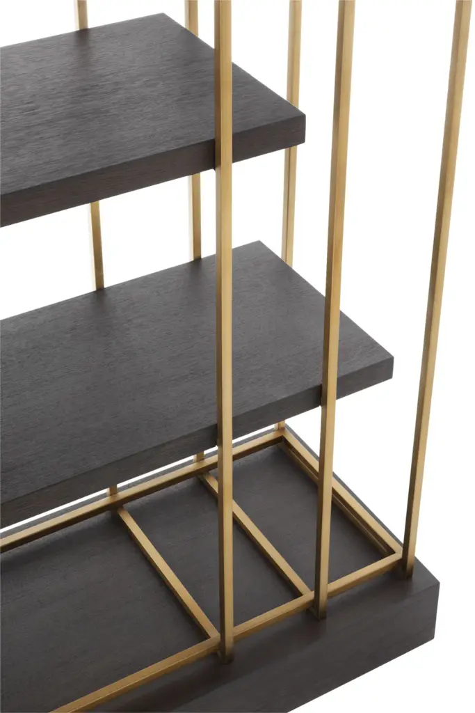Exuding architectural allure, the Ward cabinet is equally at home in vintage décors as in contemporary interior schemes. This clean-lined designer cabinet rests on a sturdy plinth base. Its open-work casing has a brushed brass finish and contains free-flowing oak veneer shelves in charcoal gray.
