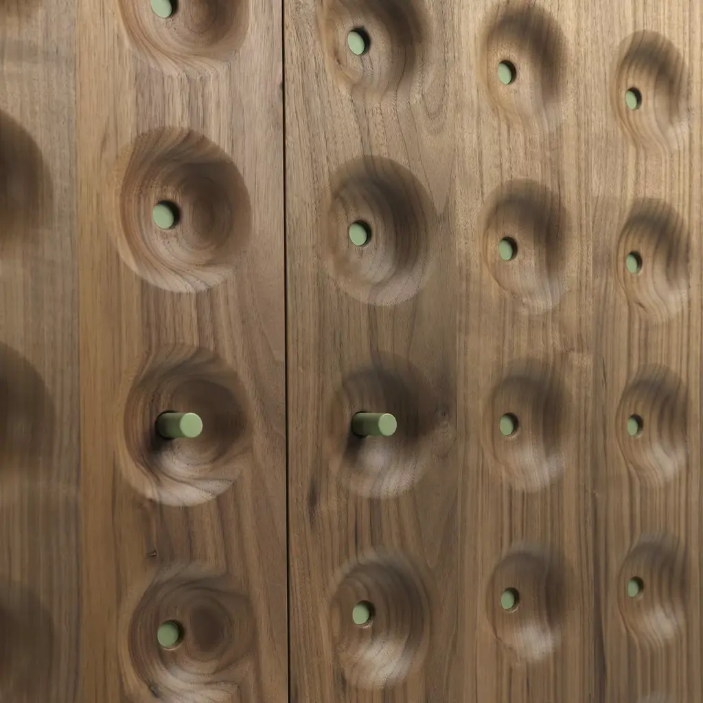 The surface of this imposing cabinet evokes the texture of the skin, whose subtle sensuality transpires from the straight lines and geometric volumes of its minimalist silhouette. The rectangular body is crafted of Canaletto walnut and rests on an iron base with a green finish. The colors of finish of both the legs and the two uniquely textured doors can be chosen by the client. Other woods available are durmast oak and chestnut. Please ask the concierge for variations in prices with these changes.