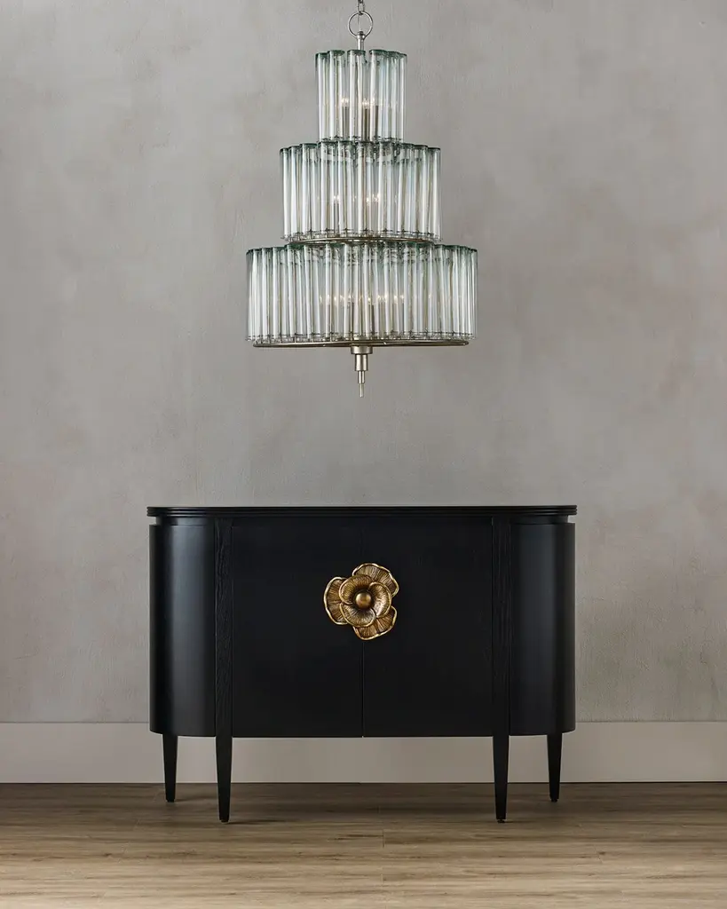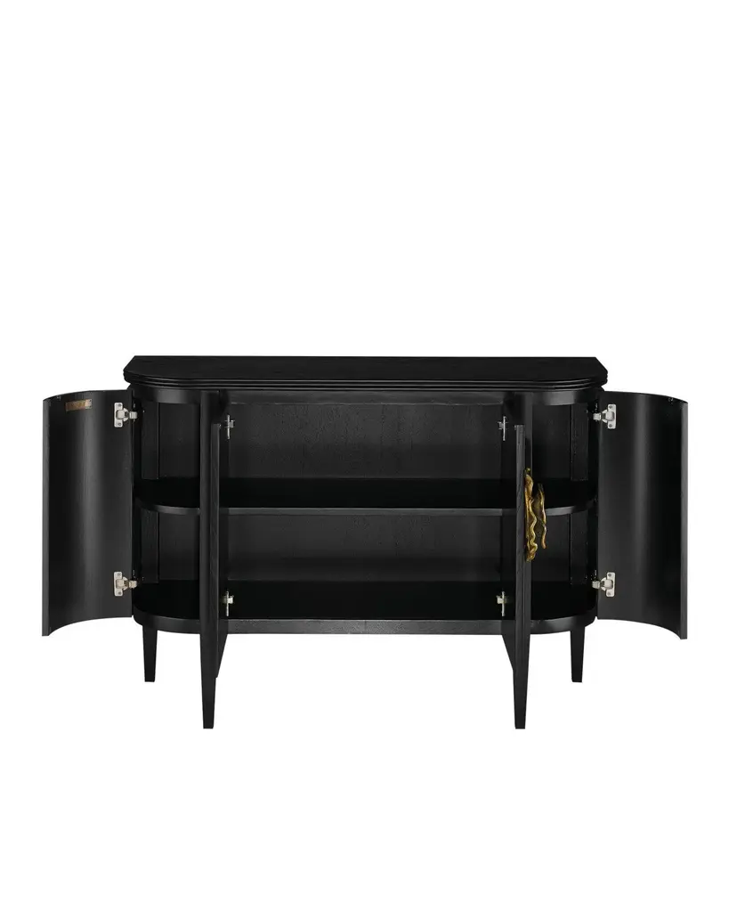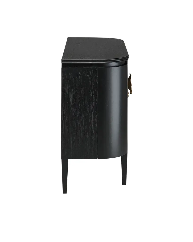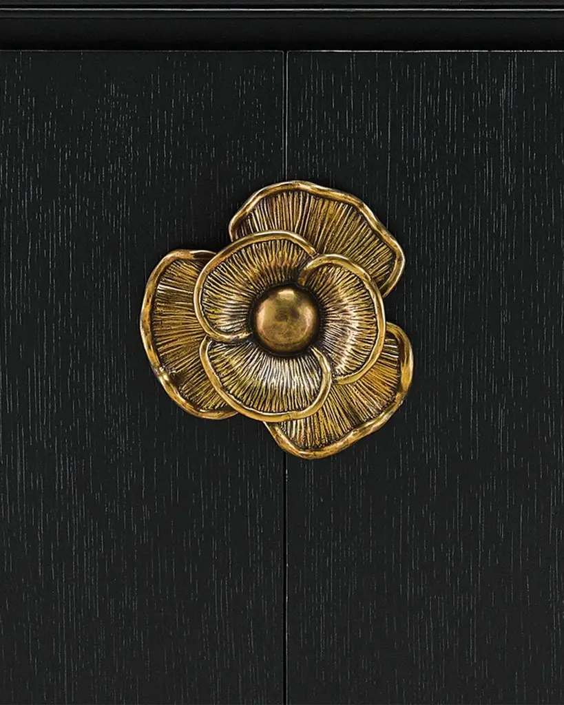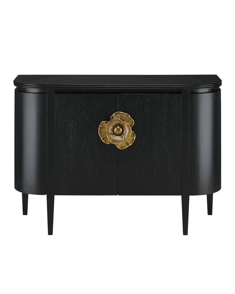 Stunning in its simplicity of lines and its artful hardware, this version of the Briallen Demi-Lune has an elegant Caviar black stained wood, and an impressively sized brass flower pull that steals the show. The stylized floral accent that serves as the pull makes this cabinet a bit of haute couture for a space. Place it in a beautifully designed boudoir, in a roomy foyer or in a lovely den and watch it transform the space! We also offer this piece in a gray/silver combination. Finish: Caviar Black/Antique Brass Materials: Wood/Solid Cast Brass Overall: 34.5"h x 48"w x 18"d Weight: 156 lb Hardware: Antique Brass Solid Cast Brass Blossom Drawer Pull Doors: 4 Hinges: Adjustable Self & European Soft Close Fixed Shelves: 2 Adjustable Shelves: 1 Floor Protection: Adjustable Glides Manufacturer: Currey and Company Complimentary shipping in the U.S.