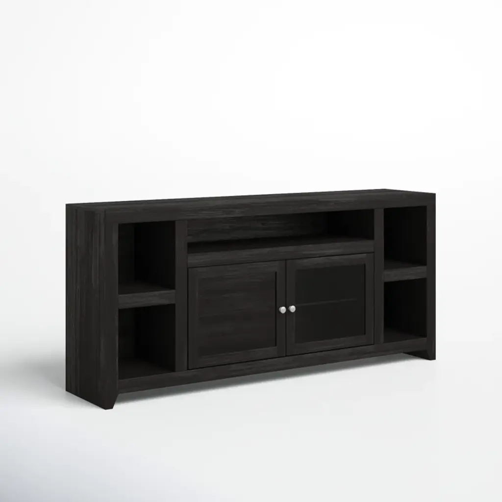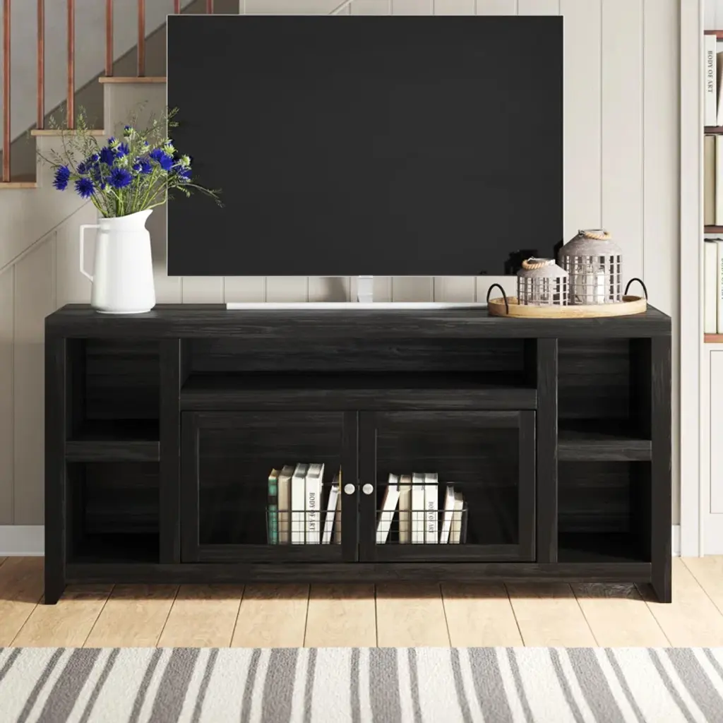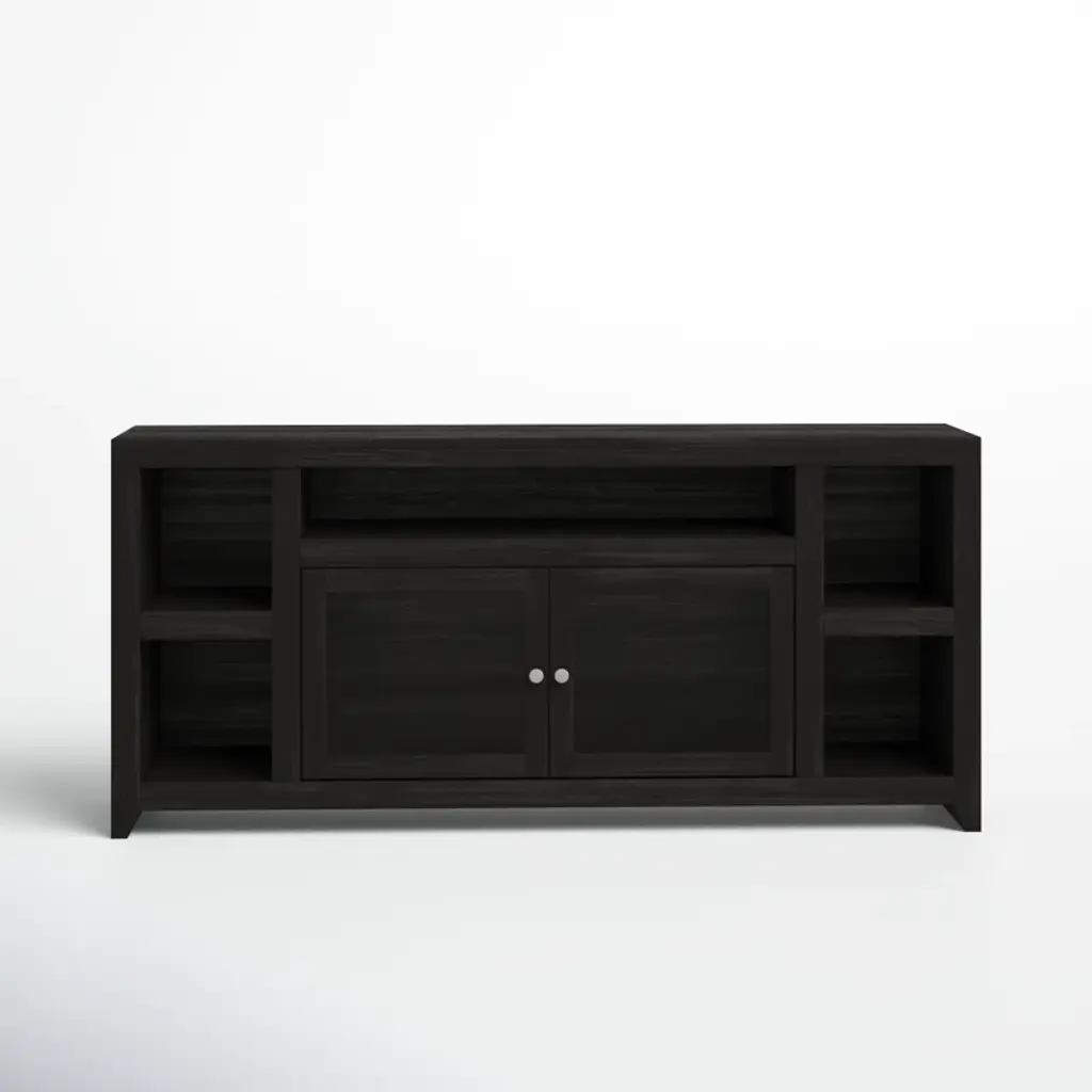 This TV stand adds storage to any living room or den while accommodating up to an 88" TV. Made in the USA, it is built from glass and solid wood with a deep dark brown finish that pairs well with any aesthetic. The exterior shelves offer a stage to display a few decorative favorites, while the two cabinets are great for tucking away table linens, dishware, and more, so they're within reach for your next holiday feast. Best of all, this media center arrives fully assembled with an included wall anchor, so all you have to do is relax.