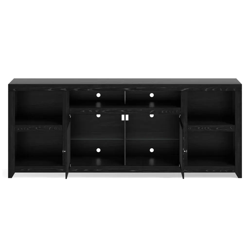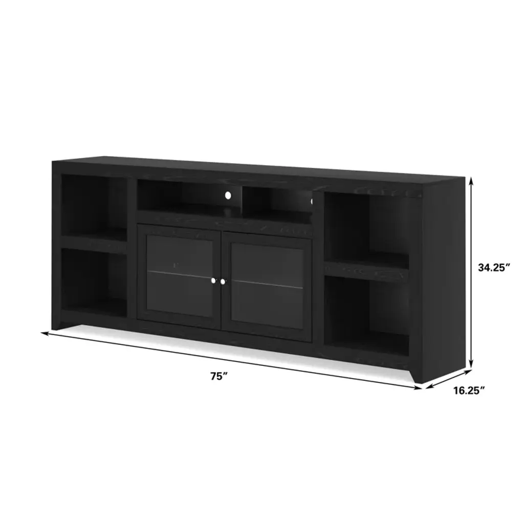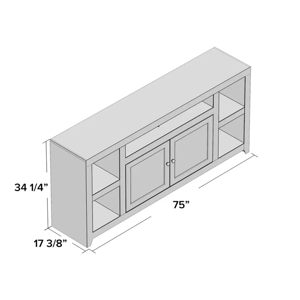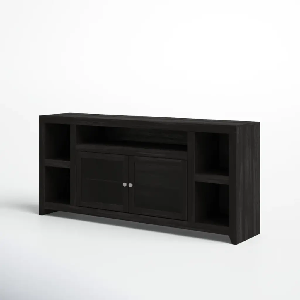 This TV stand adds storage to any living room or den while accommodating up to an 88" TV. Made in the USA, it is built from glass and solid wood with a deep dark brown finish that pairs well with any aesthetic. The exterior shelves offer a stage to display a few decorative favorites, while the two cabinets are great for tucking away table linens, dishware, and more, so they're within reach for your next holiday feast. Best of all, this media center arrives fully assembled with an included wall anchor, so all you have to do is relax.