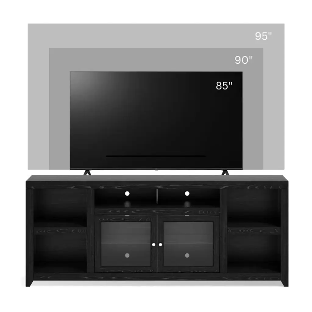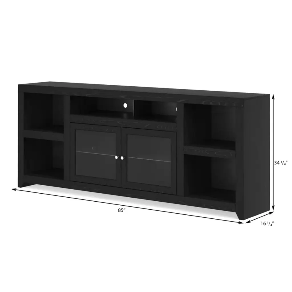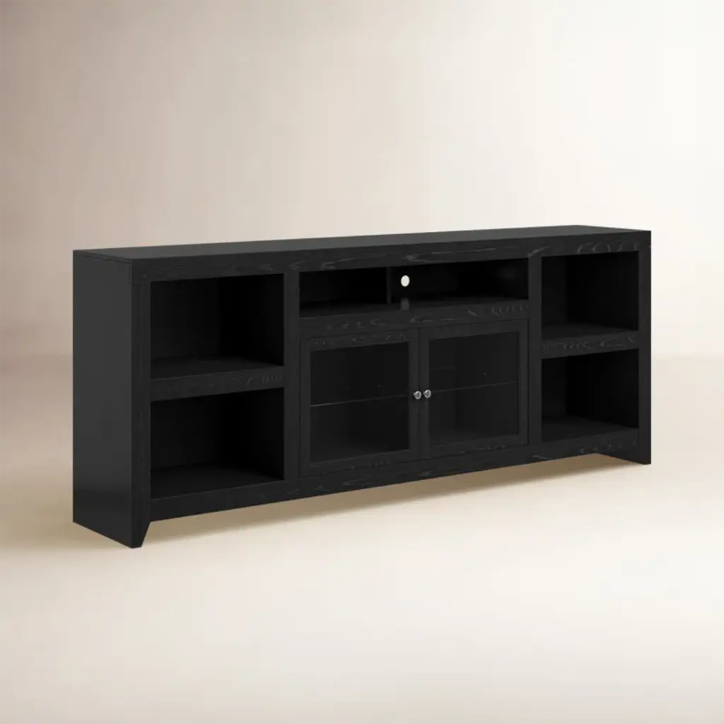 This TV stand adds storage to any living room or den while accommodating up to an 88" TV. Made in the USA, it is built from glass and solid wood with a deep dark brown finish that pairs well with any aesthetic. The exterior shelves offer a stage to display a few decorative favorites, while the two cabinets are great for tucking away table linens, dishware, and more, so they're within reach for your next holiday feast. Best of all, this media center arrives fully assembled with an included wall anchor, so all you have to do is relax.
