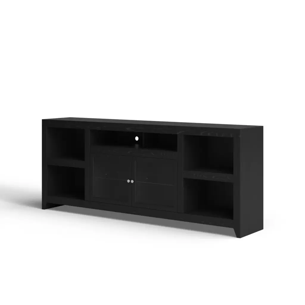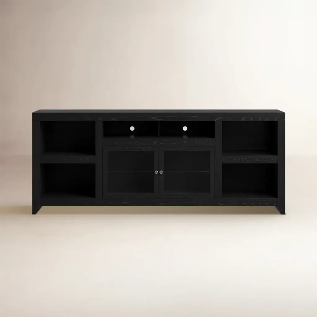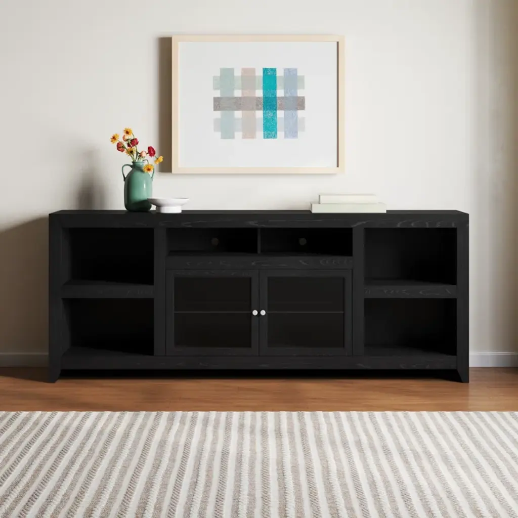 This TV stand adds storage to any living room or den while accommodating up to an 88" TV. Made in the USA, it is built from glass and solid wood with a deep dark brown finish that pairs well with any aesthetic. The exterior shelves offer a stage to display a few decorative favorites, while the two cabinets are great for tucking away table linens, dishware, and more, so they're within reach for your next holiday feast. Best of all, this media center arrives fully assembled with an included wall anchor, so all you have to do is relax.