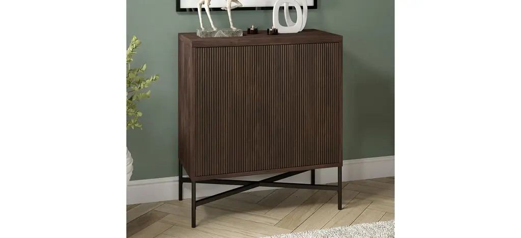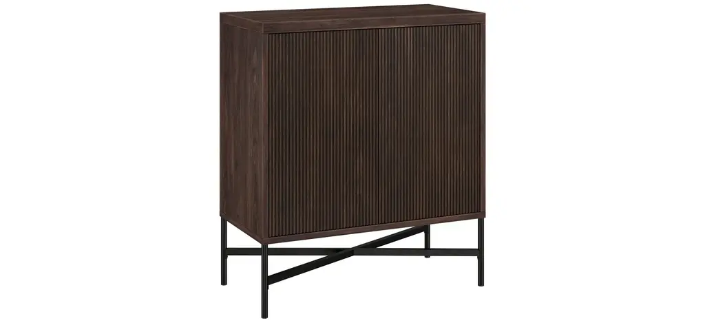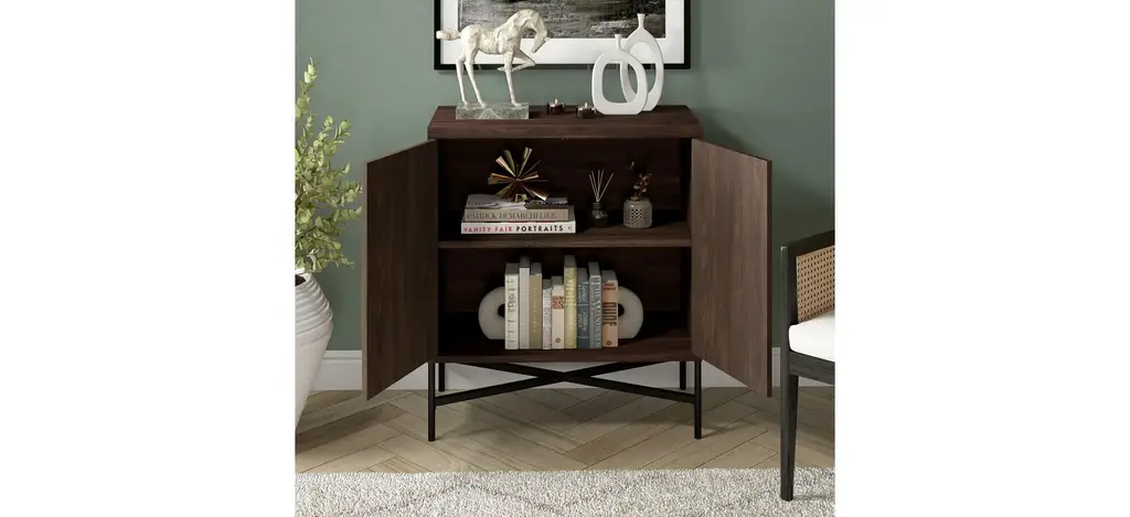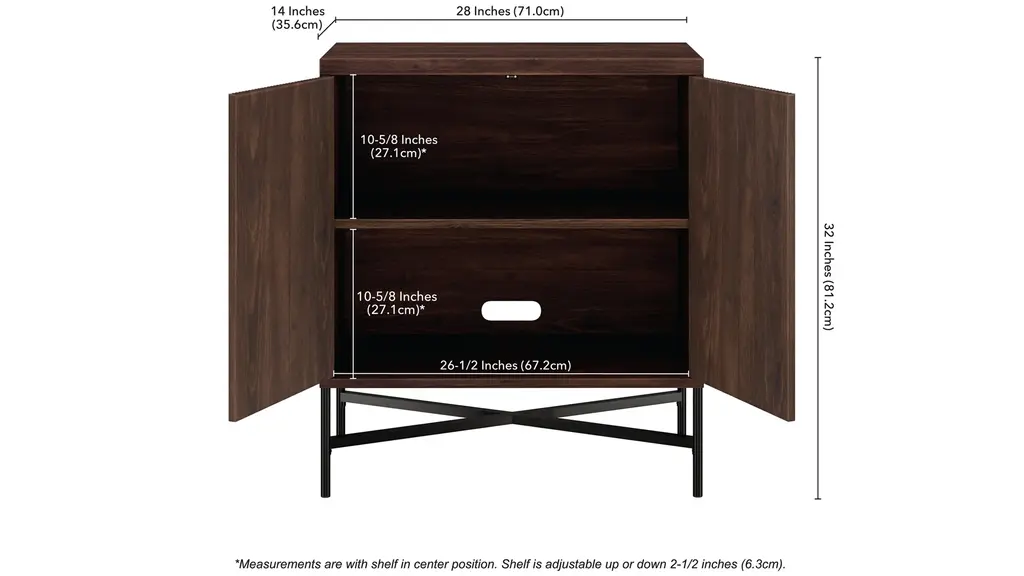 This sturdy and compact Brighton Accent Cabinet is designed to give you a flexible storage option wherever you need it, whether it's for office supplies, closet overflow, or just the various knick-knacks and doo-dads that don't have a space of their own. Featuring an adjustable center shelf and cable management cut-out, this versatile cabinet can even help you organize printers, game consoles, or charging stations. The wood-grained finish adds warmth and casual appeal while the hidden storage behind the two textured PVC doors allows you to hide away all the odds and ends that create visual clutter around your home.