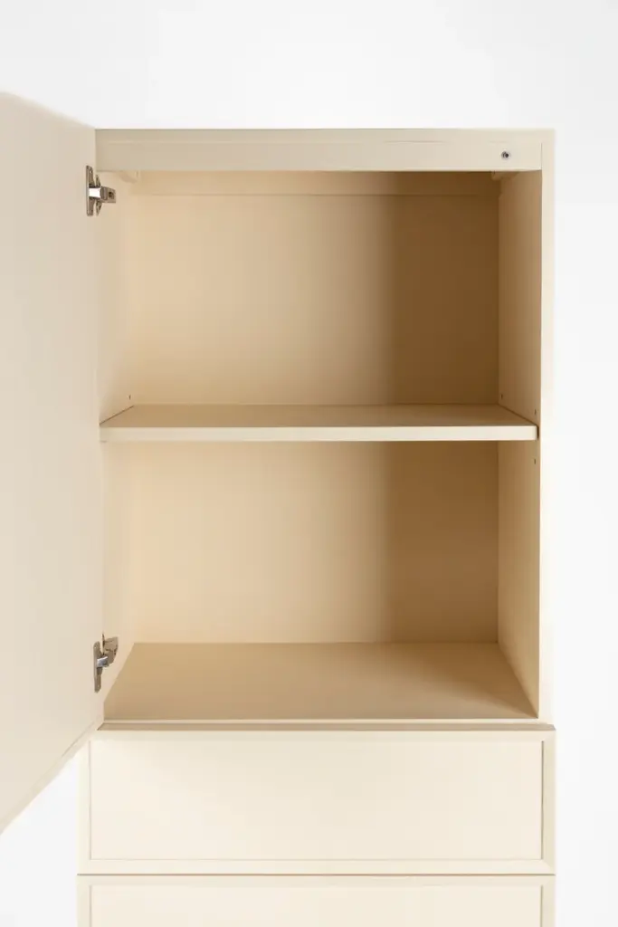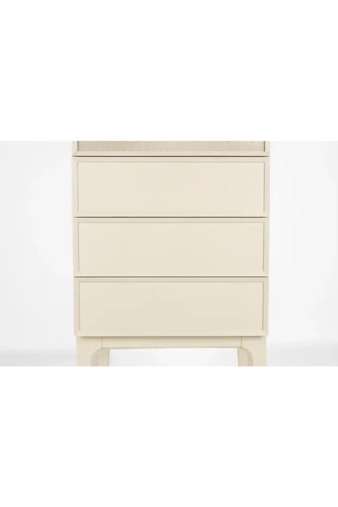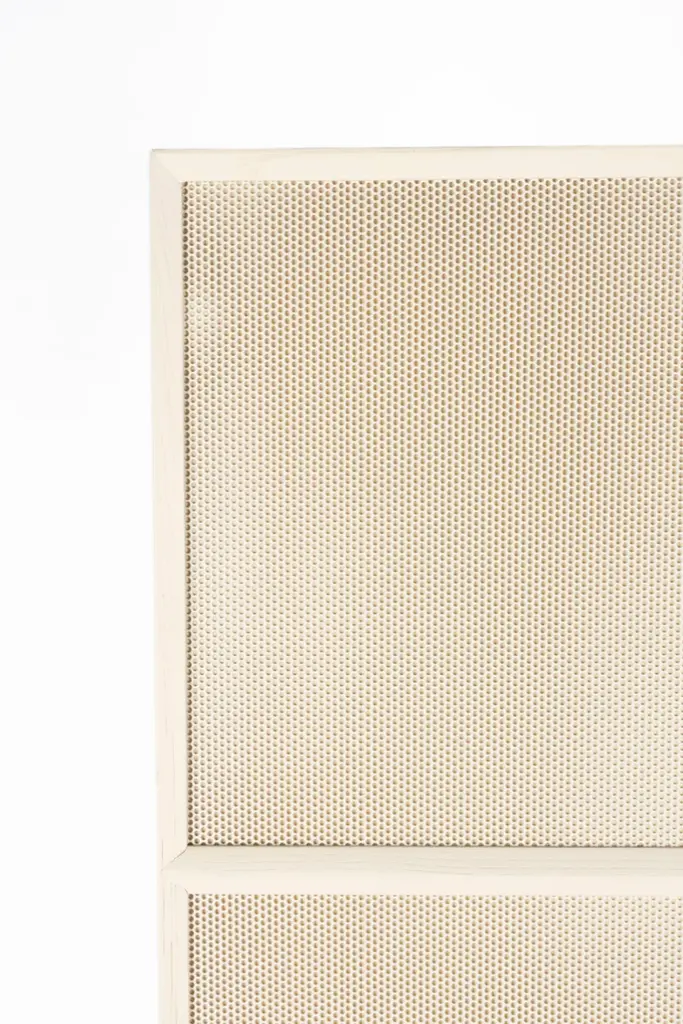 Designed with attention to detail and craftsmanship, the June cabinet features striking door paneling. Behind the beautiful front, made from metal and wooden materials, are spacious compartments that provide abundant storage space for all your essentials.