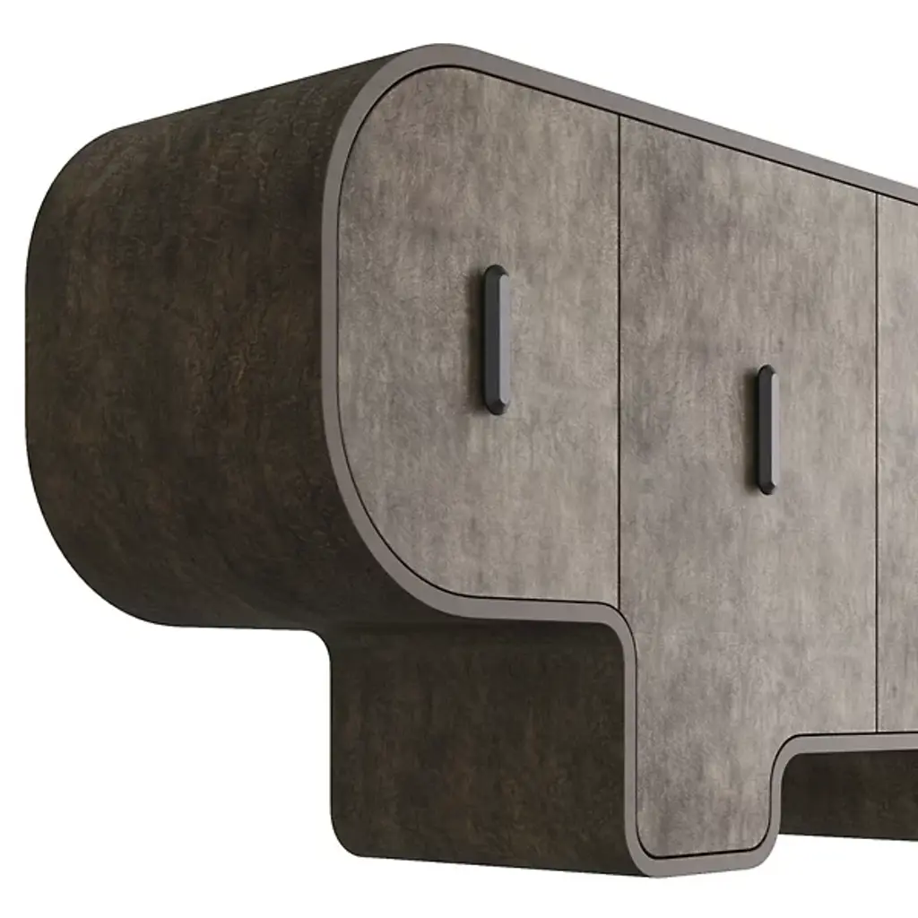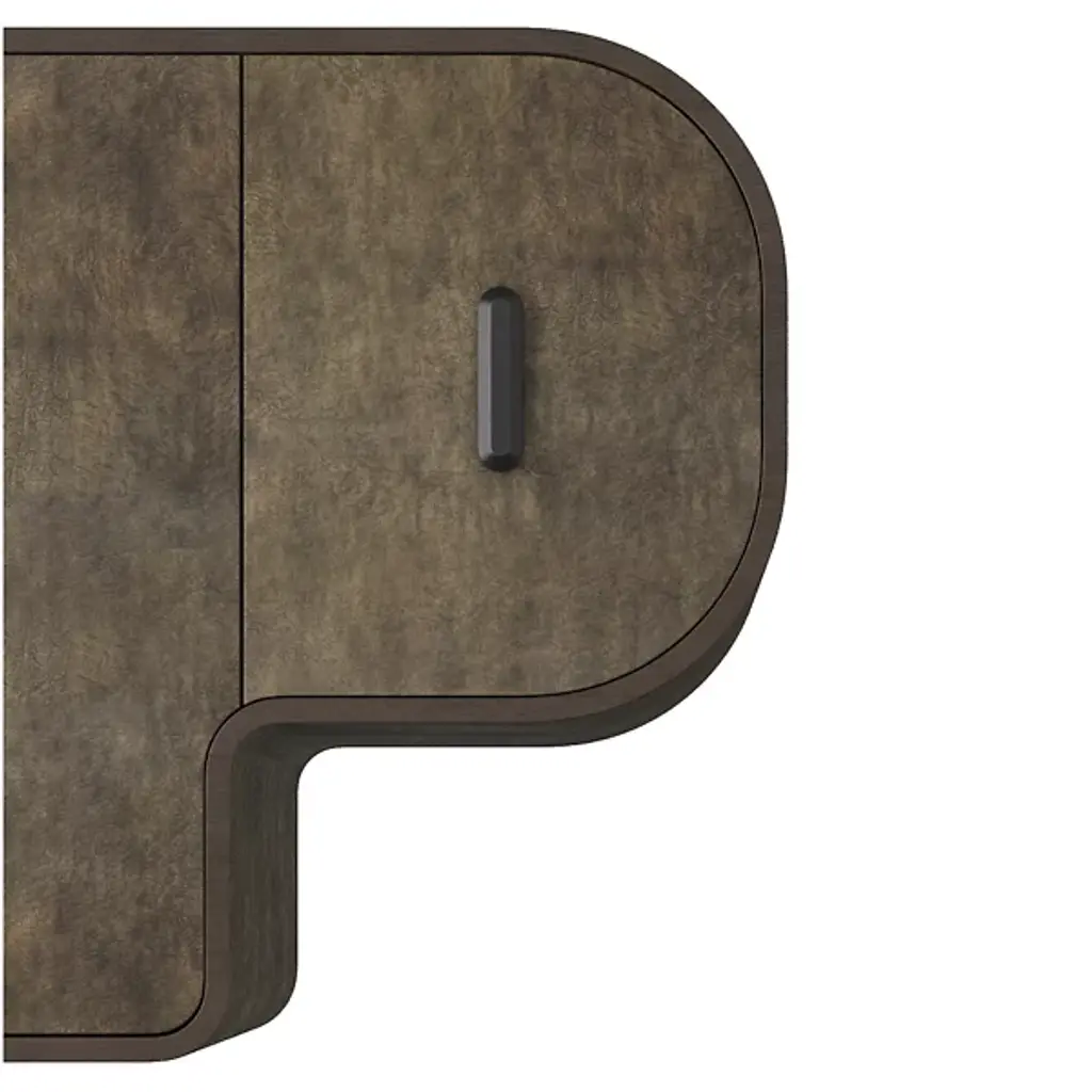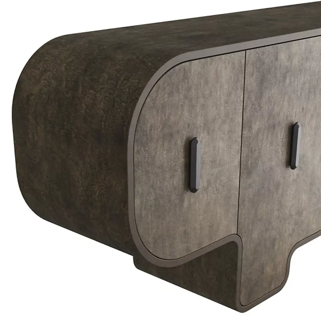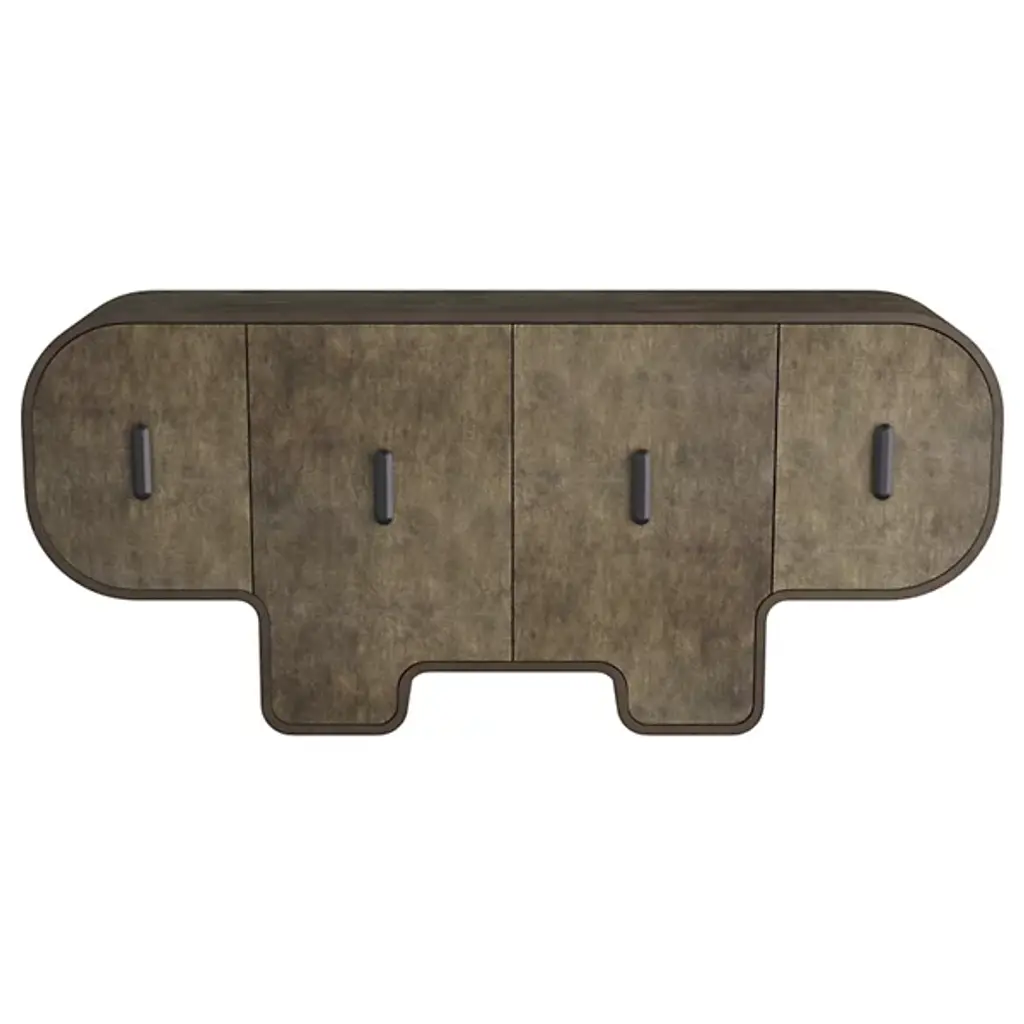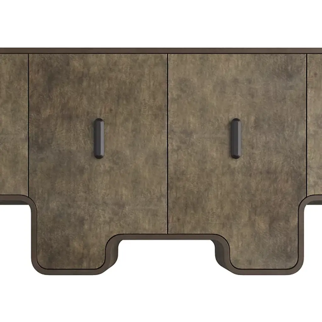Get acquainted with stately, retro-modern storage with the curving and inspired design of the Bruno Credenza Cabinet from Arteriors. Surfaced by oak veneer with a tortoise burl texture, it ascends from two curving bases, curving out and over at the sides into concealed storage covered by four doors with iron pulls. The rich metal contrasts well with the wood texture around it, lending a rustic and rich appeal to its surroundings.