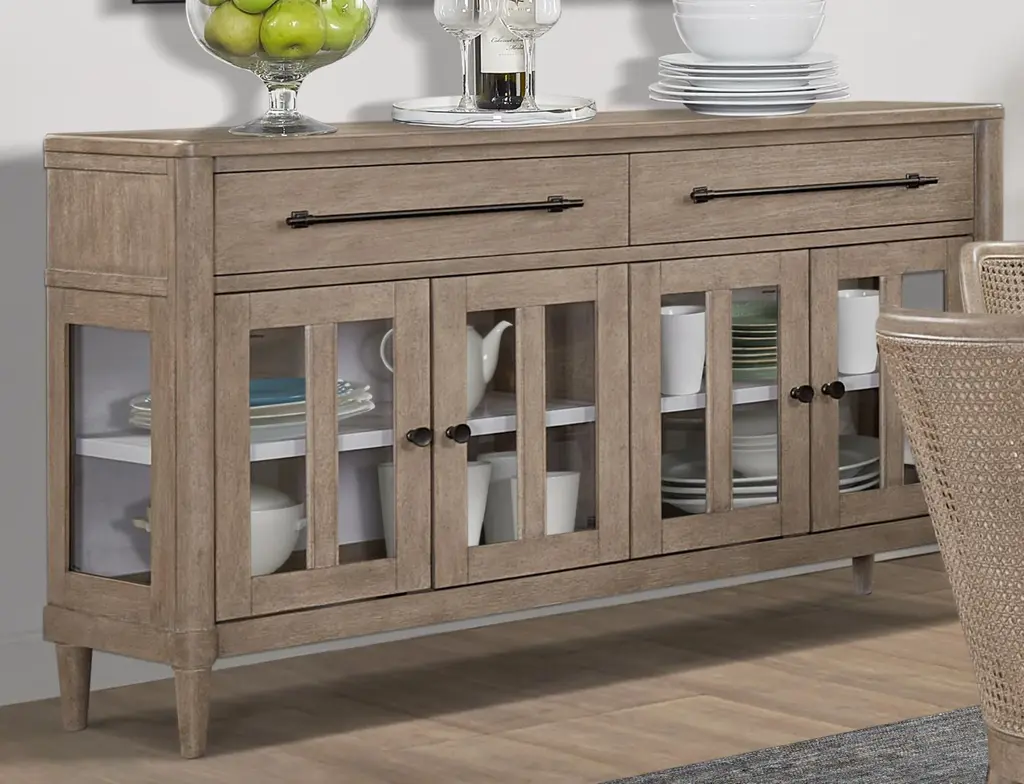 Sand Colored Finish Glass Cabinet Doors 2 Storage Drawers Power Ready Adjustable Shelf Counter Height Stools Upholstered Seat Web Seating for Comfort Set of 2