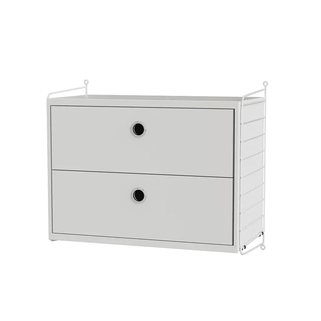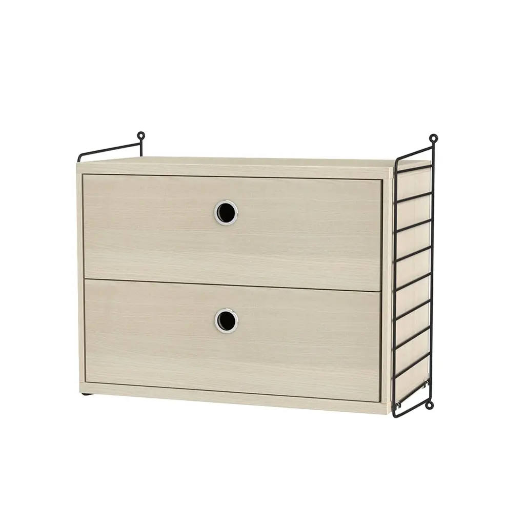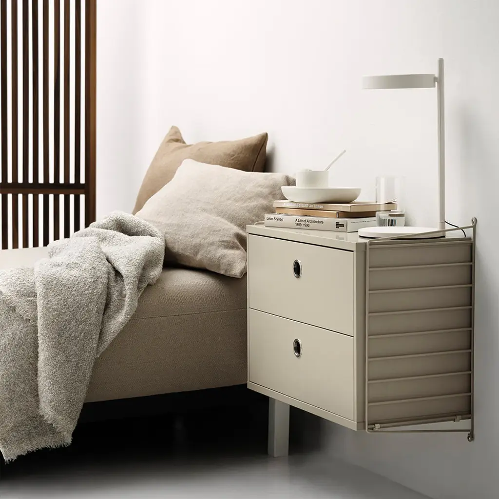 String offers the perfect space-saving bedside table with this wall-hung cabinet. With 2 deep drawers to offer plenty of storage, the unit comes in a range of attractive woodgrain and painted finishes configured with the system's signature coated-wire panels. Ever expandable as needs change via String's modular adaptability, the design classic was first introduced in 1949 by Nisse and Kajsa Strinning and is still going strong.
