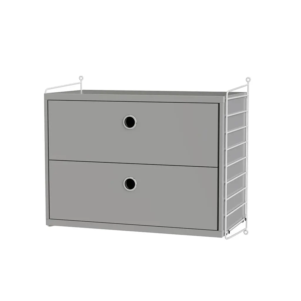 String offers the perfect space-saving bedside table with this wall-hung cabinet. With 2 deep drawers to offer plenty of storage, the unit comes in a range of attractive woodgrain and painted finishes configured with the system's signature coated-wire panels. Ever expandable as needs change via String's modular adaptability, the design classic was first introduced in 1949 by Nisse and Kajsa Strinning and is still going strong.