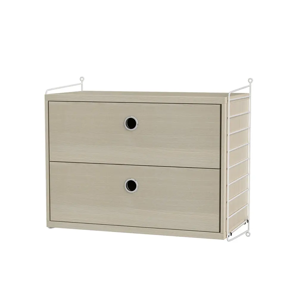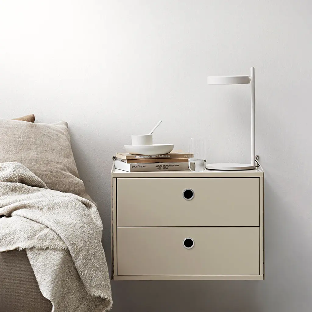 String offers the perfect space-saving bedside table with this wall-hung cabinet. With 2 deep drawers to offer plenty of storage, the unit comes in a range of attractive woodgrain and painted finishes configured with the system's signature coated-wire panels. Ever expandable as needs change via String's modular adaptability, the design classic was first introduced in 1949 by Nisse and Kajsa Strinning and is still going strong.