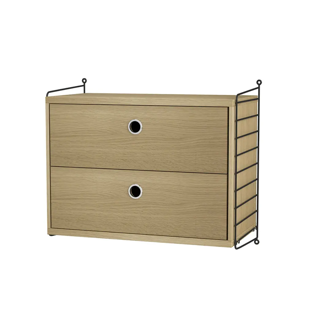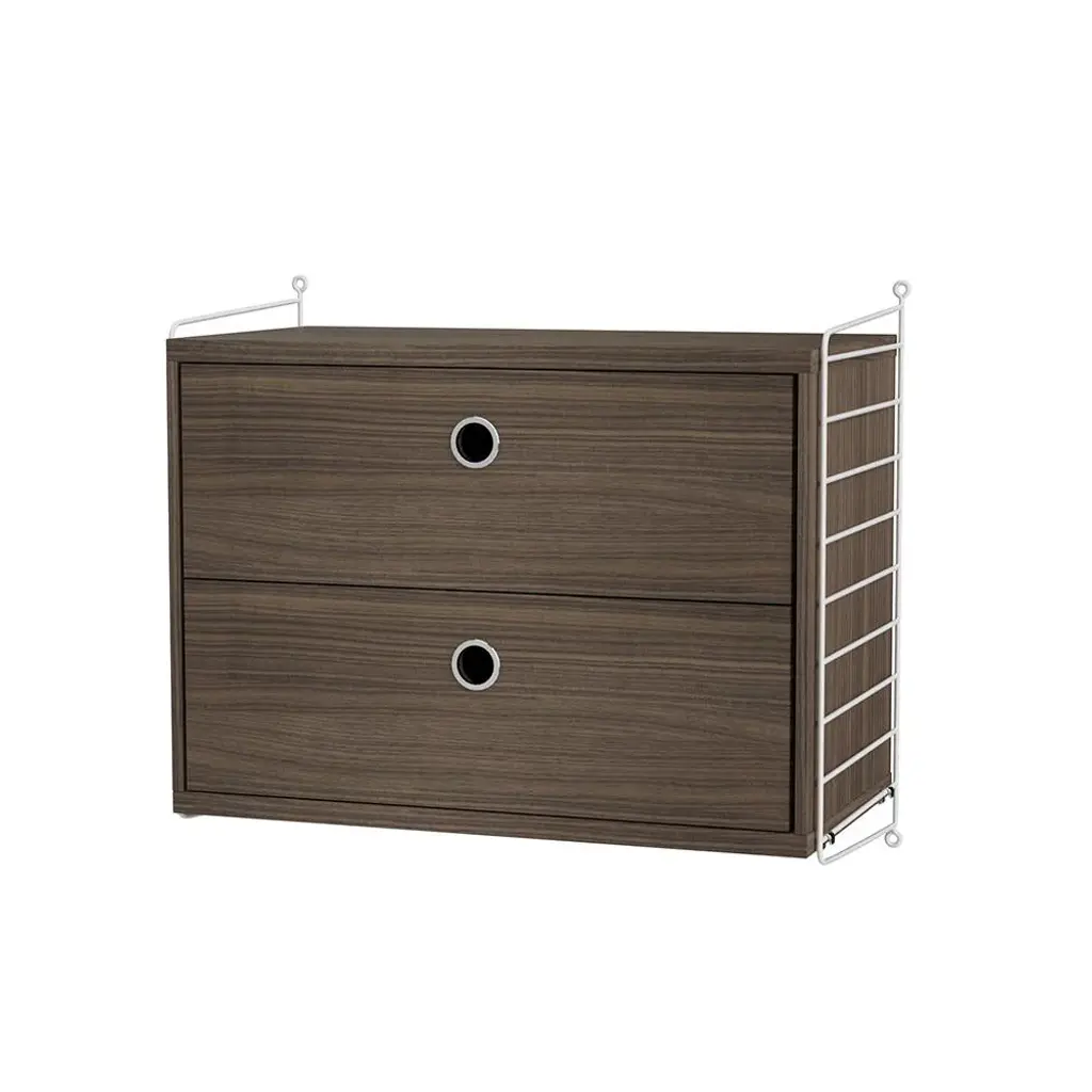 String offers the perfect space-saving bedside table with this wall-hung cabinet. With 2 deep drawers to offer plenty of storage, the unit comes in a range of attractive woodgrain and painted finishes configured with the system's signature coated-wire panels. Ever expandable as needs change via String's modular adaptability, the design classic was first introduced in 1949 by Nisse and Kajsa Strinning and is still going strong.