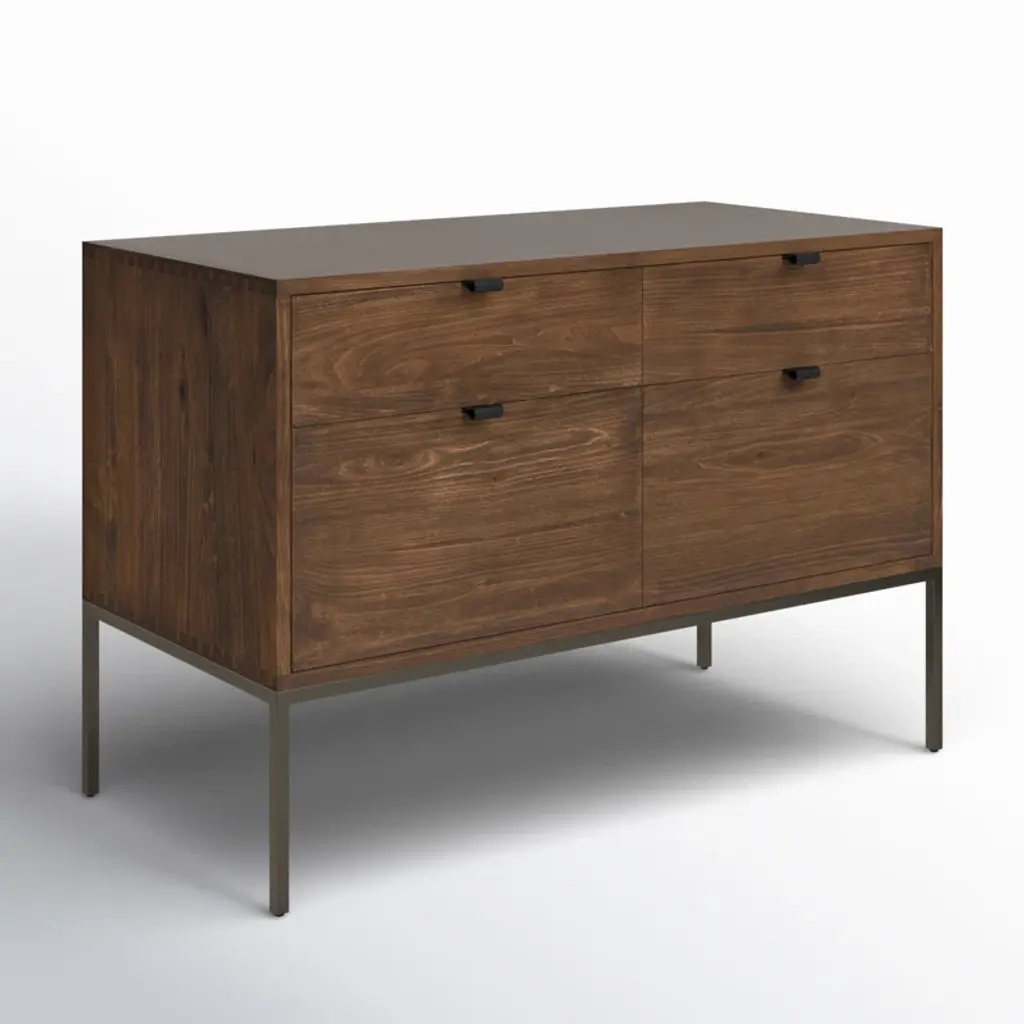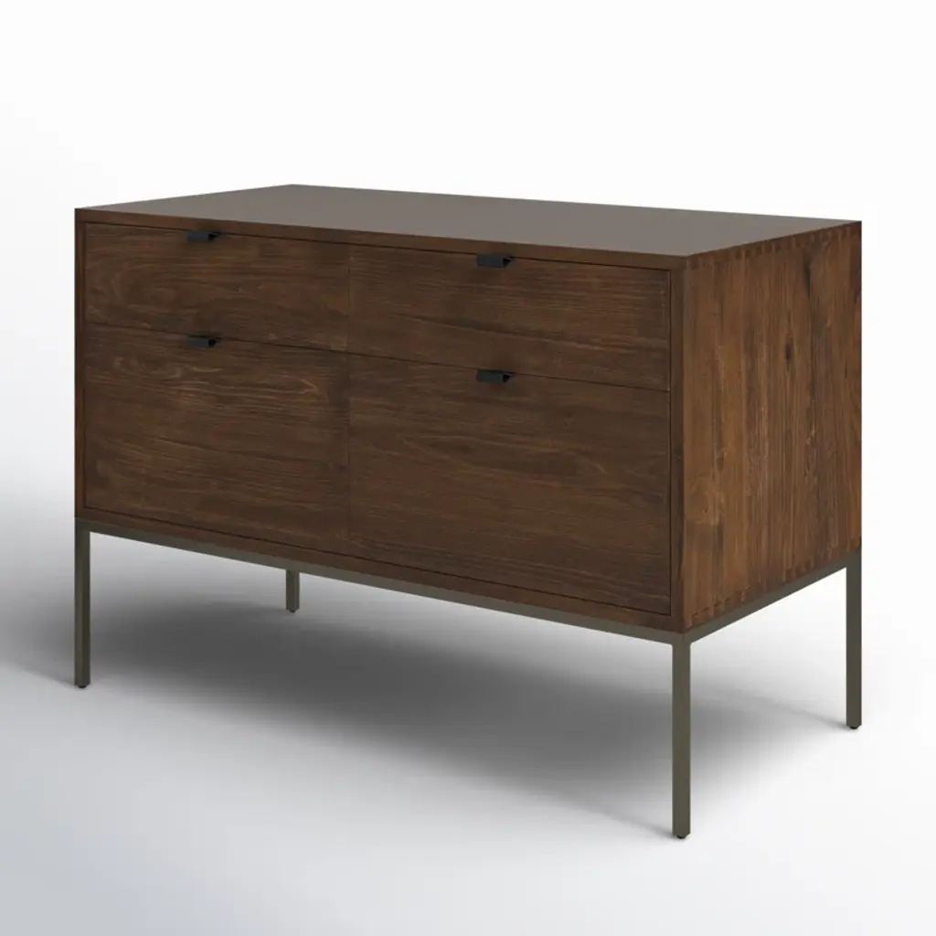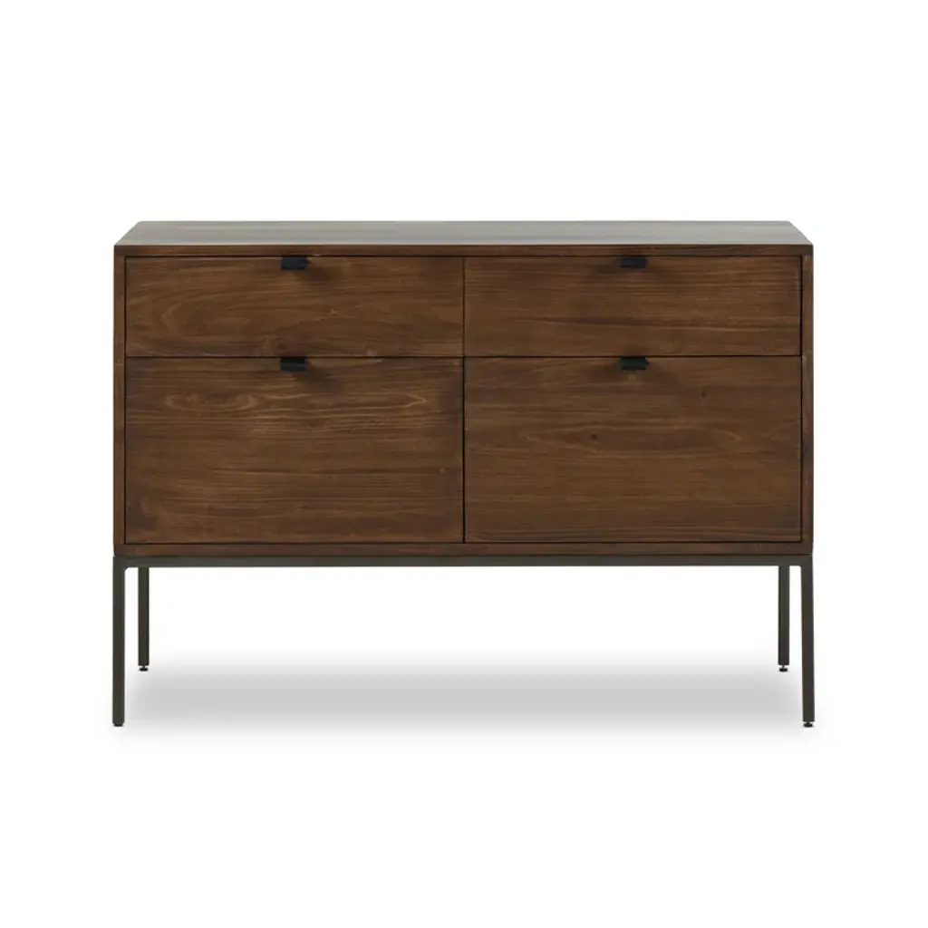 With a soft modern and casual appeal, the Burnham Lateral File is crafted of Alder Veneers with knots in a Grey Mink finish accented by dark bronze knob hardware. This functional and versatile piece offers two locking file drawers with a Pendaflex filing system and locks on the front of the drawers. The drawers are on metal ball-bearing full-extension slides. The Work Your Way program focuses on the new reality many consumers face as they continue to do much of their work from their homes. Available in five design styles, the program offers an assortment of key home office pieces for a variety of spaces Ð whether a dedicated executive home office or a more casual workstation. Ranging in scale and functionality, all of the groups within Work Your Way include an executive desk, a junior executive desk, a writing table, a lateral file, a credenza and hutch, and a bookcase.