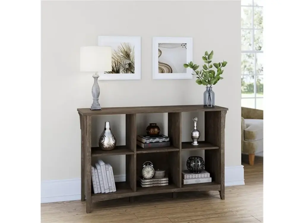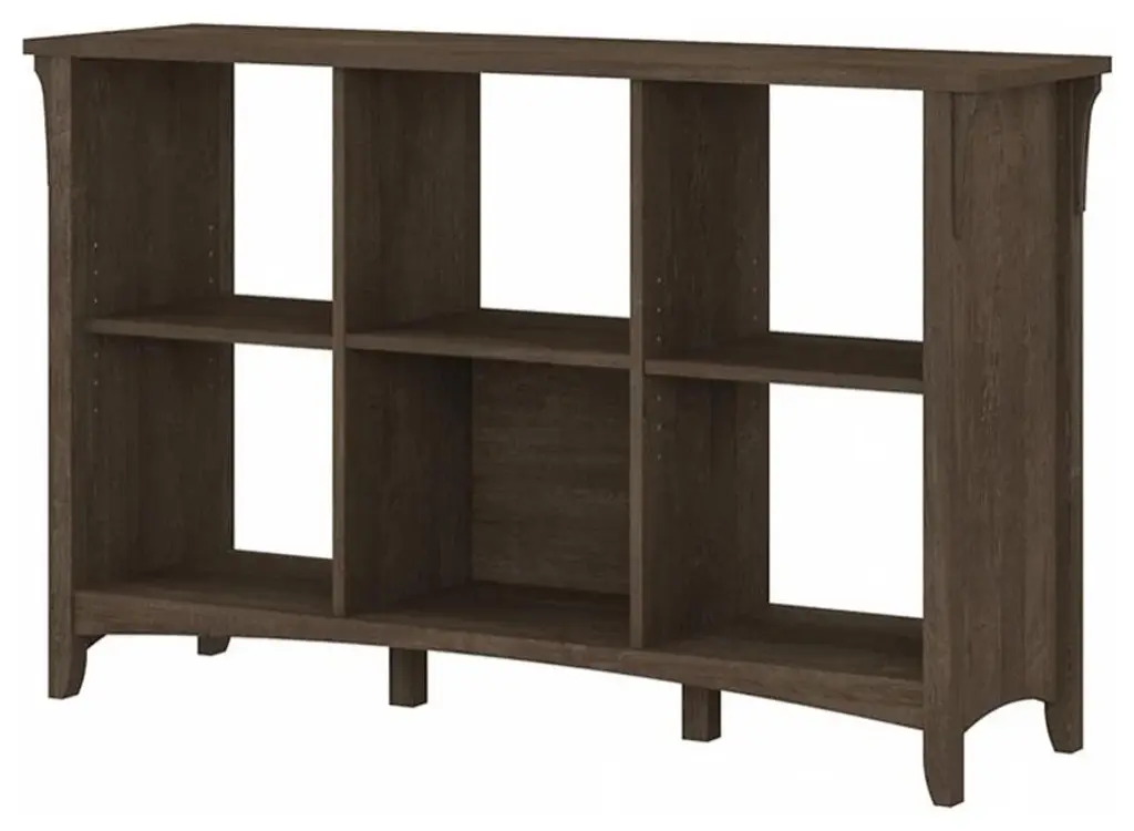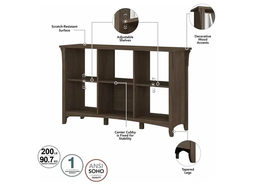 An organized home has never felt so right. Choose the Bush Furniture Salinas 6 Cube Organizer for serious storage space in a laid-back bookshelf. Decorate your family home, cottage, apartment or dorm room with a casual cube bookcase that features attractive wood accents, tapered legs and curved base rails inspired by timeless Mission styling. Six cubby shelves are perfect for organizing home office supplies or brightening up any room with pictures and decorations. Two adjustable shelves offer flexible storage to accommodate items of various sizes. Each shelf supports up to 30 pounds, so storing a small collection of books or displaying larger decorations is no problem. This 6 Cube Bookcase is tested to meet ANSI/SOHO quality standards for safety and performance and is backed by a 1 Year Manufacturer's Warranty. Complete your space with coordinating items from the Salinas Collection.Features:48W x 14D x 30H Cube Organizer has six cubby spaces to store home and office supplies or display decorative accentsOne fixed shelf and two adjustable shelves offer flexible storageTapered legs, curved base rails and decorative wood accents inspired by timeless Mission style6 Cube Bookcase's attractive and functional design is perfect for use in a living room or home officeDistressed finish options include a cream colored Antique White, Pure White with Shiplap Gray, Cape Cod Gray, Vintage Black, Ash Brown, Reclaimed Pine and Driftwood GrayBookshelf matches height of L Shaped Desk with Storage (sold separately) for a coordinated lookTested to meet ANSI/SOHO quality standards for safety and performanceBacked by the Bush Furniture 1 Year Manufacturer's WarrantyComplete your work or living space with a coordinating Desk, Office Chair, File Cabinet, Storage Cabinet and more (sold separately)Material: Engineered WoodSpecifications:Product Dimensions: 6 Cube Storage: 47.72"W x 13.78"D x 29.96"HProduct Weight: 56.05 lbs