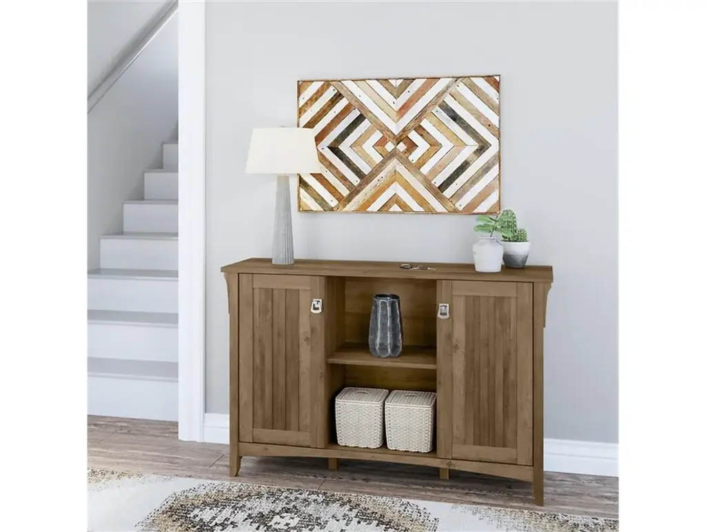 Complement the casual feel of your home with a storage solution designed for your convenience and comfort. The Bush Furniture Salinas Accent Storage Cabinet with Doors blends unique details and adjustable features for use in a variety of spaces. Complete your home office, hallway, entryway or living room with a casual two-door Cabinet featuring open and concealed storage. Place your favorite pictures, plants or a lamp on the spacious top while showing off additional decorations in the open cubby shelves below. Inspired by timeless Mission style, doors with vertical wood accents and elegant Tumbled Pewter hardware conceal any items you don't want out in the open. The Storage Cabinet contains two adjustable shelves, one behind each door. The Storage Cabinet with Doors is tested to meet ANSI/SOHO quality standards for safety and performance and is backed by a 1 Year Manufacturer's Warranty.Features:46W x 13D x 30H Storage Cabinet with Doors is ideal for use in the living room, entryway, home office and beyondConcealed storage cabinets and open cubby shelves create a variety of organization optionsAccent Cabinet contains one adjustable shelf behind each doorSurface offers space to brighten up the room with your favorite pictures and decorationsDistressed finish options include a cream colored Antique White, Pure White with Shiplap Gray, Cape Cod Gray, Vintage Black, Ash Brown, Reclaimed Pine and Driftwood GrayTapered legs, curved base rails, decorative wood details and vertical accents inspired by timeless Mission stylingNot intended for use as a TV standTested to meet ANSI/SOHO quality standards for safety and performanceBacked by a Bush Furniture 1 Year Manufacturer's WarrantyComplete your work or living space with a coordinating Desk, Office Chair, File Cabinet, Bookcase, Entryway Storage and more (sold separately)Material: Engineered WoodSpecifications:Product Dimensions: 2 Door Storage: 46.22"W x 12.76"D x 29.96"HProduct Weight: 62.7 lbs