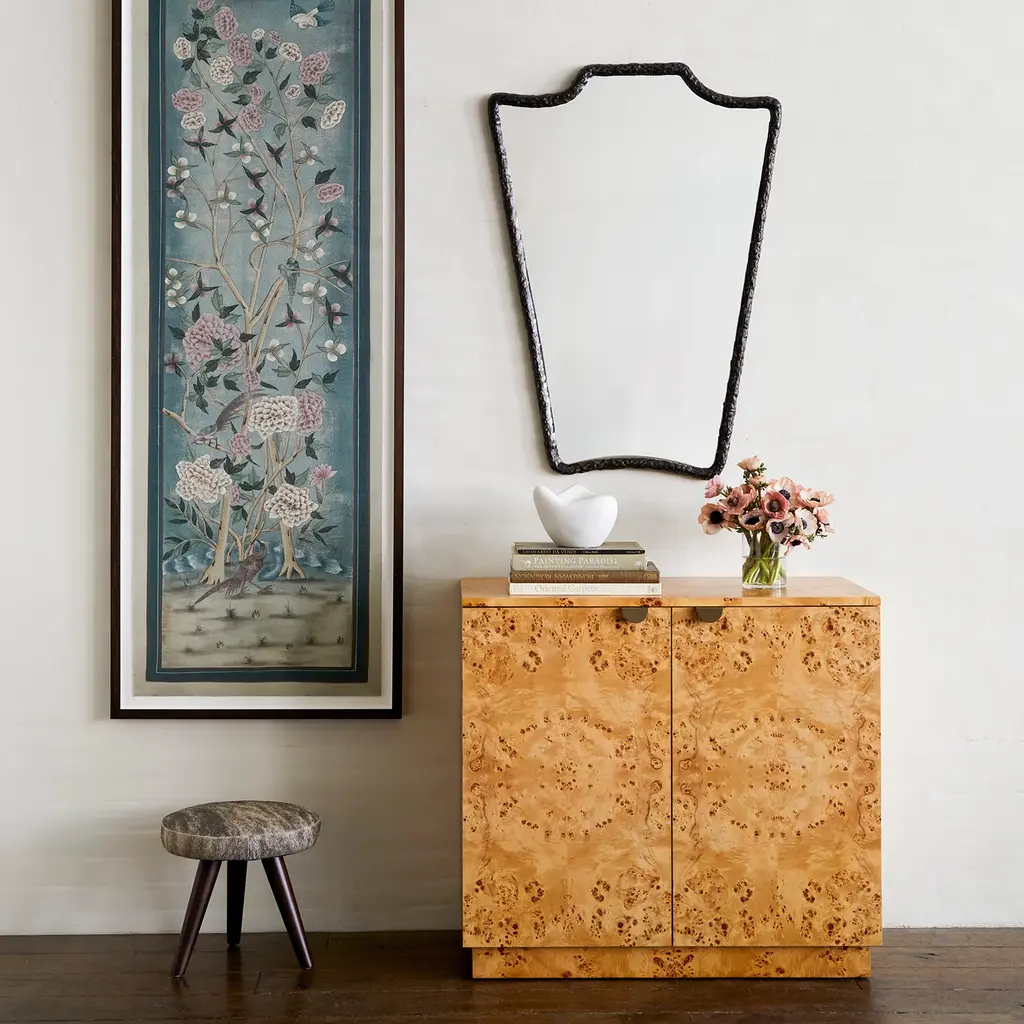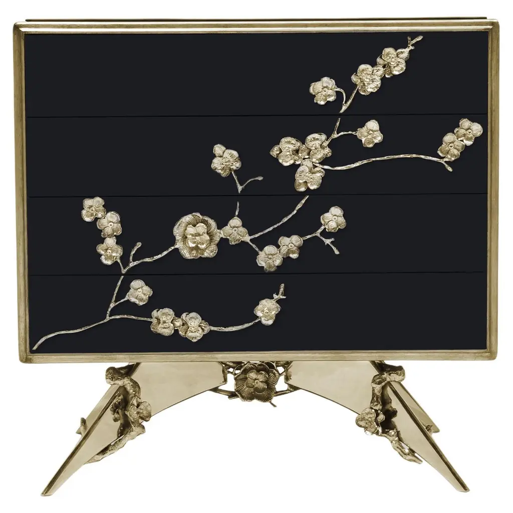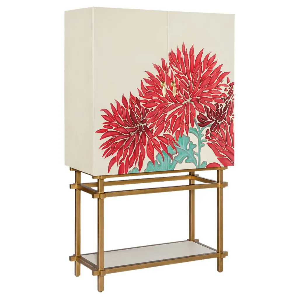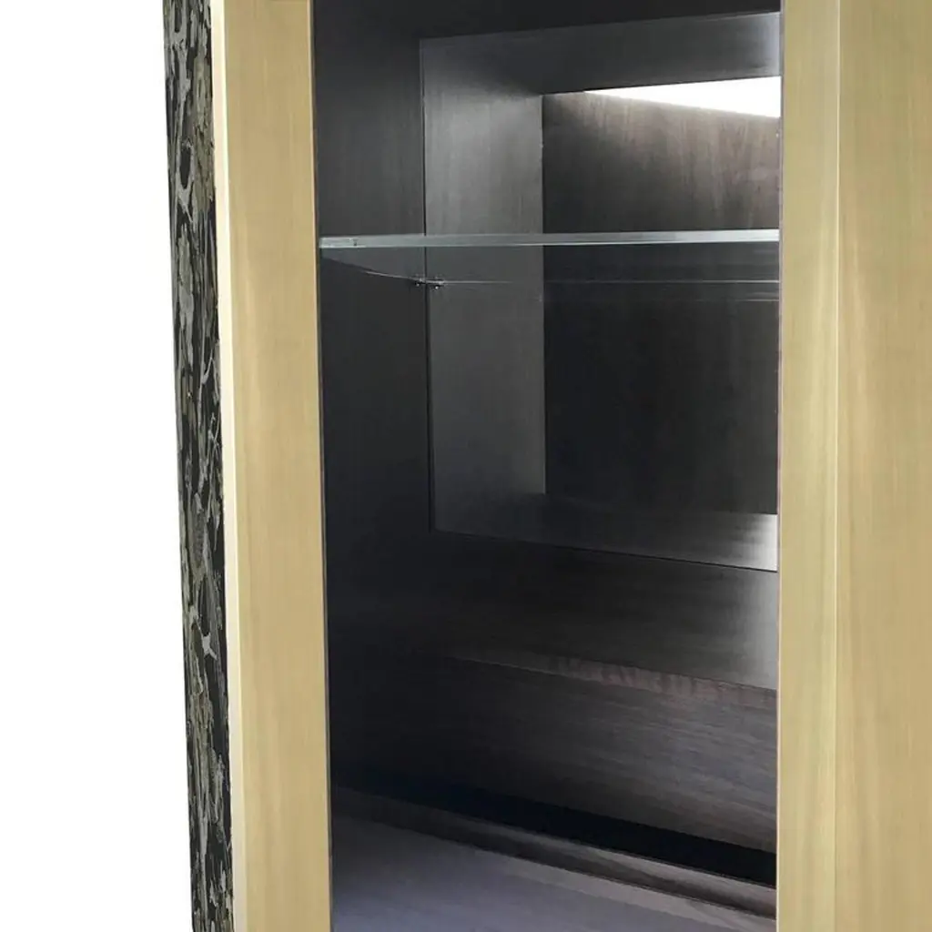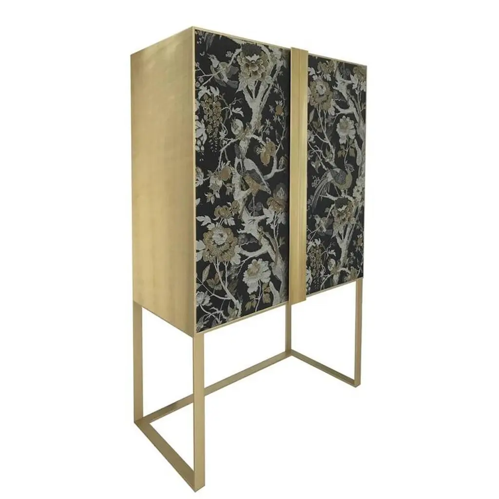 This magnificent cabinet was created to contain beverages, glasses, and table linens and it will enrich any dining room, thanks to its exquisite craftsmanship and the elegance of its contemporary design. Entirely made with artisanal methods, its structure features an open brushed brass base supporting the body with doors in wood covered with a precious silk jacquard fabric adorned with a motif of birds and branches in gold and silver, silk, and gold brown color on a black background. Inside, the cabinet features two drawers in matte walnut wood, one shelf in extra-clear glass, and a back mirror.
