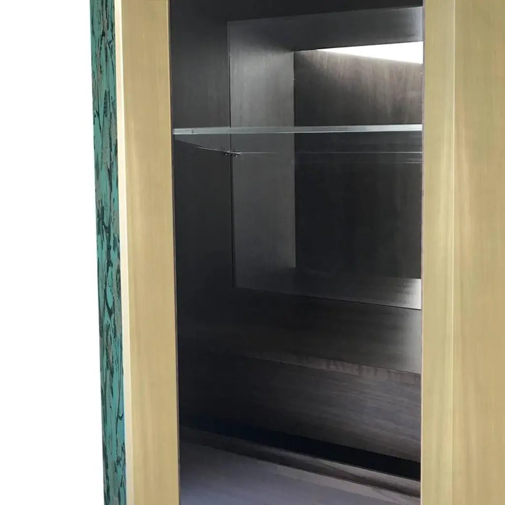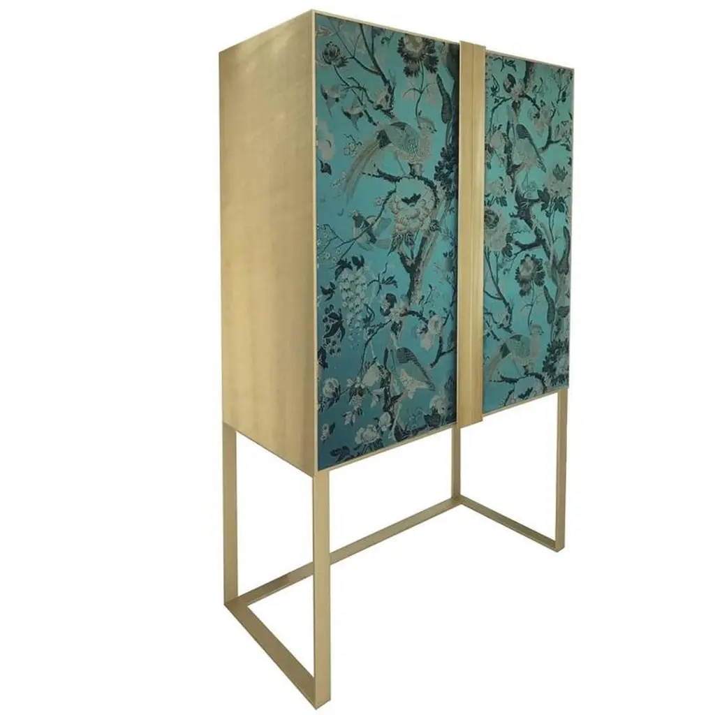This sophisticated cabinet will complement any decor, thanks to its Minimalist Silhouette and the noble materials used. Its timeless allure is given by the brushed brass structure and handles that elegantly frame the cabinet doors in wood entirely upholstered with a precious silk jacquard fabric in green adorned with a decoration of birds and branches in gold, silver, and black. The interior features two matte walnut wood drawers and one extra-clear glass shelf, plus a back mirror that enlarges the space and gives a striking reflection to the piece.